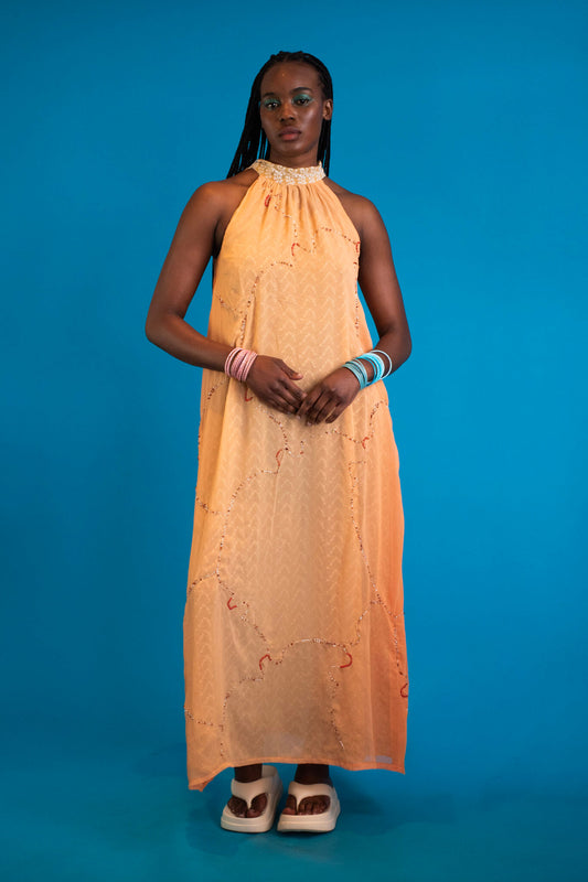 Our first capsule traces the textures of Johannesburg - its grit and gold, its contradictions and beauty. Crafted from curated saris and sewn by women in Cosmo City and Yeoville, each piece embodies becoming. Trenches, bombers, and shifts - seasonless silhouettes hand-finished with mapline embroidery and floral beading.