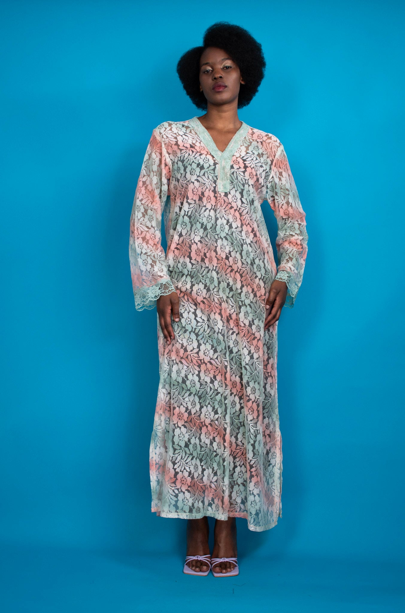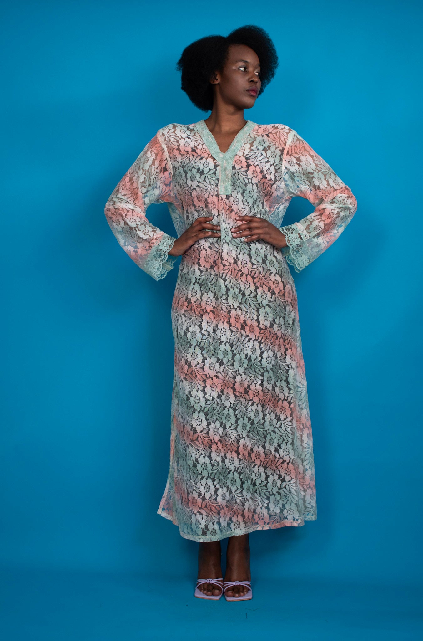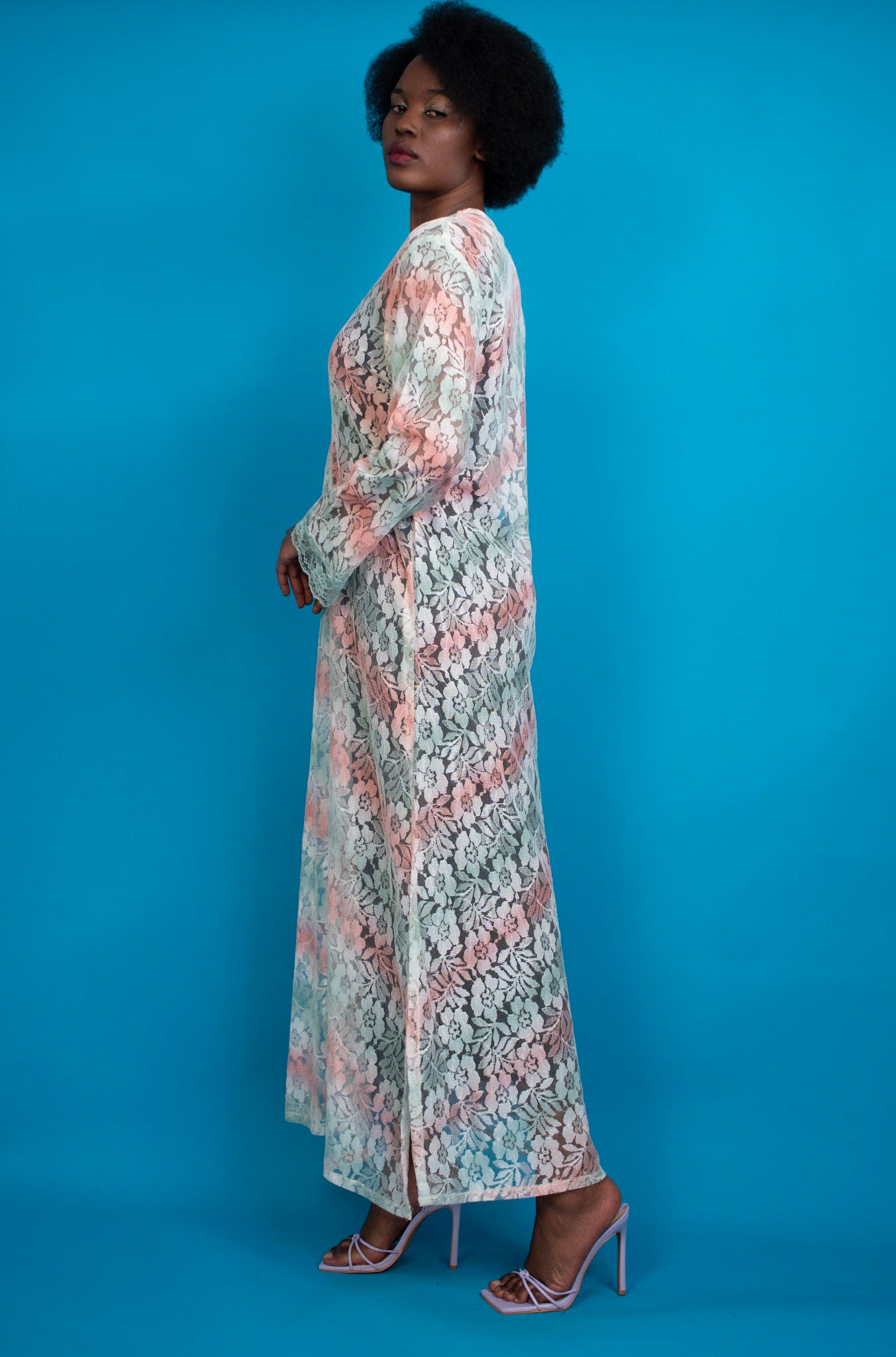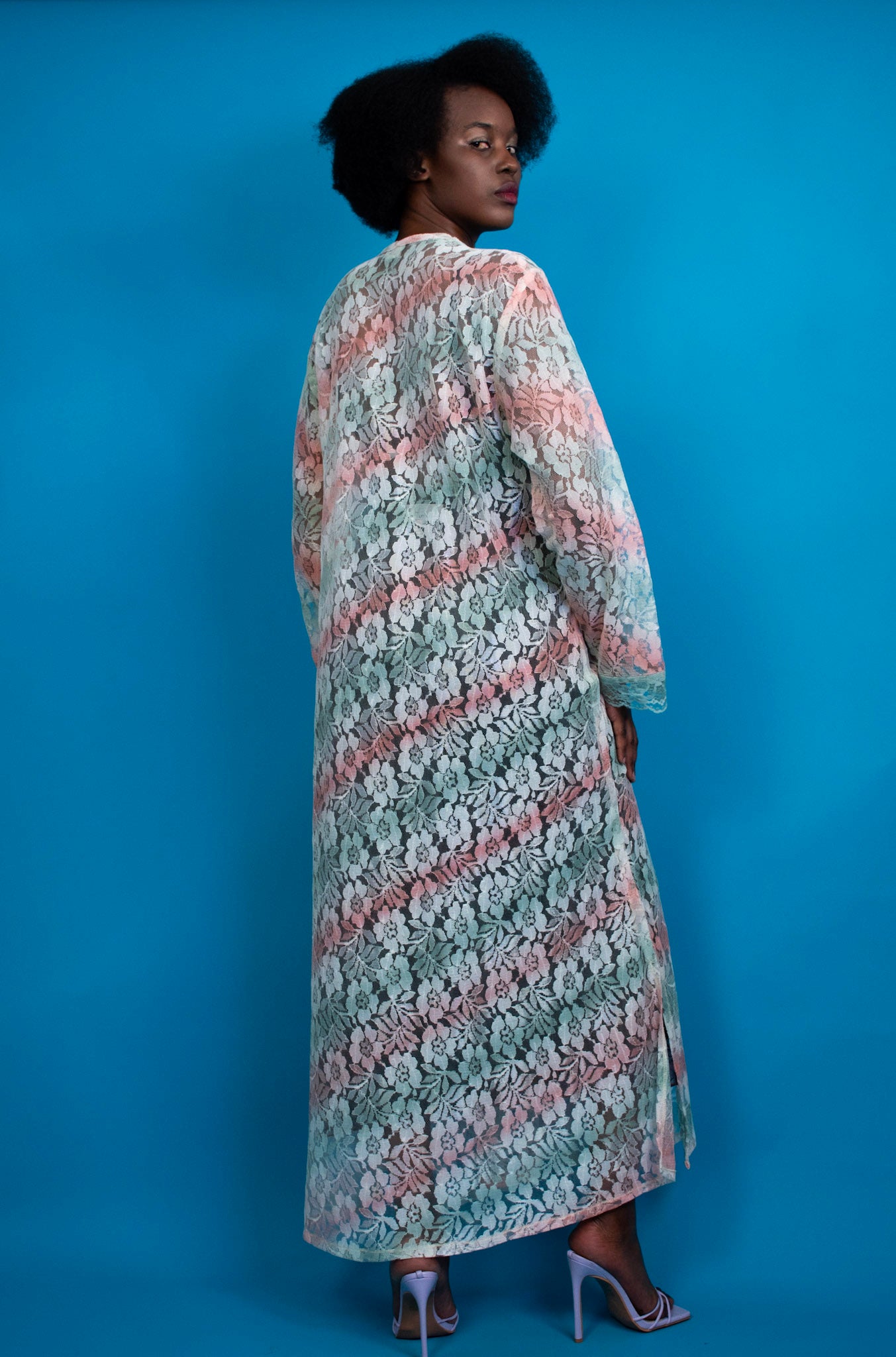A romantic full-lace kaftan crafted in soft shades of pink and baby blue, designed to drape with effortless, natural fluidity. The delicate lace falls beautifully over the body, creating an ethereal silhouette that moves gently with every step. Light, airy, and exquisitely feminine, this piece blends timeless romance with refined sophistication.