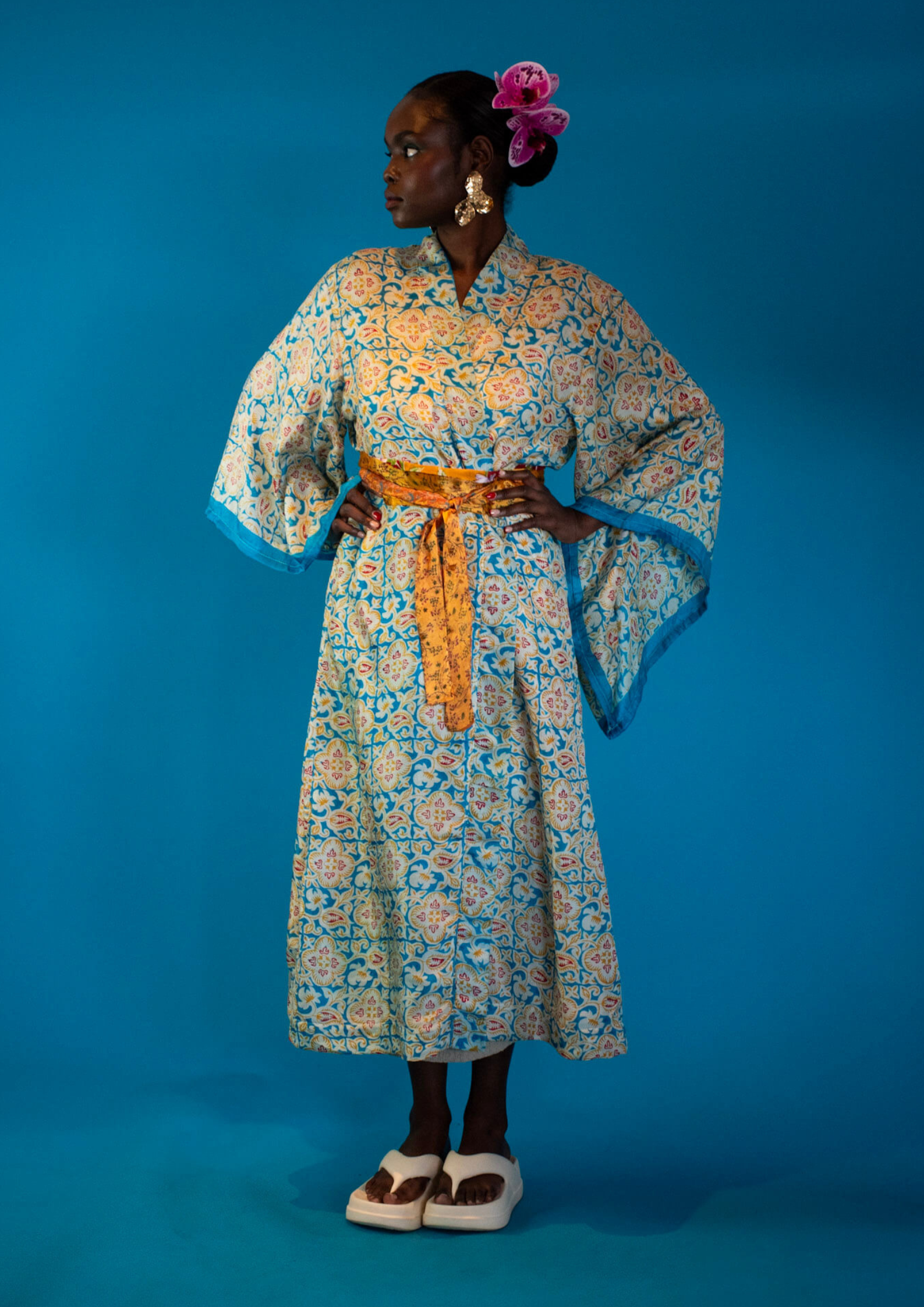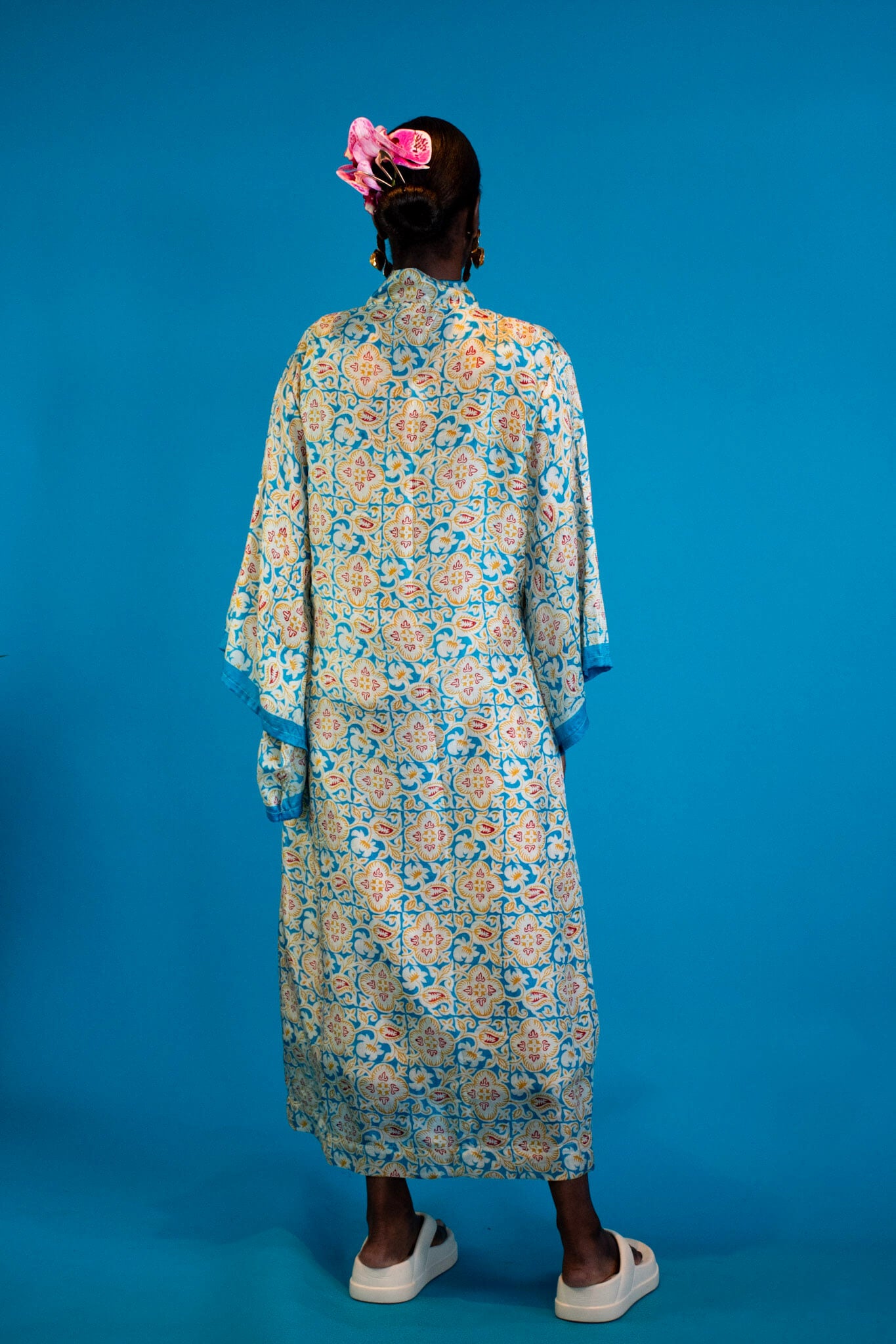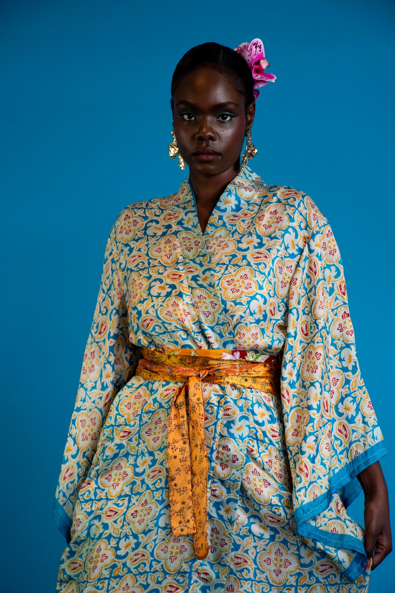 Inspired by the elegance of the Japanese kimono, this piece reimagines tradition through the lens of Indian textile artistry. In the process, floral silk saris are carefully curated - each chosen for its fine, painterly motifs that echo the quiet grace of Japanese botanical art. The result is a conversation between two art forms: the fluid expressiveness of Indian florals meeting the refined minimalism of Japanese design.
