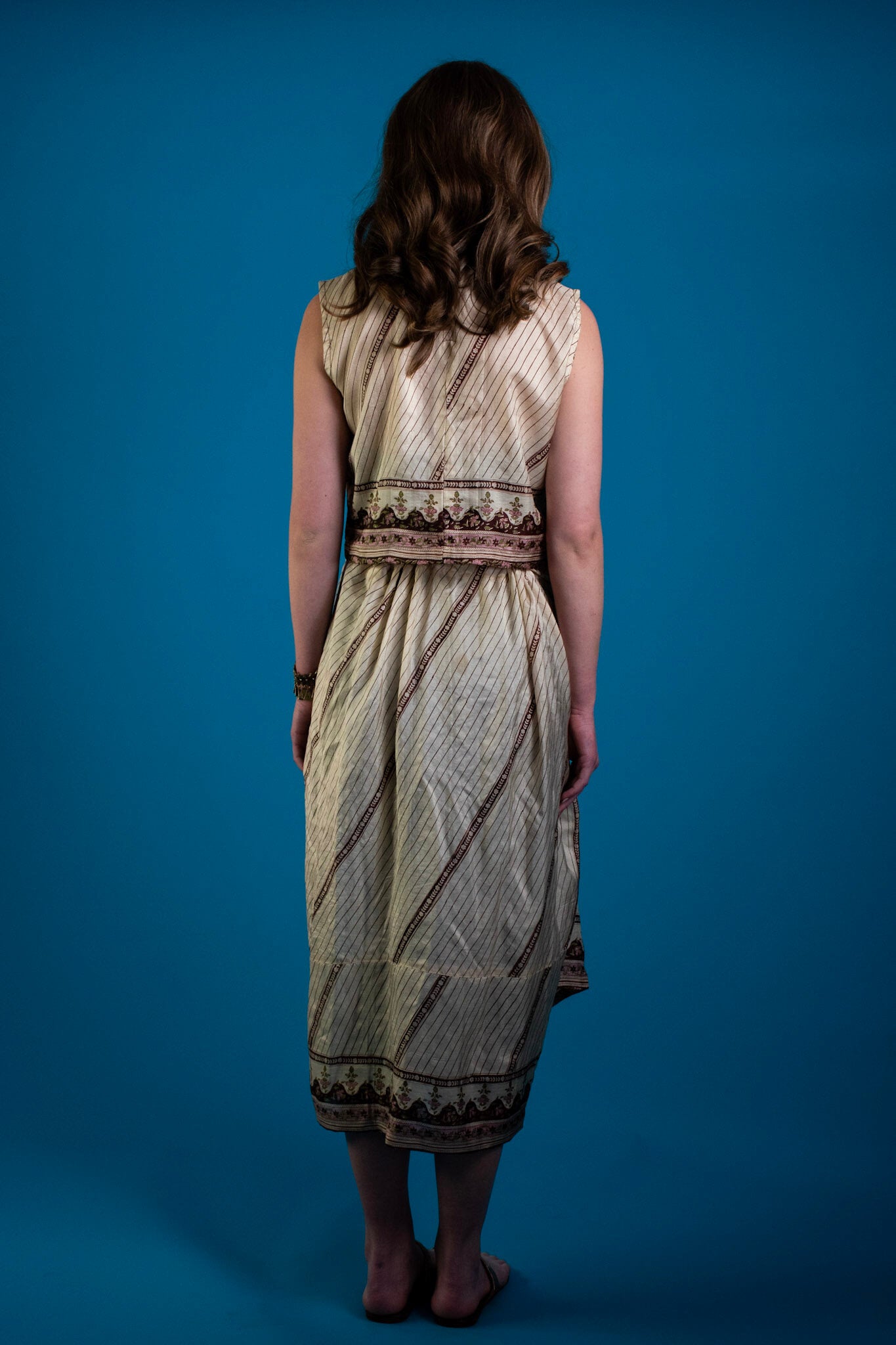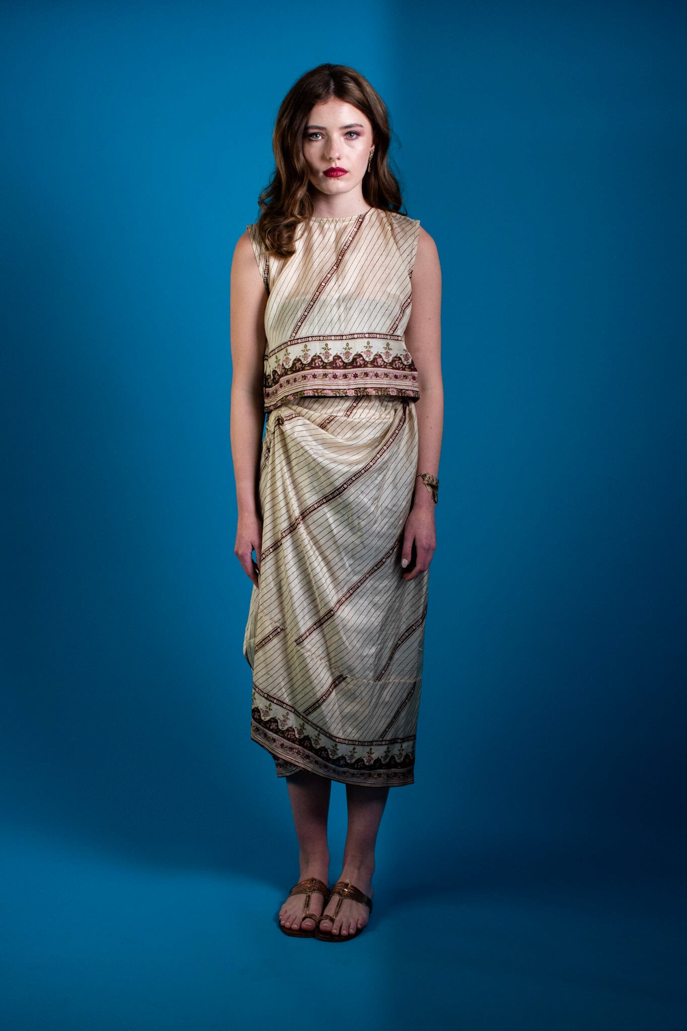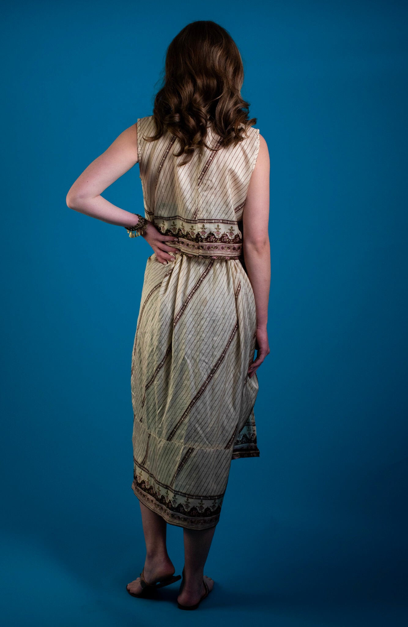 Inspired by Iman Ganijee’s grandfather and the East African khanga, this piece honours the art of wrapping - a gesture of belonging that connects cultures across oceans. Handwoven Madras silk, striped with fine gold detailing, carries a legacy of trade and transformation.