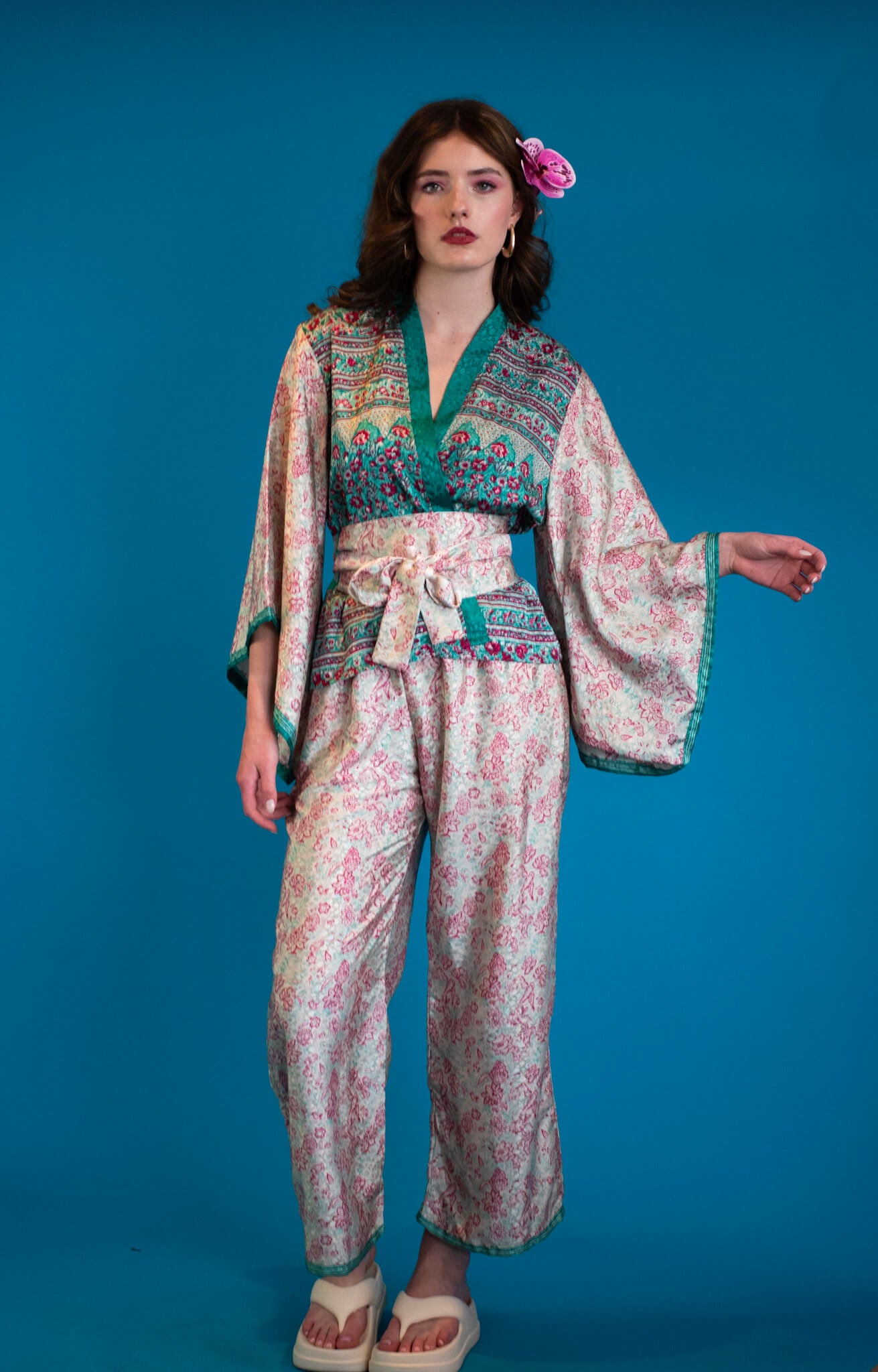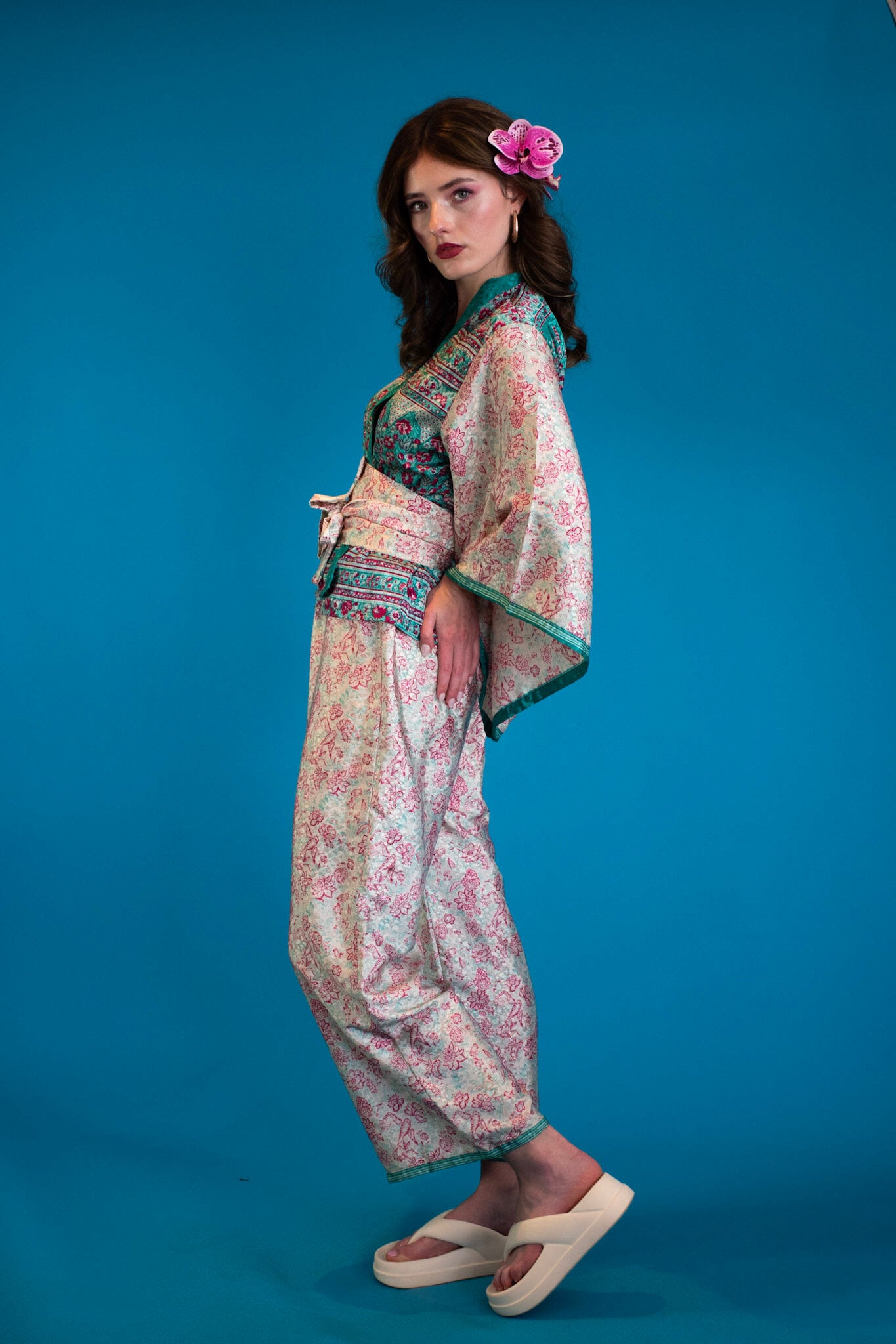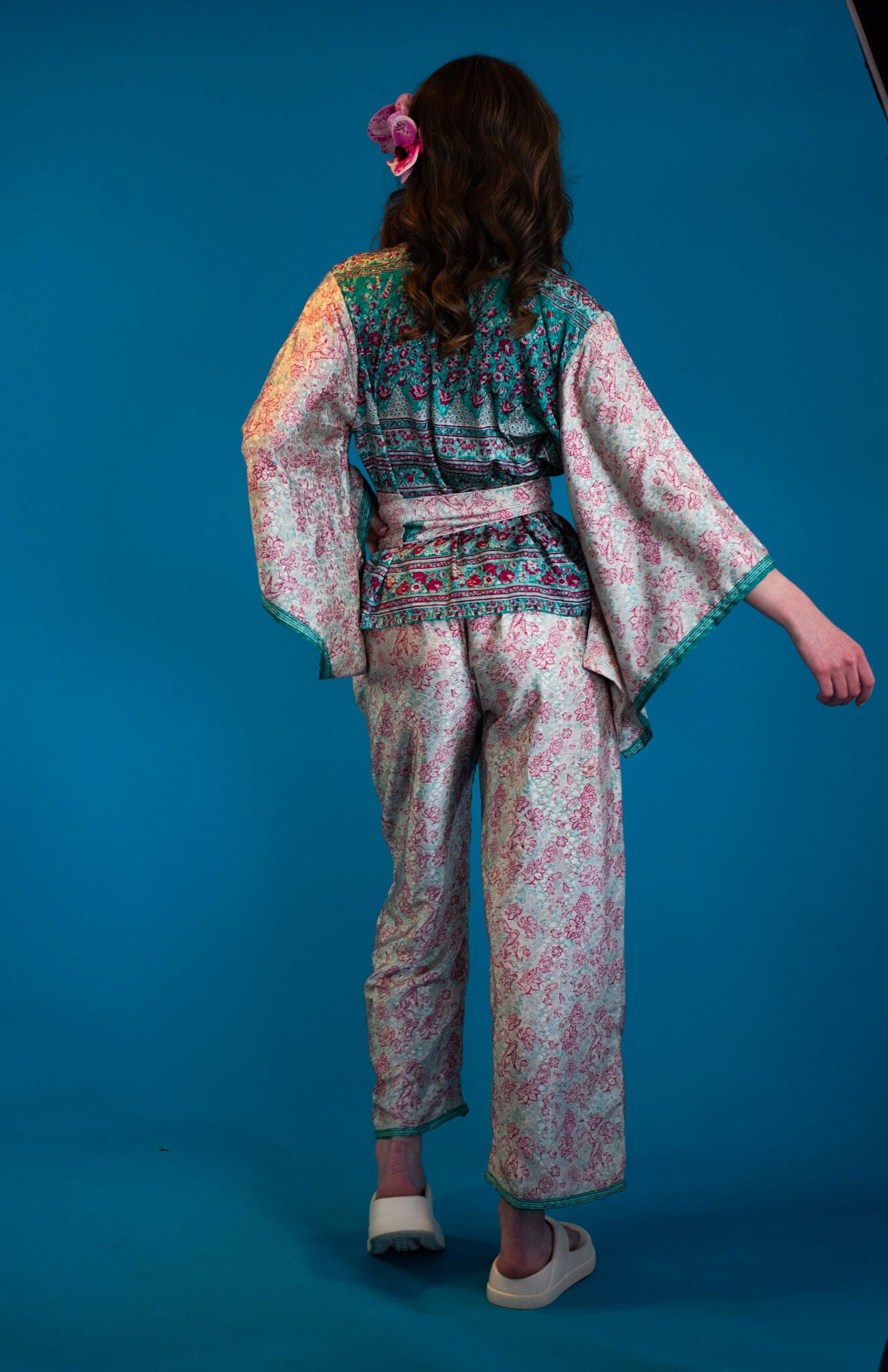 Inspired by the elegance of the Japanese kimono, this kimono jacket and pants set reimagines tradition through the artistry of Indian textiles. Each piece is crafted from carefully curated floral silk saris, selected for their fine, painterly motifs that echo the serene beauty of Japanese botanical art. The result is a refined conversation between cultures - where Indian floral expressiveness meets Japanese Art.