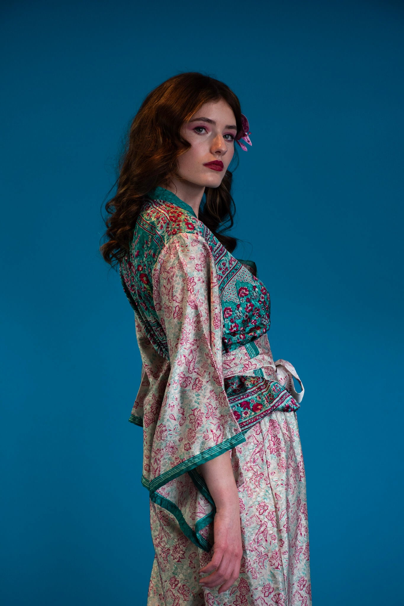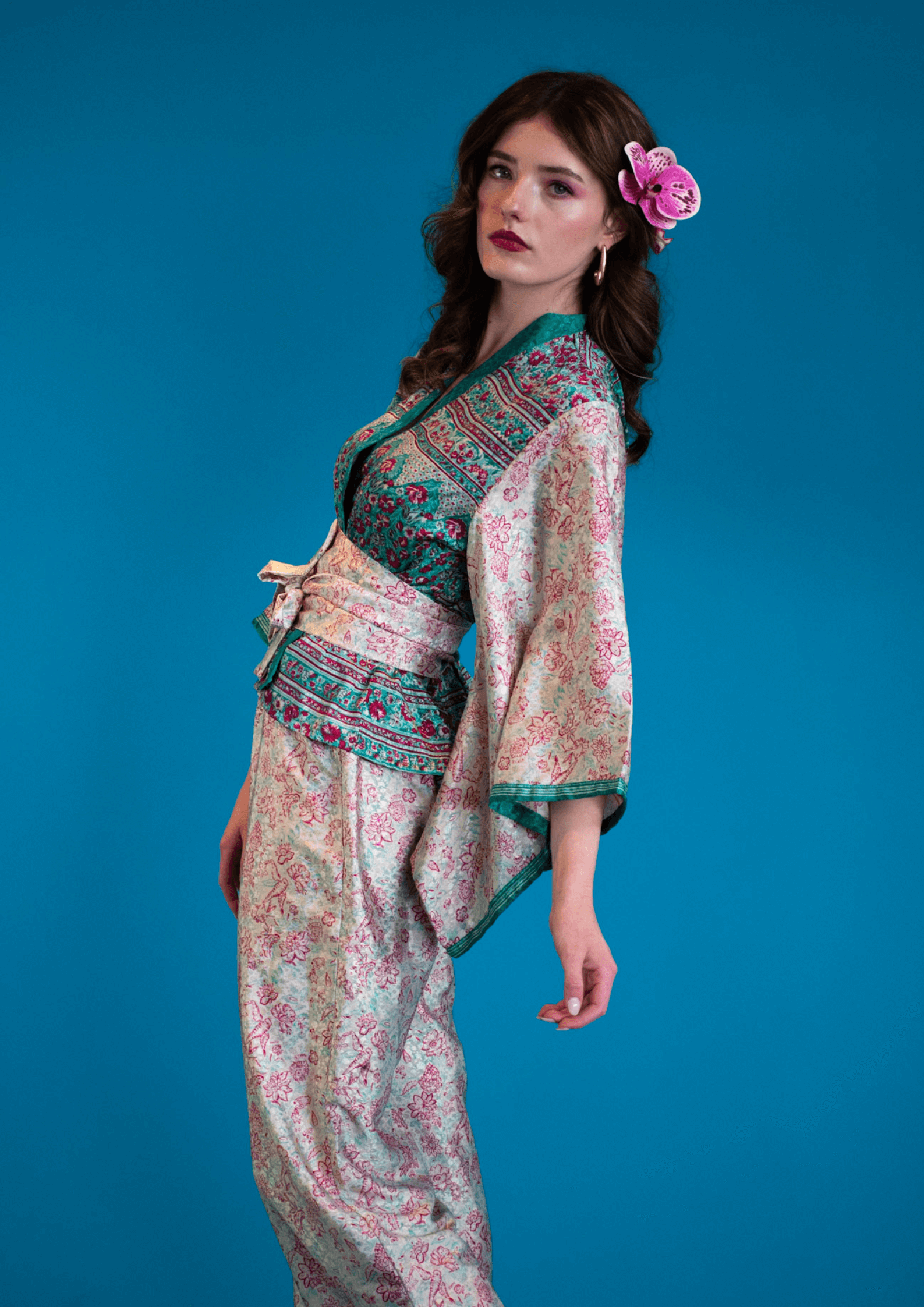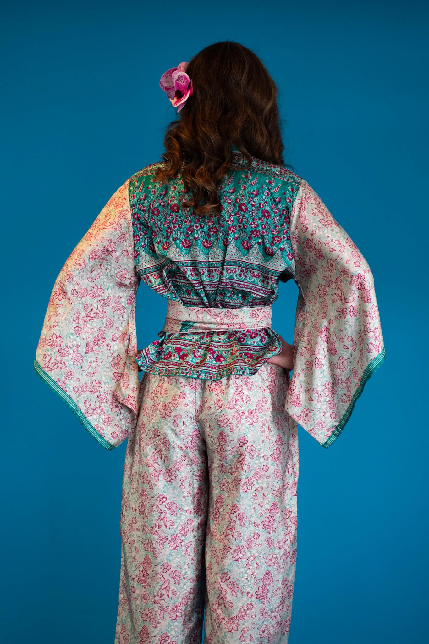Inspired by the elegance of the Japanese kimono, this kimono jacket and pants set reimagines tradition through the artistry of Indian textiles. Each piece is crafted from carefully curated floral silk saris, selected for their fine, painterly motifs that echo the serene beauty of Japanese botanical art. The result is a refined conversation between cultures - where Indian floral expressiveness meets Japanese Art.