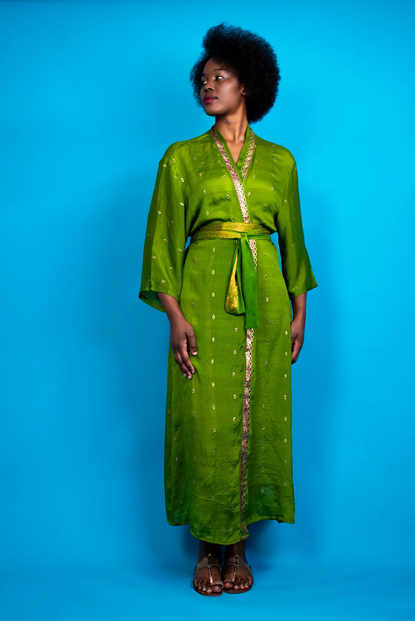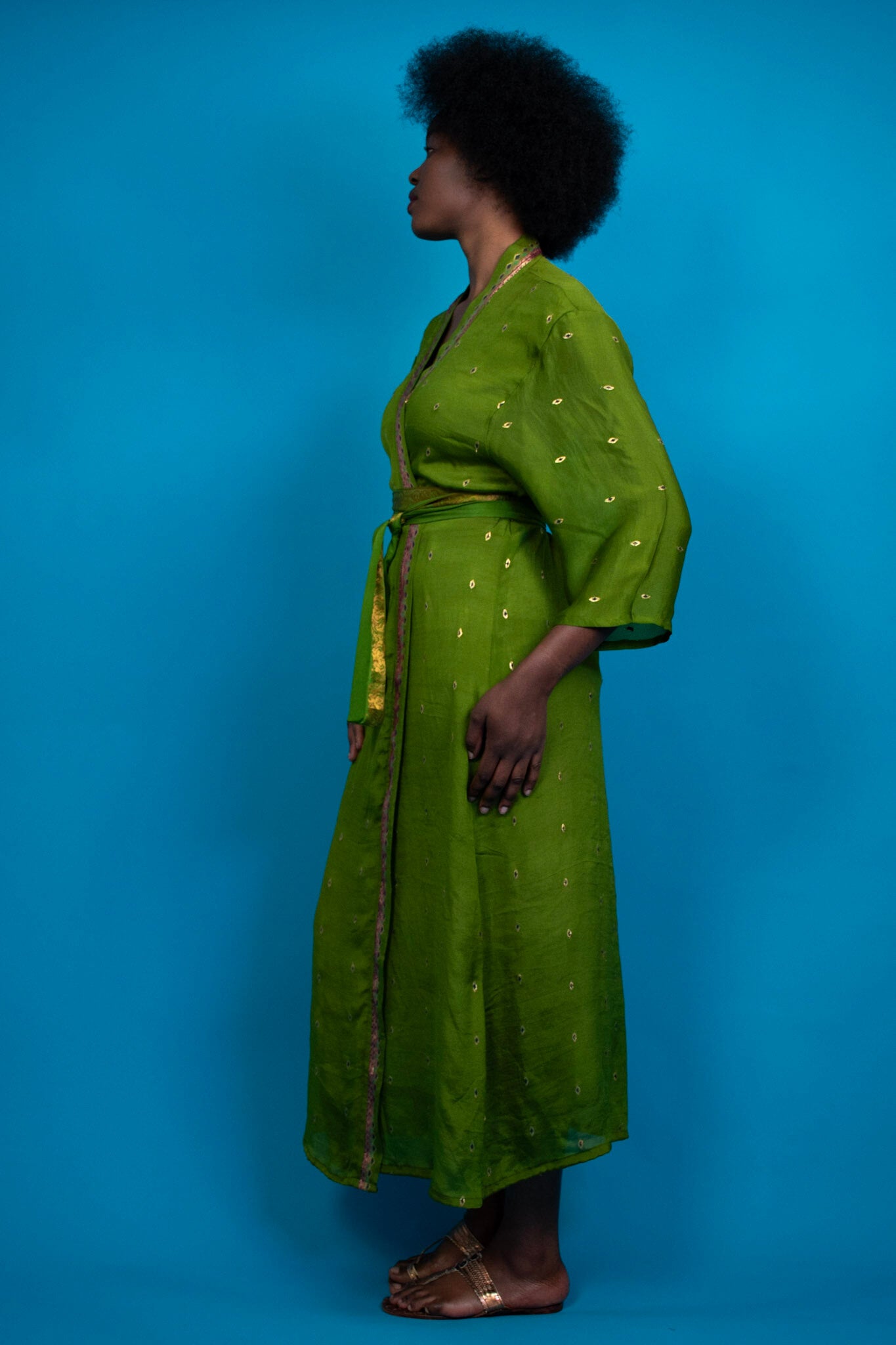 A flowing kimono crafted in luxurious green butter-silk, offering a soft, fluid drape that moves effortlessly with the body. Accented with subtle gold embroidery, this piece blends understated refinement with timeless elegance, creating a silhouette that feels both serene and sophisticated.