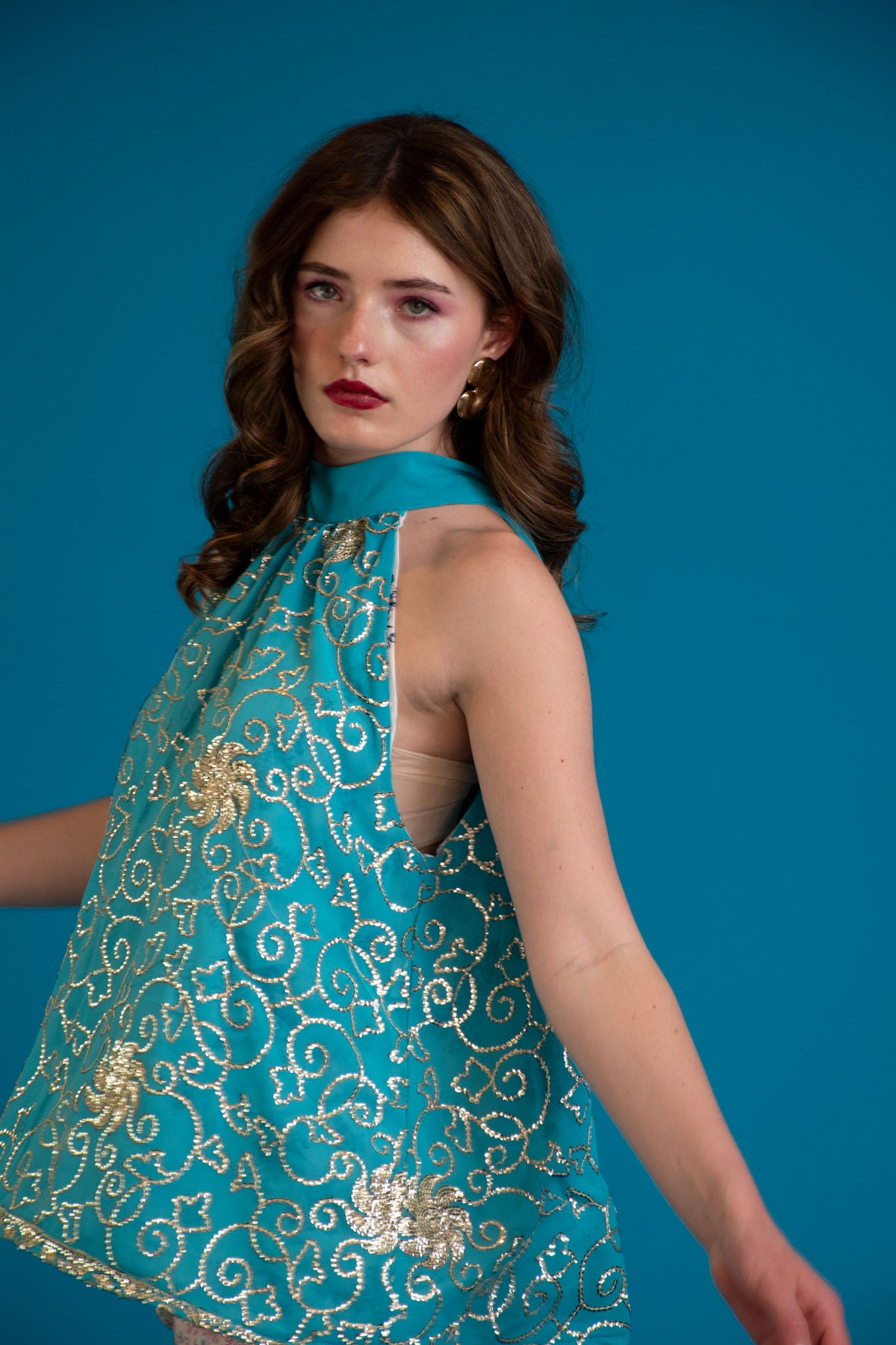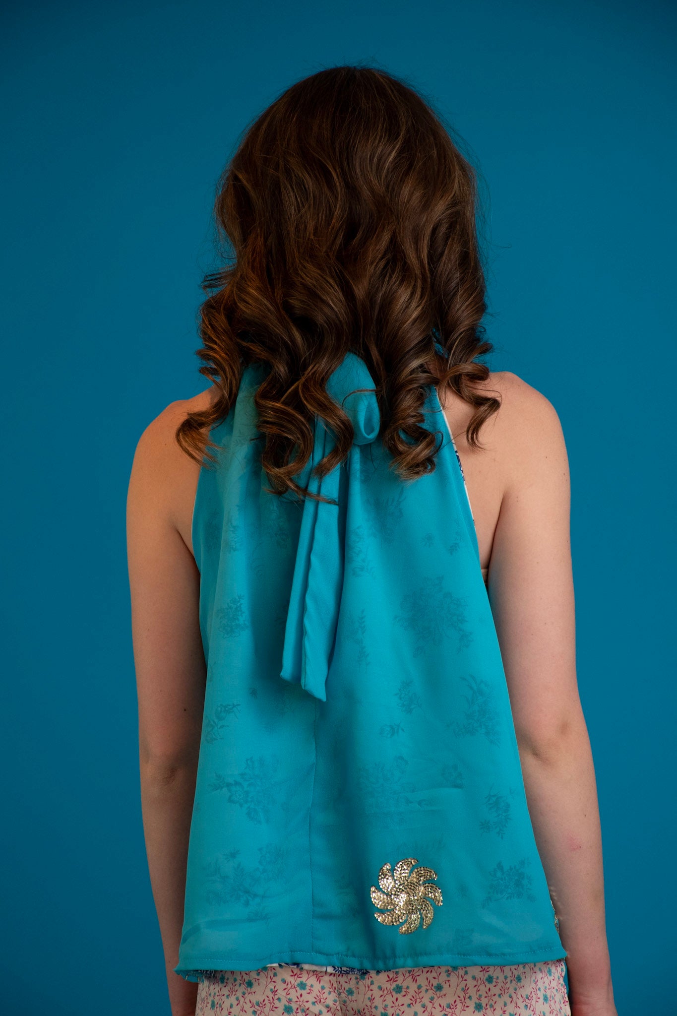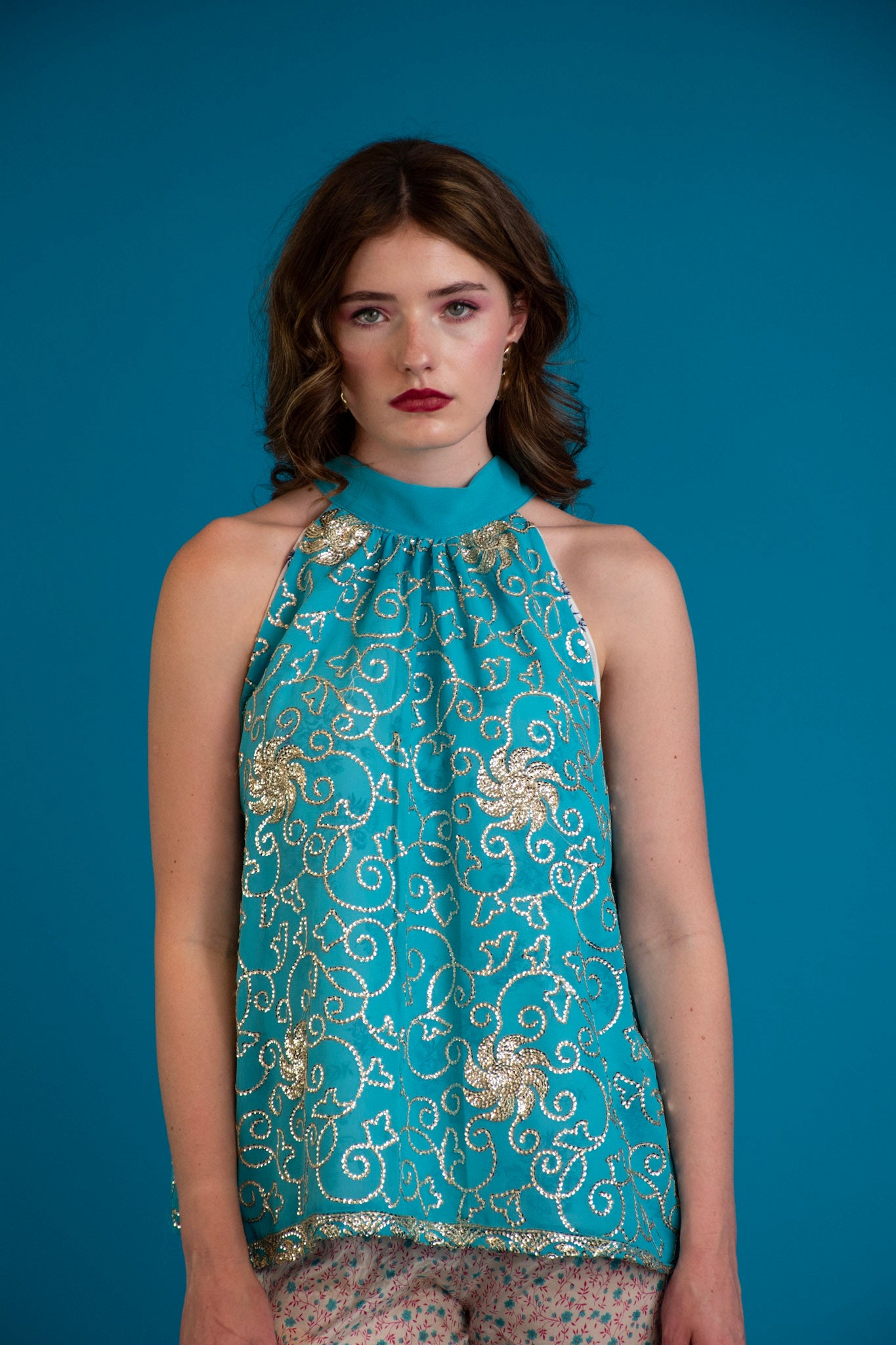 A celebration of colour and light, this reversible halter top captures the dream of endless summer. Crafted from printed chiffon with reverse-beaded detailing, each piece shimmers softly as you move - a touch of glam woven into effortless ease.