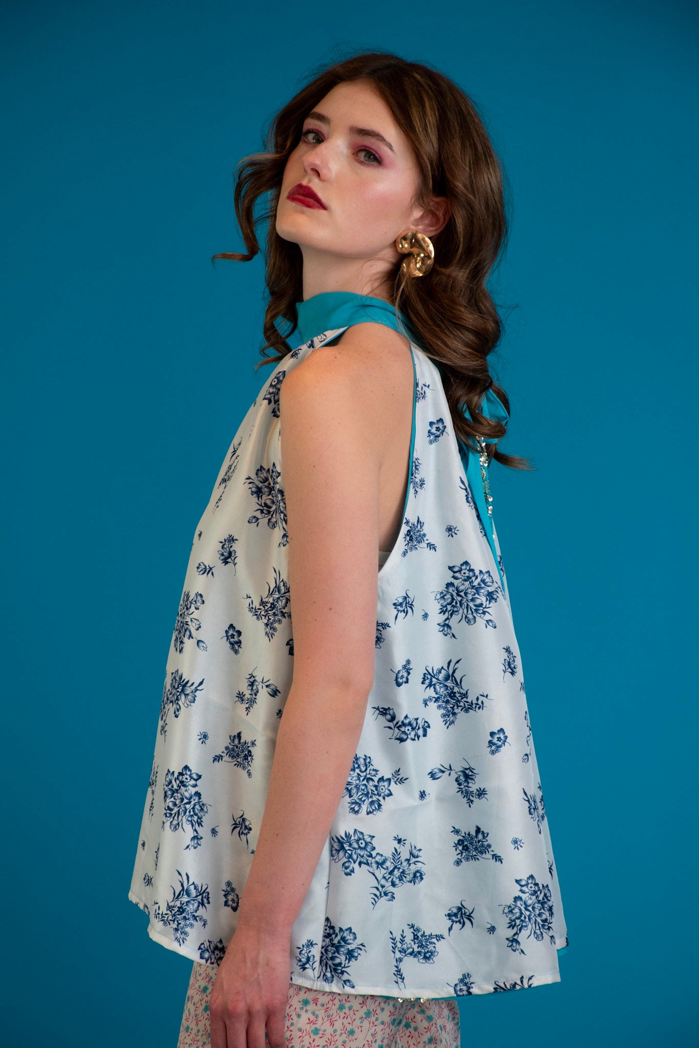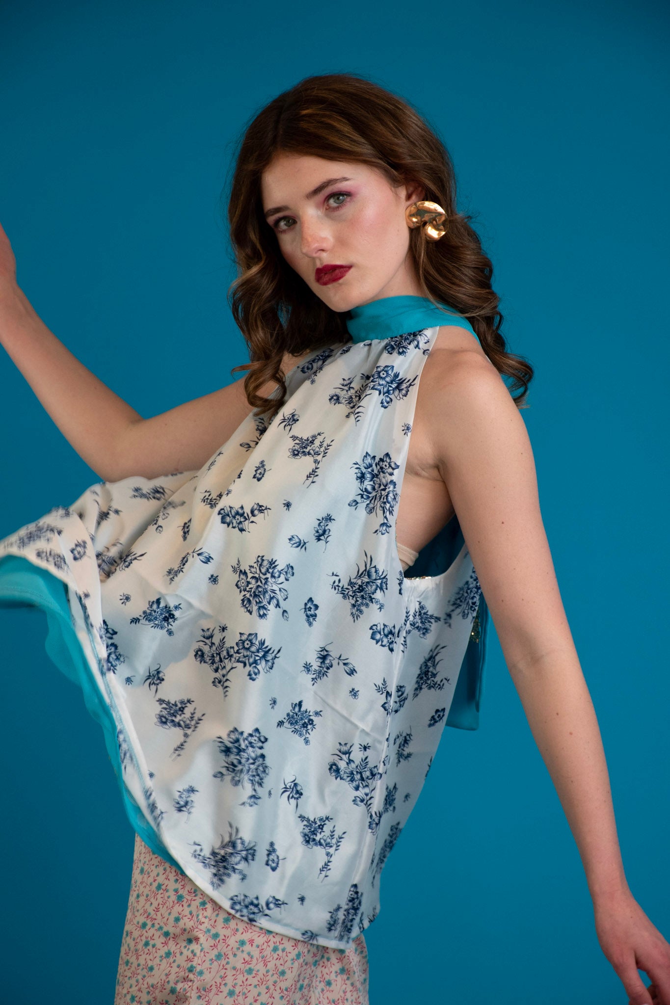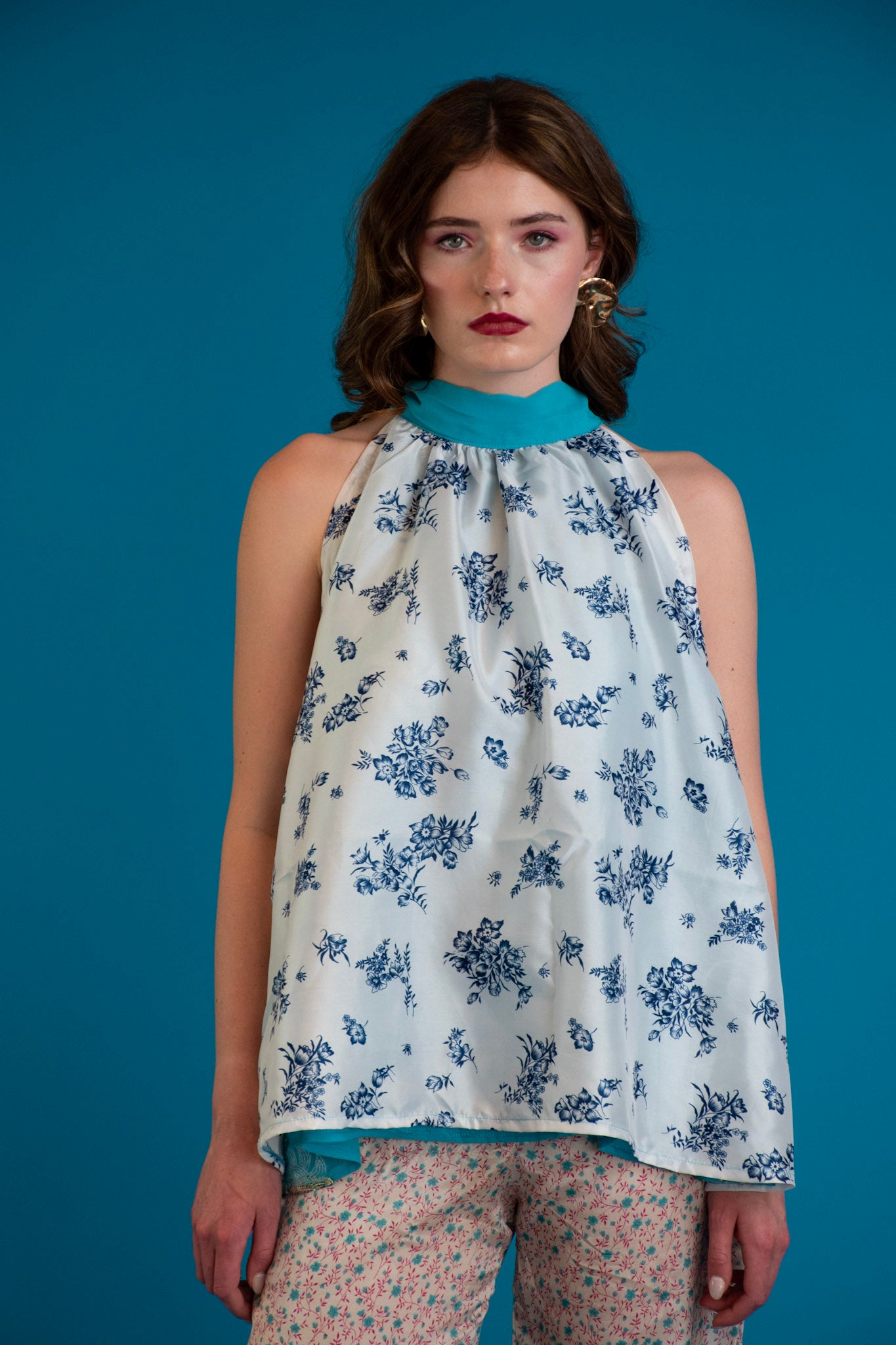 A celebration of colour and light, this reversible halter top captures the dream of endless summer. Crafted from printed chiffon with reverse-beaded detailing, each piece shimmers softly as you move - a touch of glam woven into effortless ease.