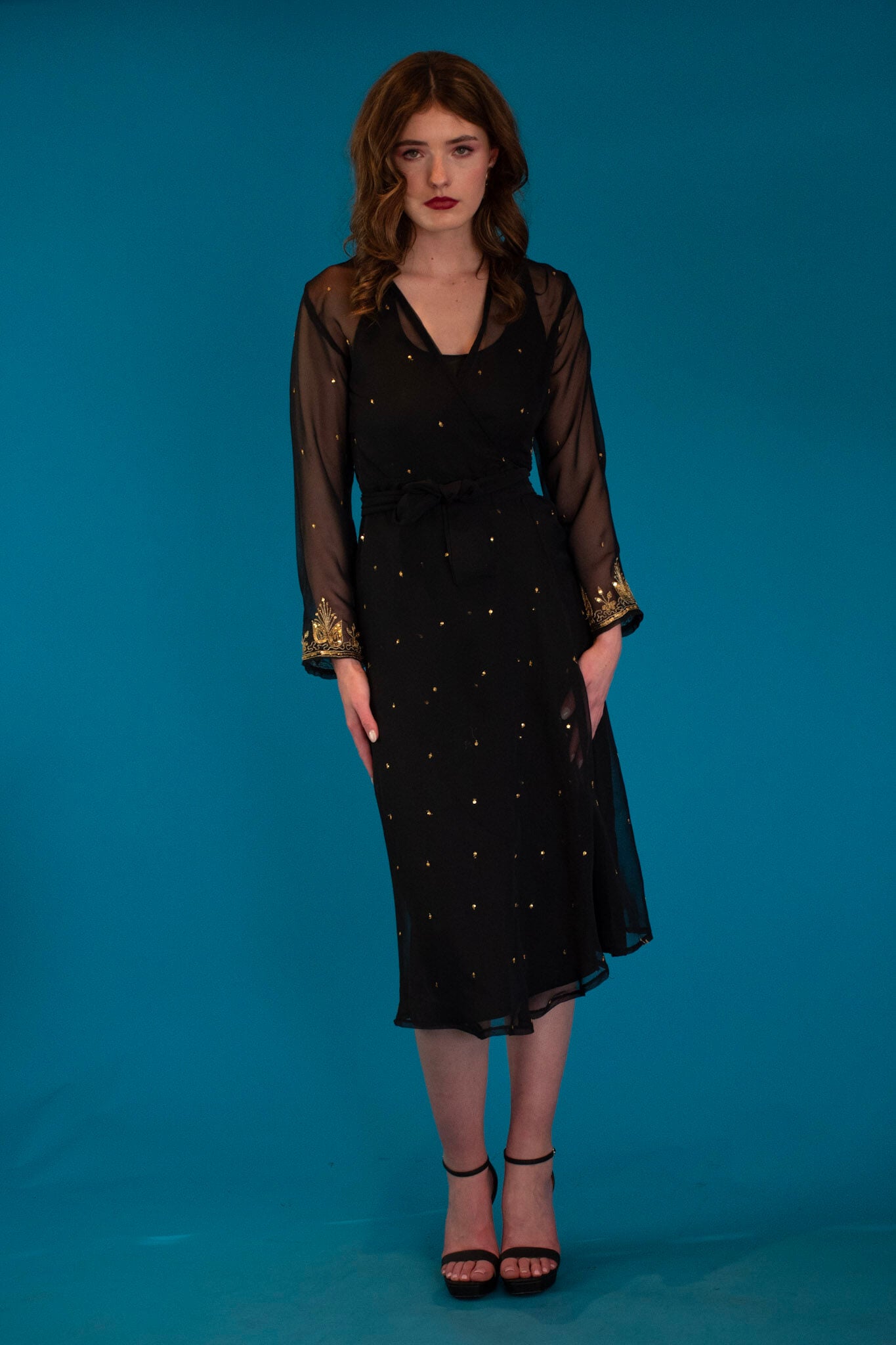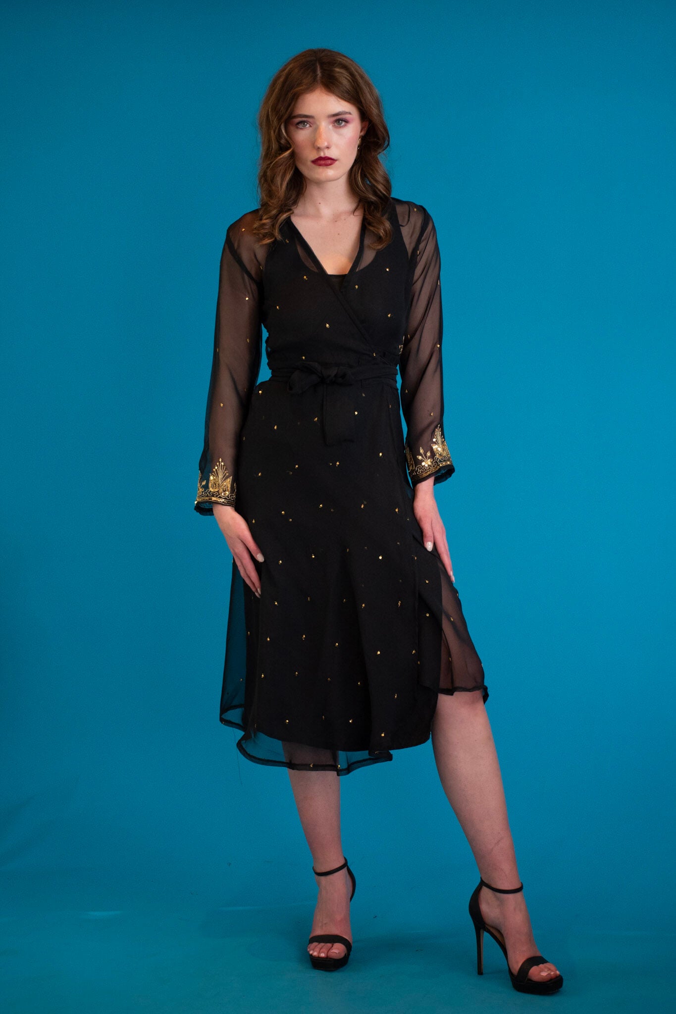 A celebration of effortless elegance, this chiffon wrap dress moves with a light, fluid grace. Scattered sequin detailing adds a soft shimmer with every step, catching sunlight by day and candlelight by night.