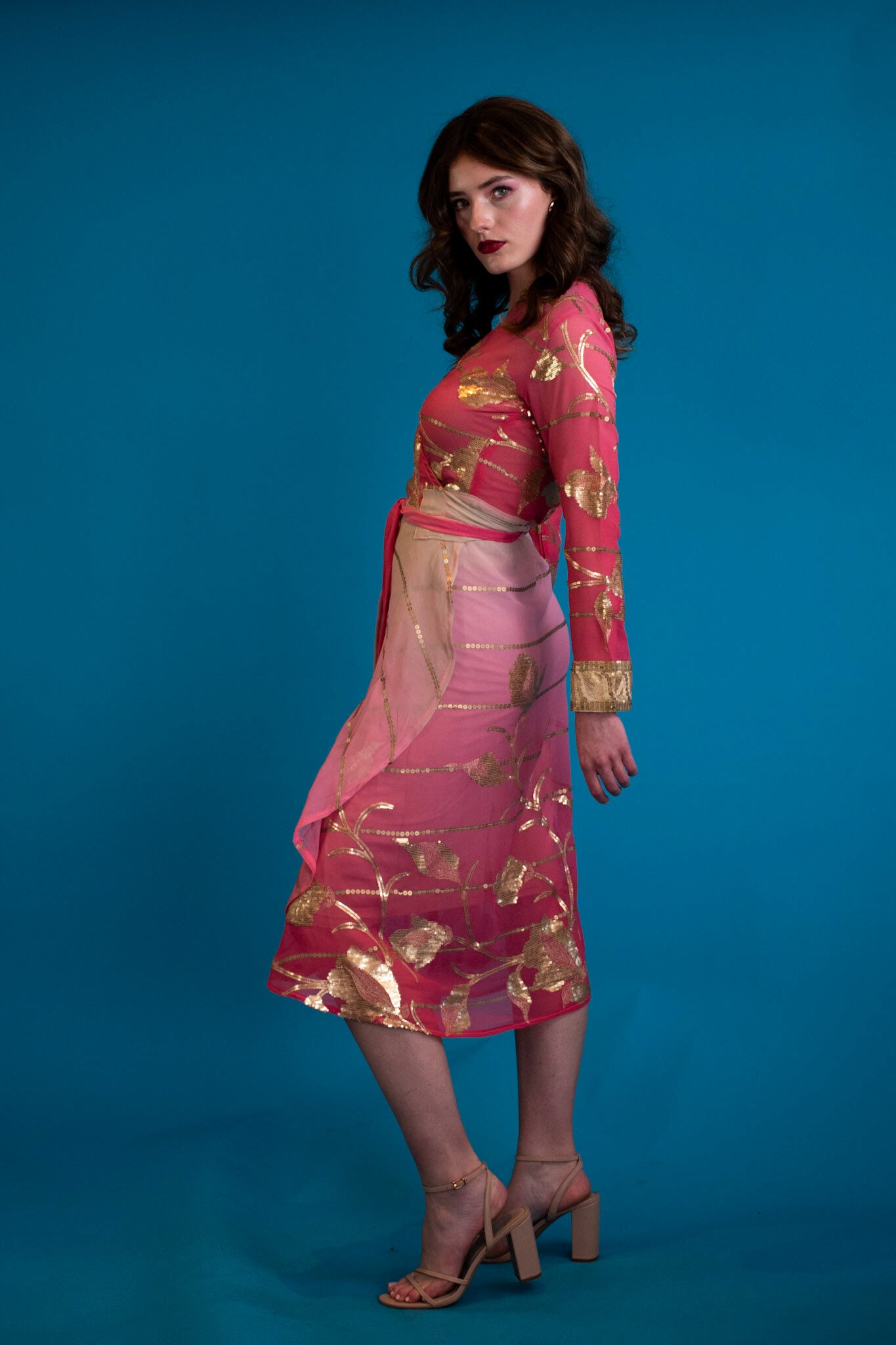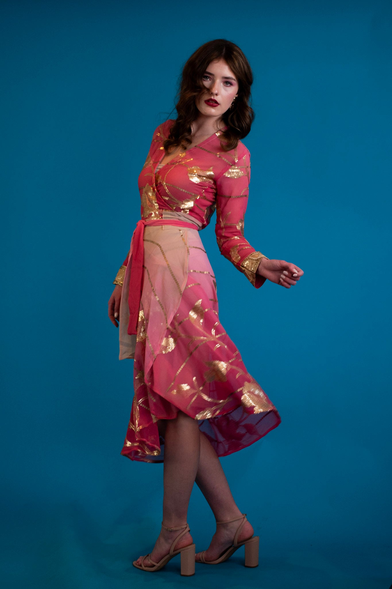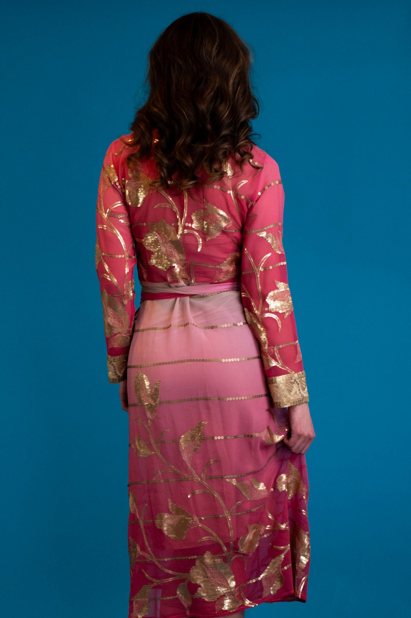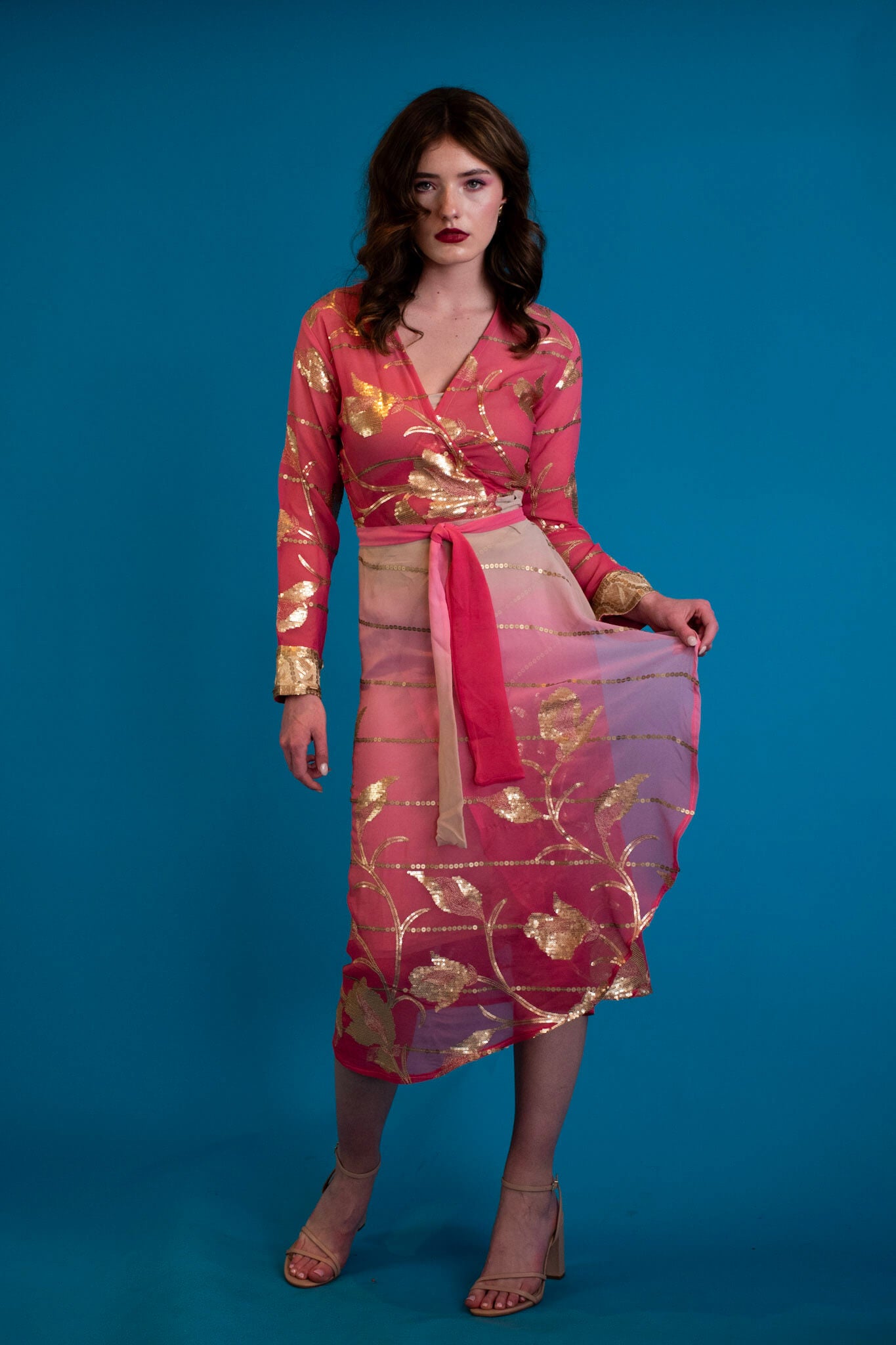 A celebration of effortless elegance, this chiffon wrap dress moves with a light, fluid grace. Scattered sequin detailing adds a soft shimmer with every step, catching sunlight by day and candlelight by night.