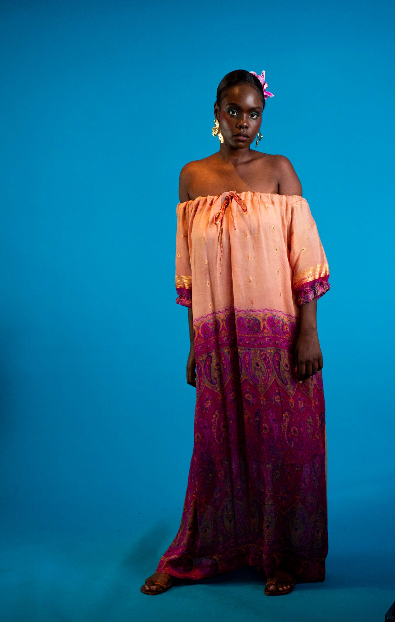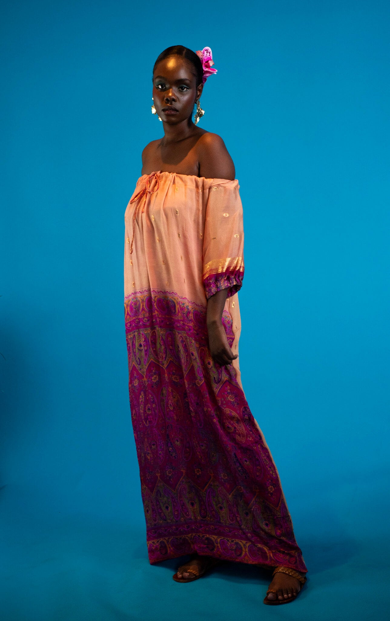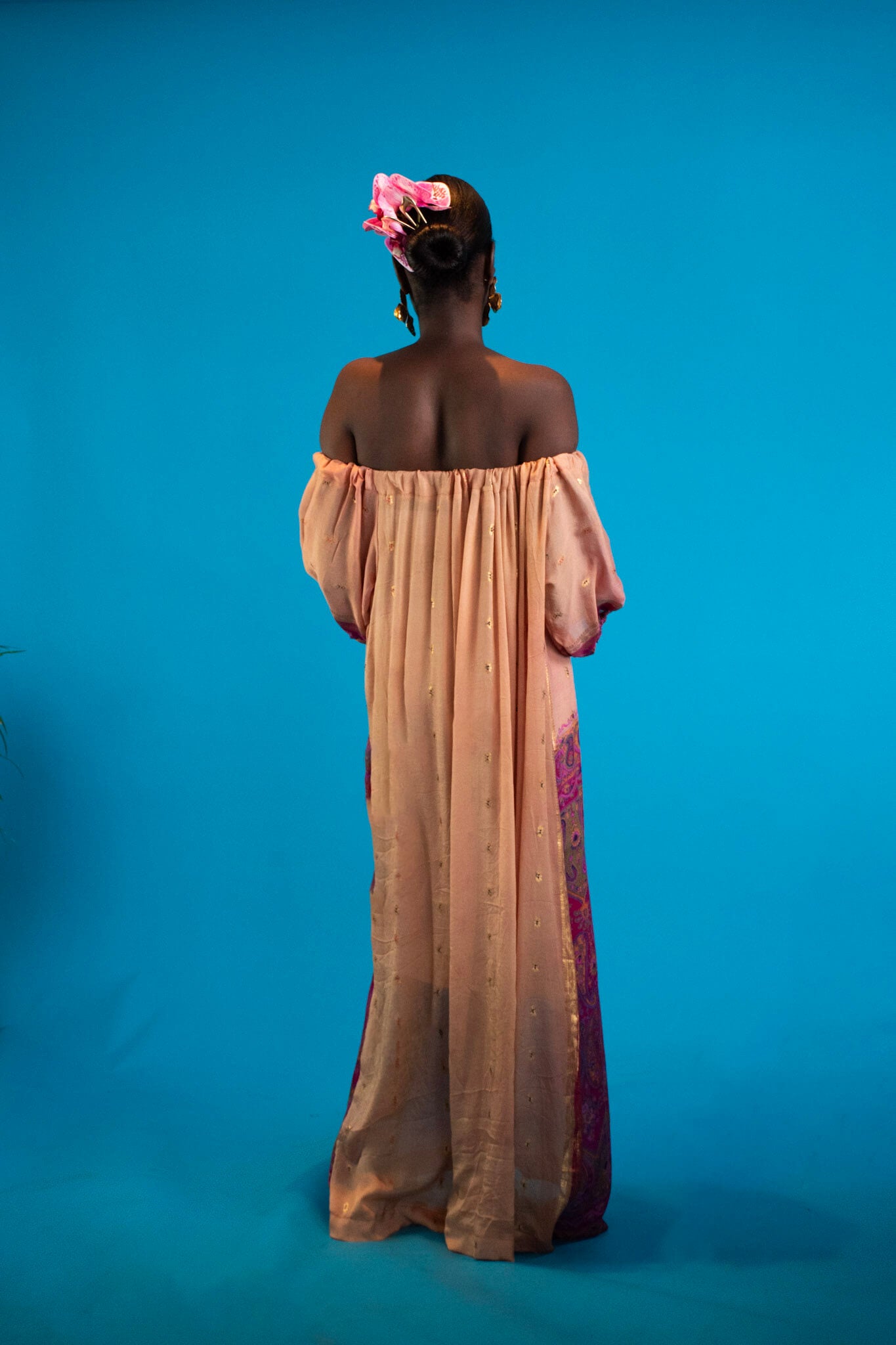A symphony of silk and silhouette, this off-shoulder dress is crafted from repurposed vintage silk saris, where each weave carries a story of artistry and grace. The floral motifs - softly drawn, fluid, and luminous - bloom across the fabric like poetry in motion.