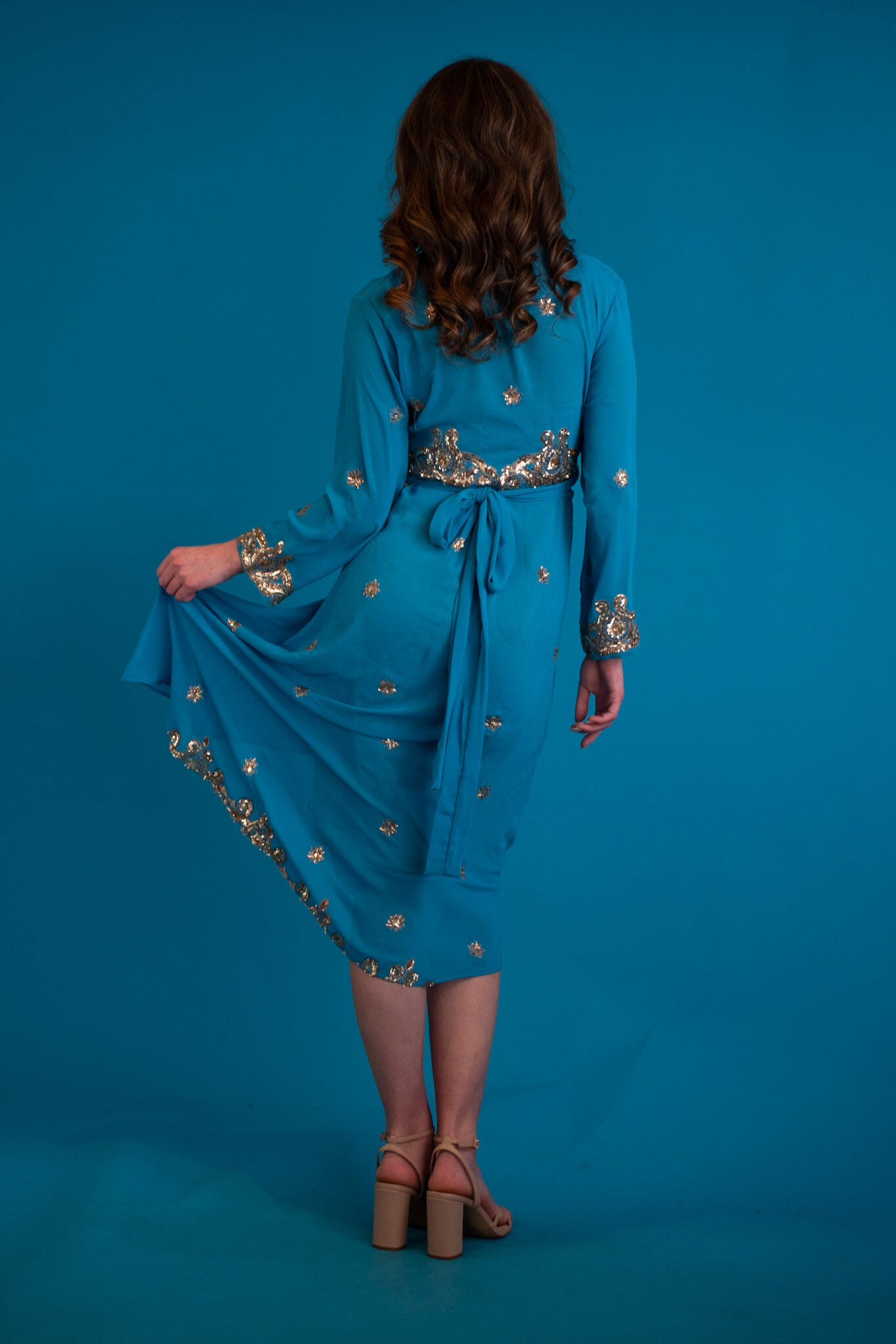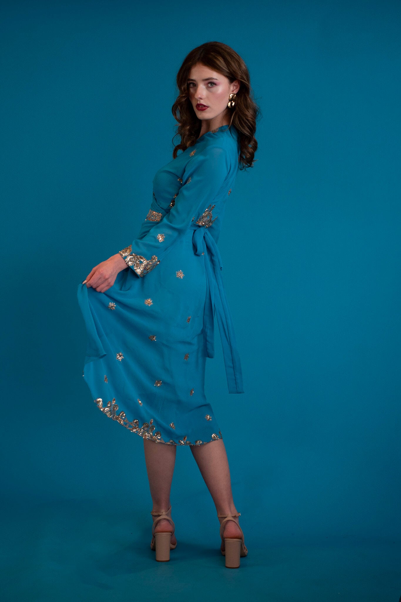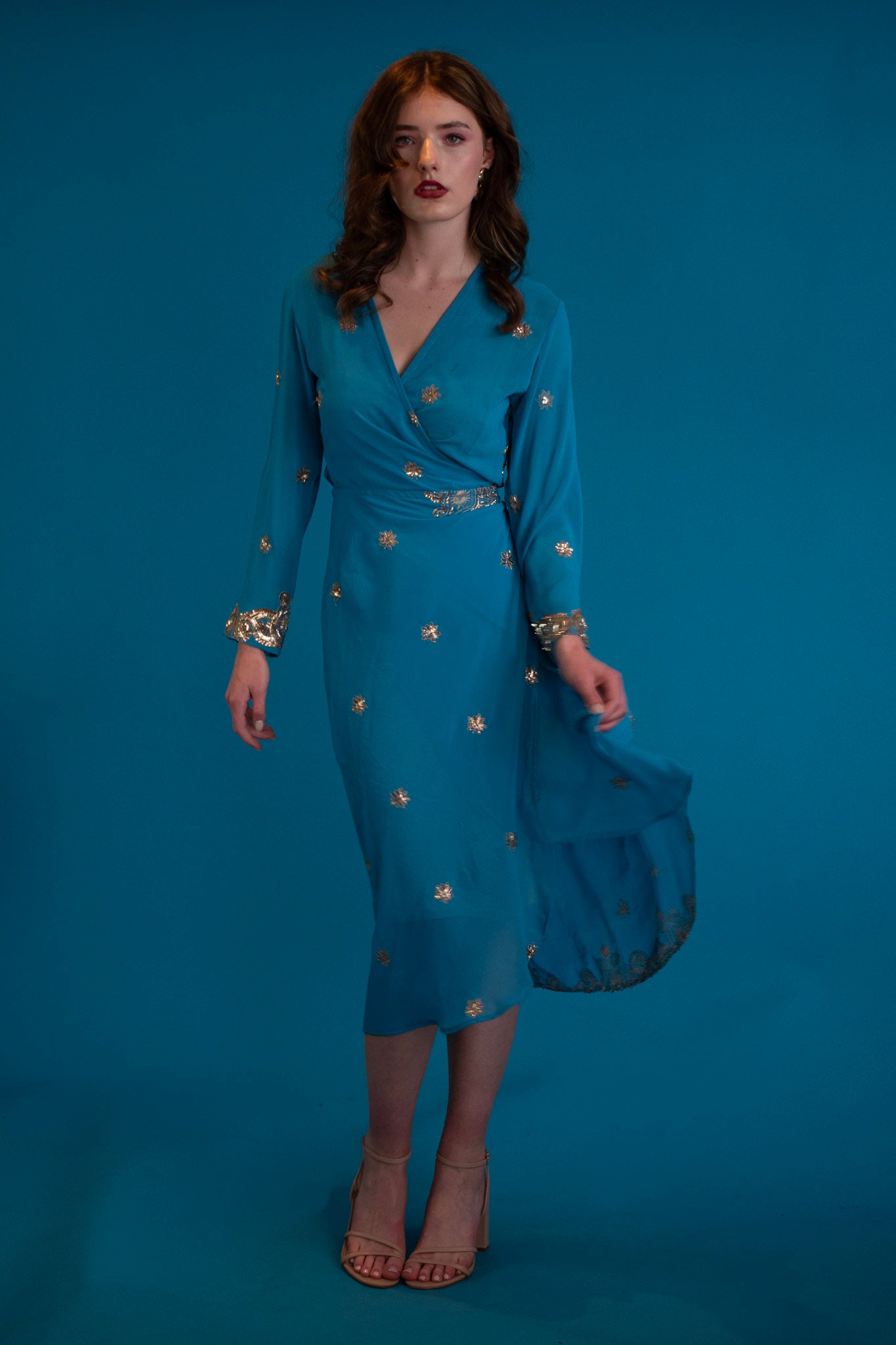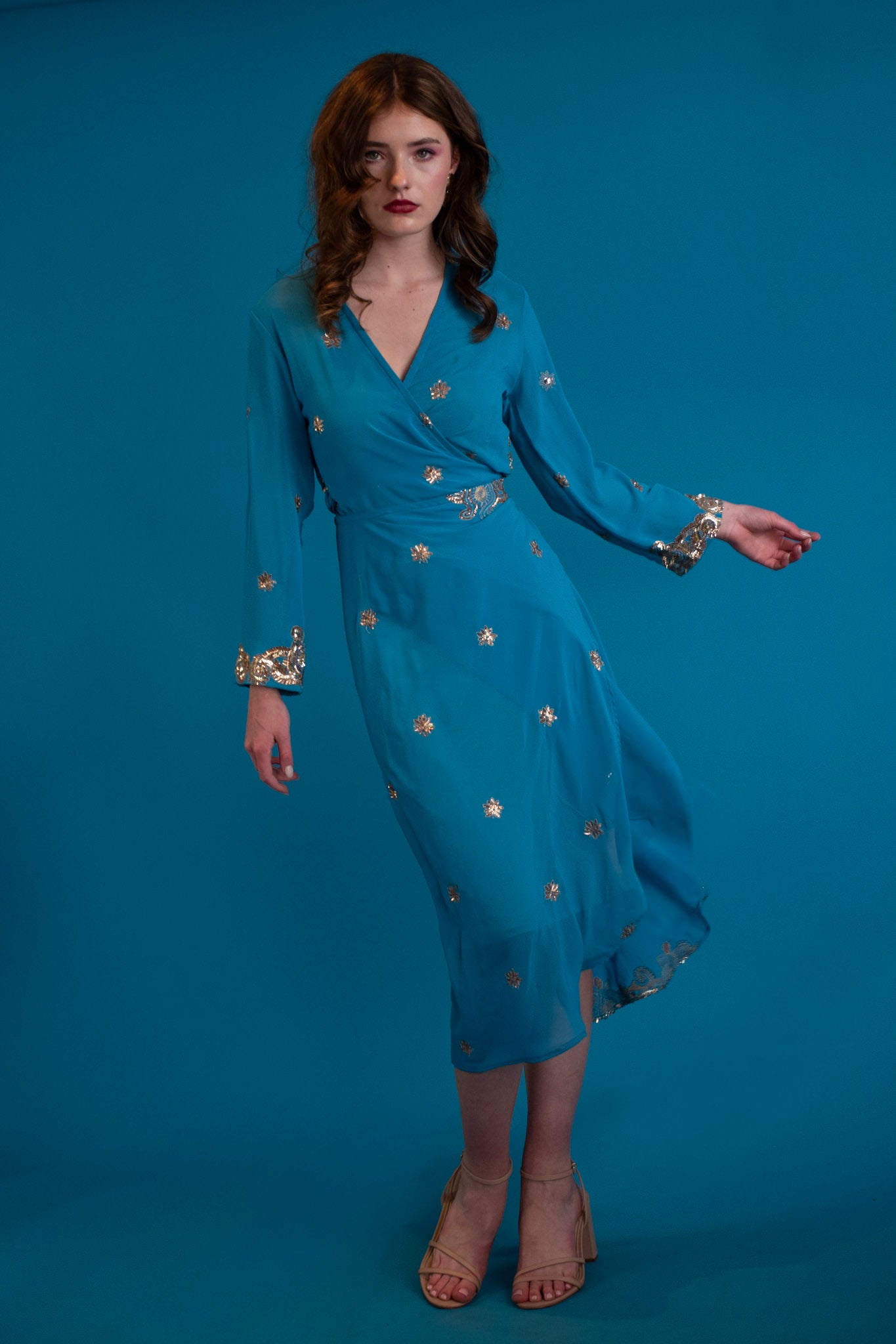 A celebration of effortless elegance, this chiffon wrap dress moves with a light, fluid grace. Scattered sequin detailing adds a soft shimmer with every step, catching sunlight by day and candlelight by night.