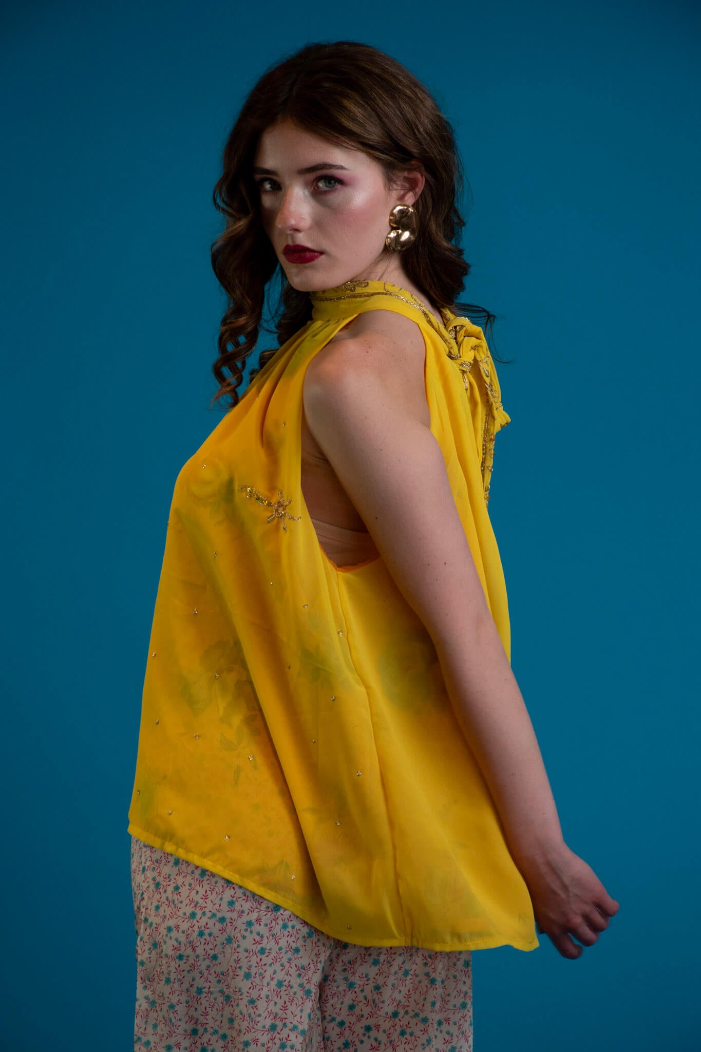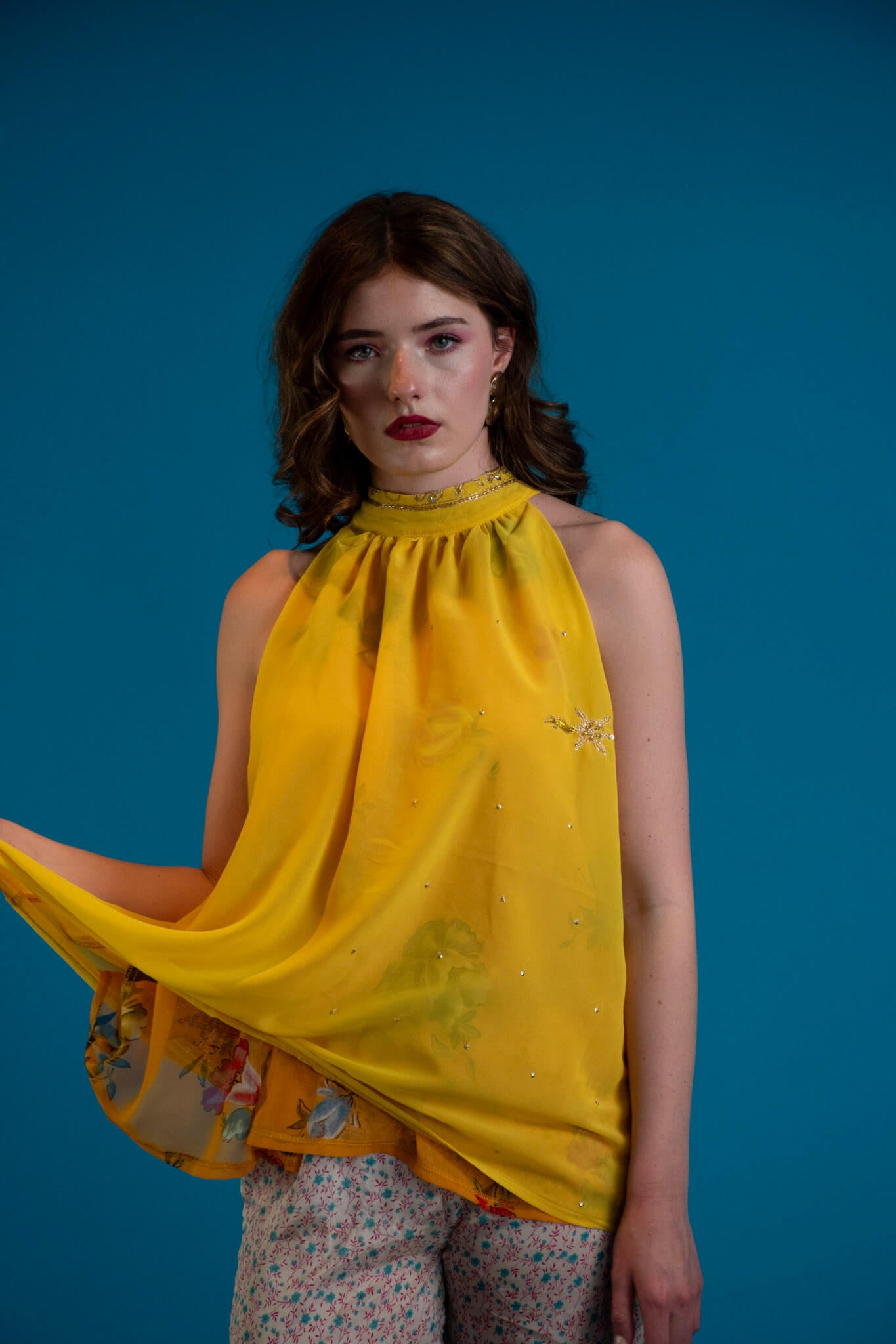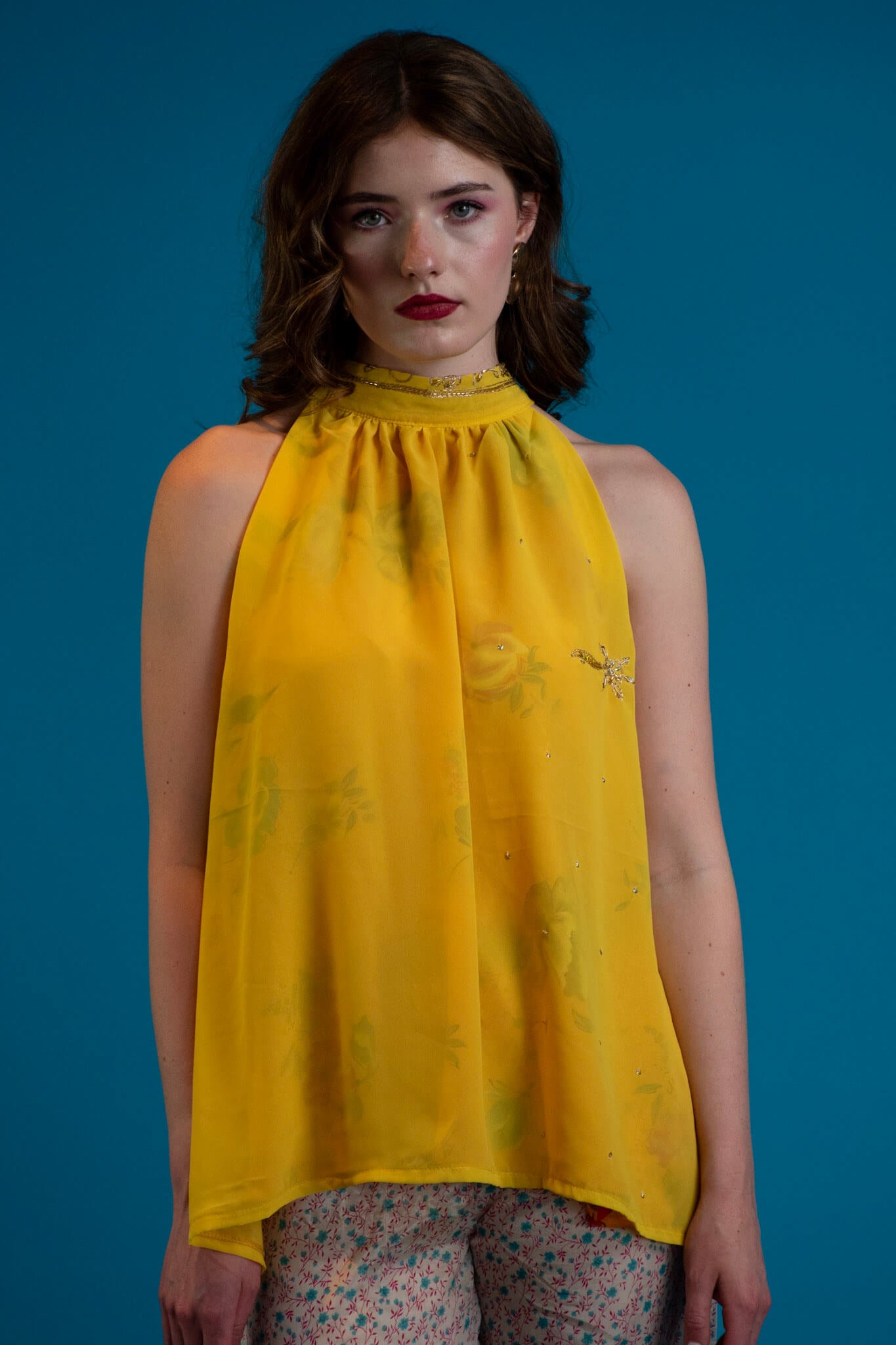 A celebration of colour and light, this reversible halter top captures the dream of endless summer. Crafted from printed chiffon with reverse-beaded detailing, each piece shimmers softly as you move - a touch of glam woven into effortless ease.