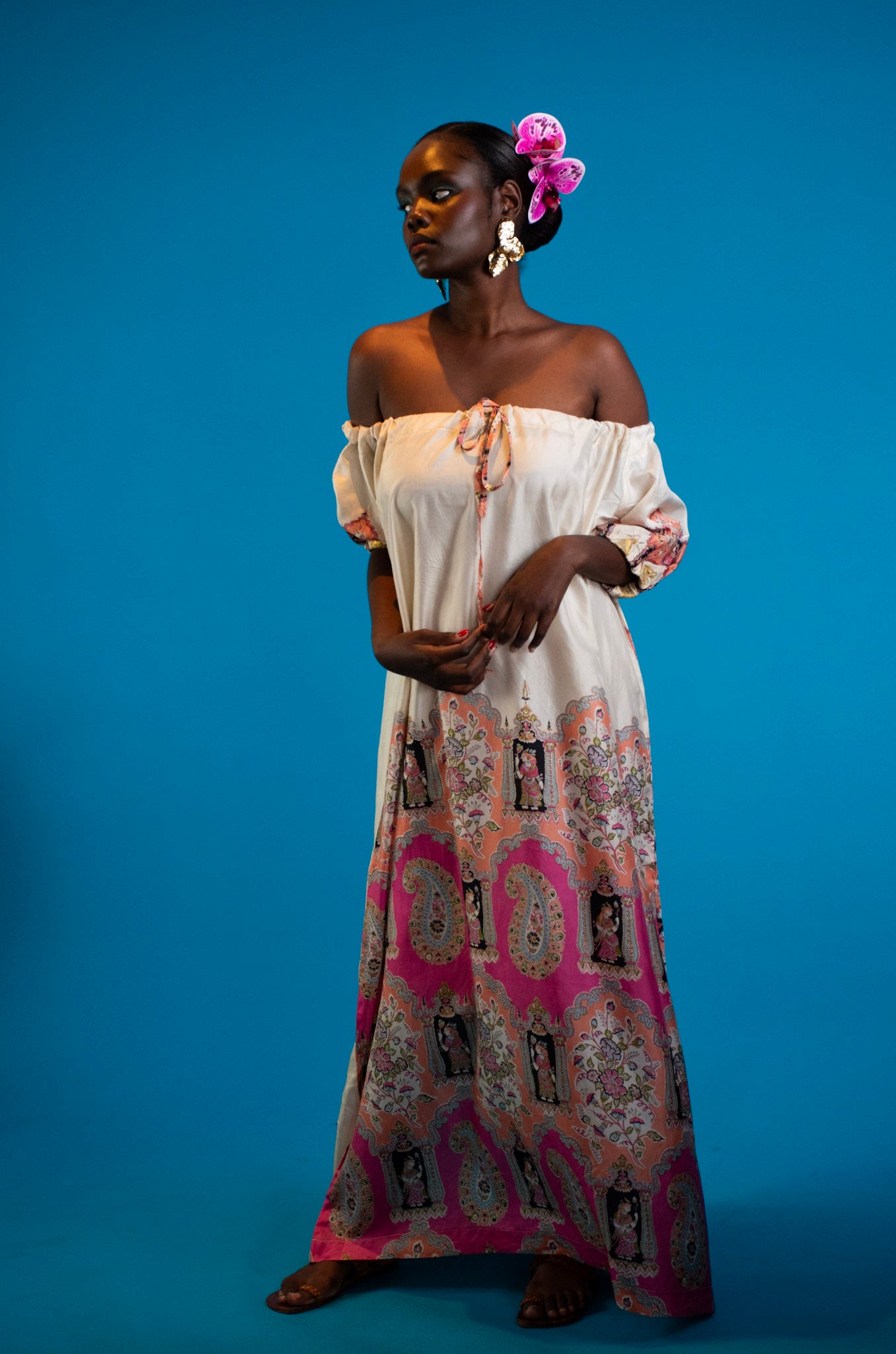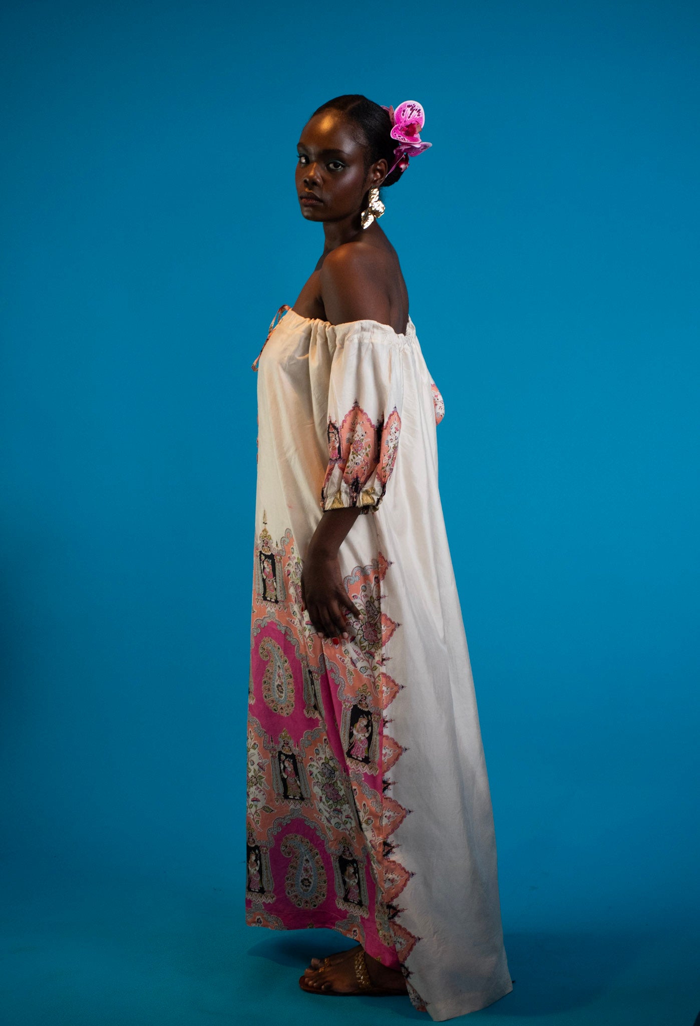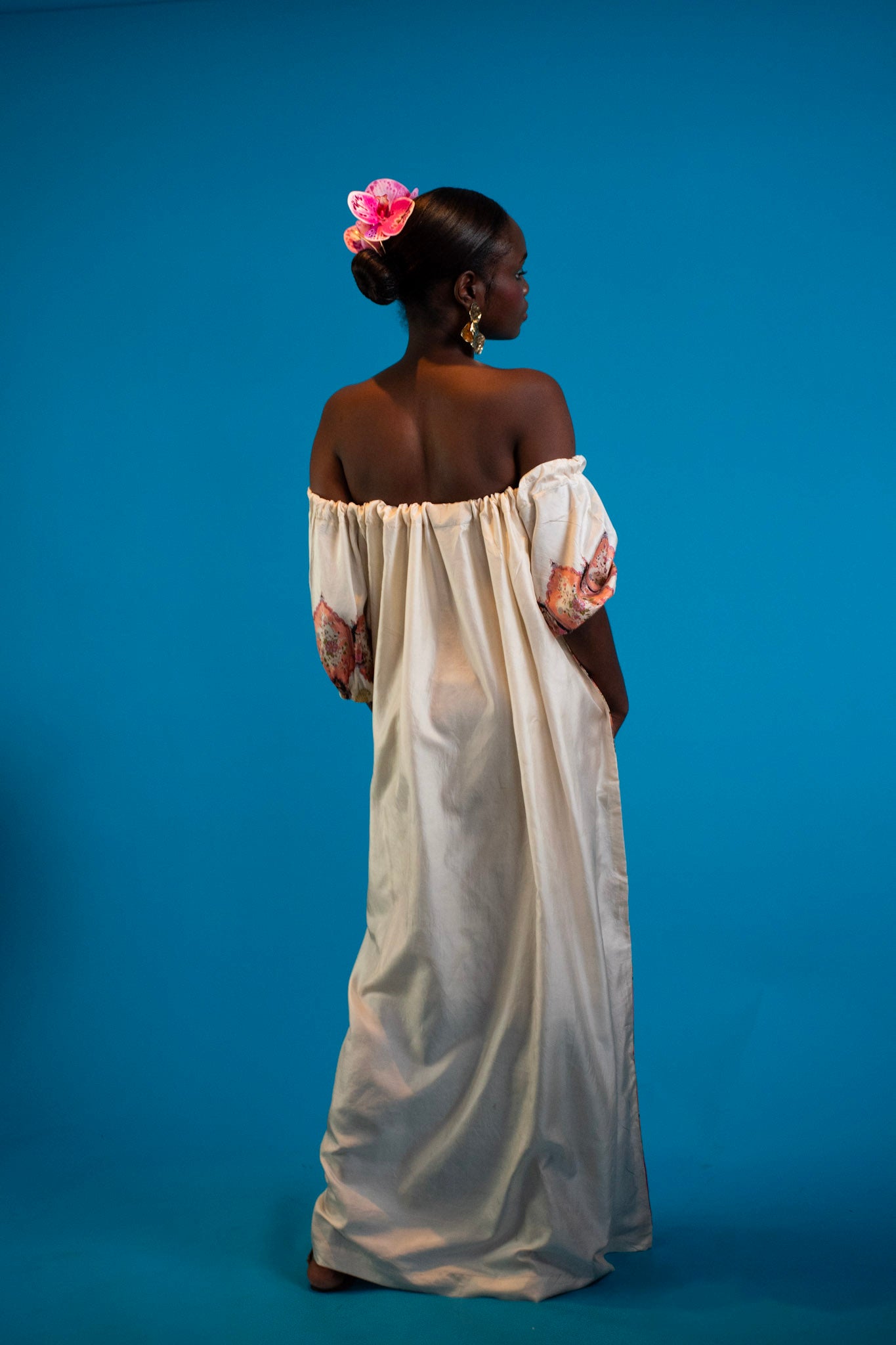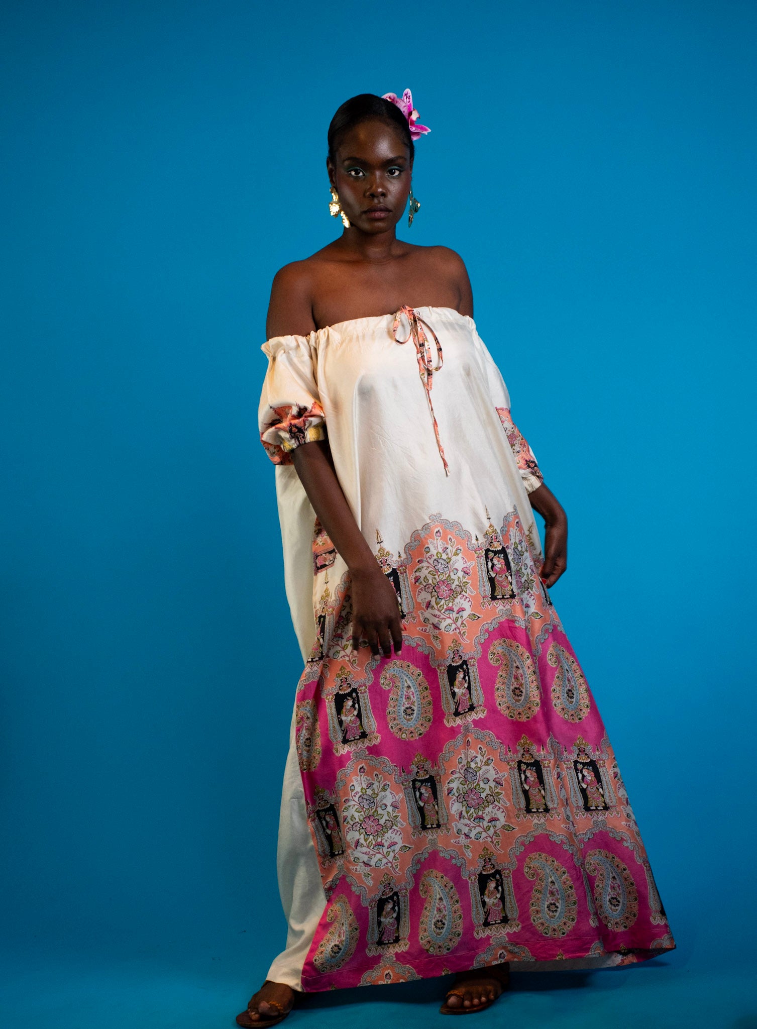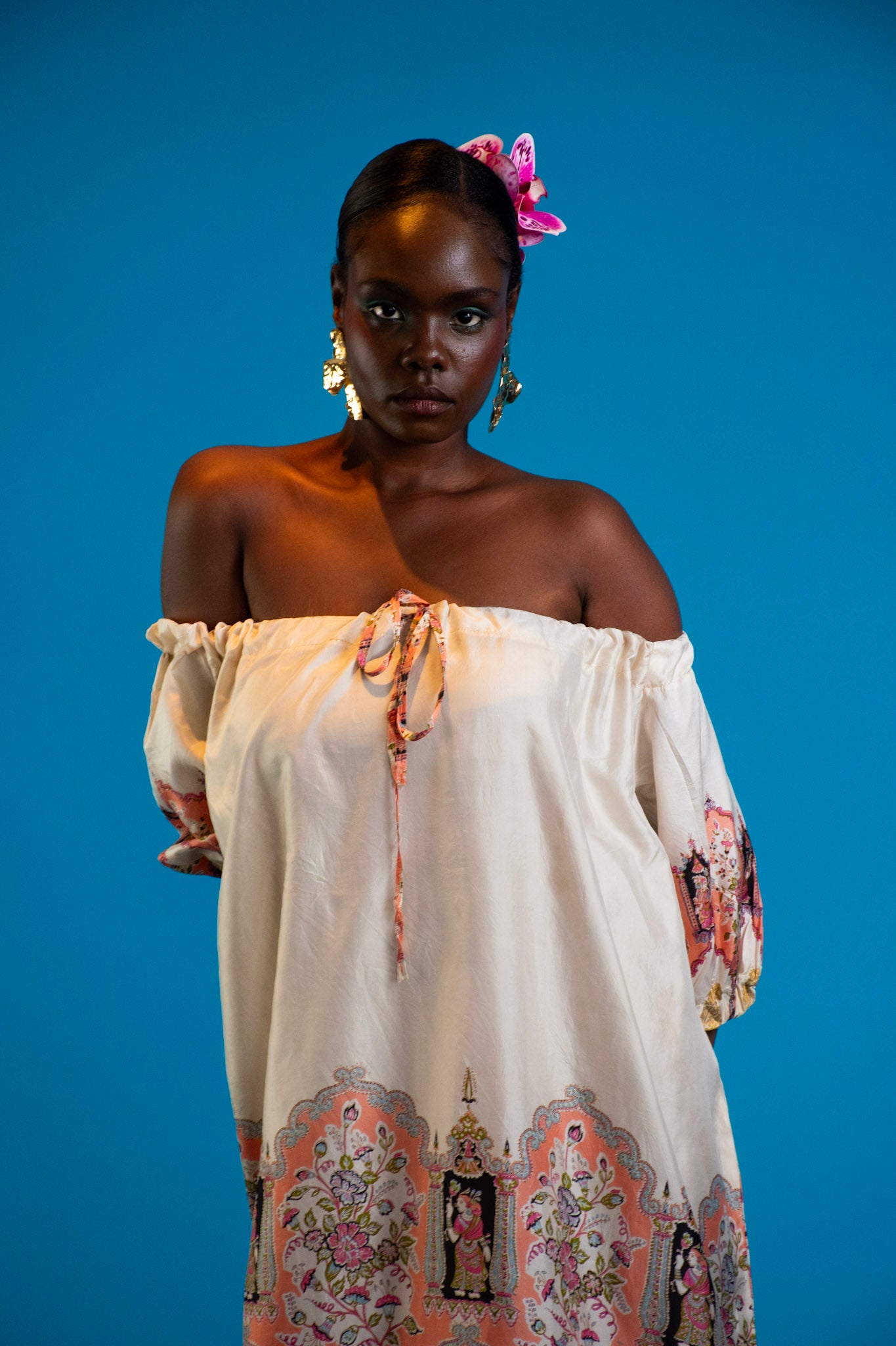A symphony of silk and silhouette, this off-shoulder dress is crafted from repurposed vintage silk saris, where each weave carries a story of artistry and grace. The floral motifs - softly drawn, fluid, and luminous - bloom across the fabric like poetry in motion.