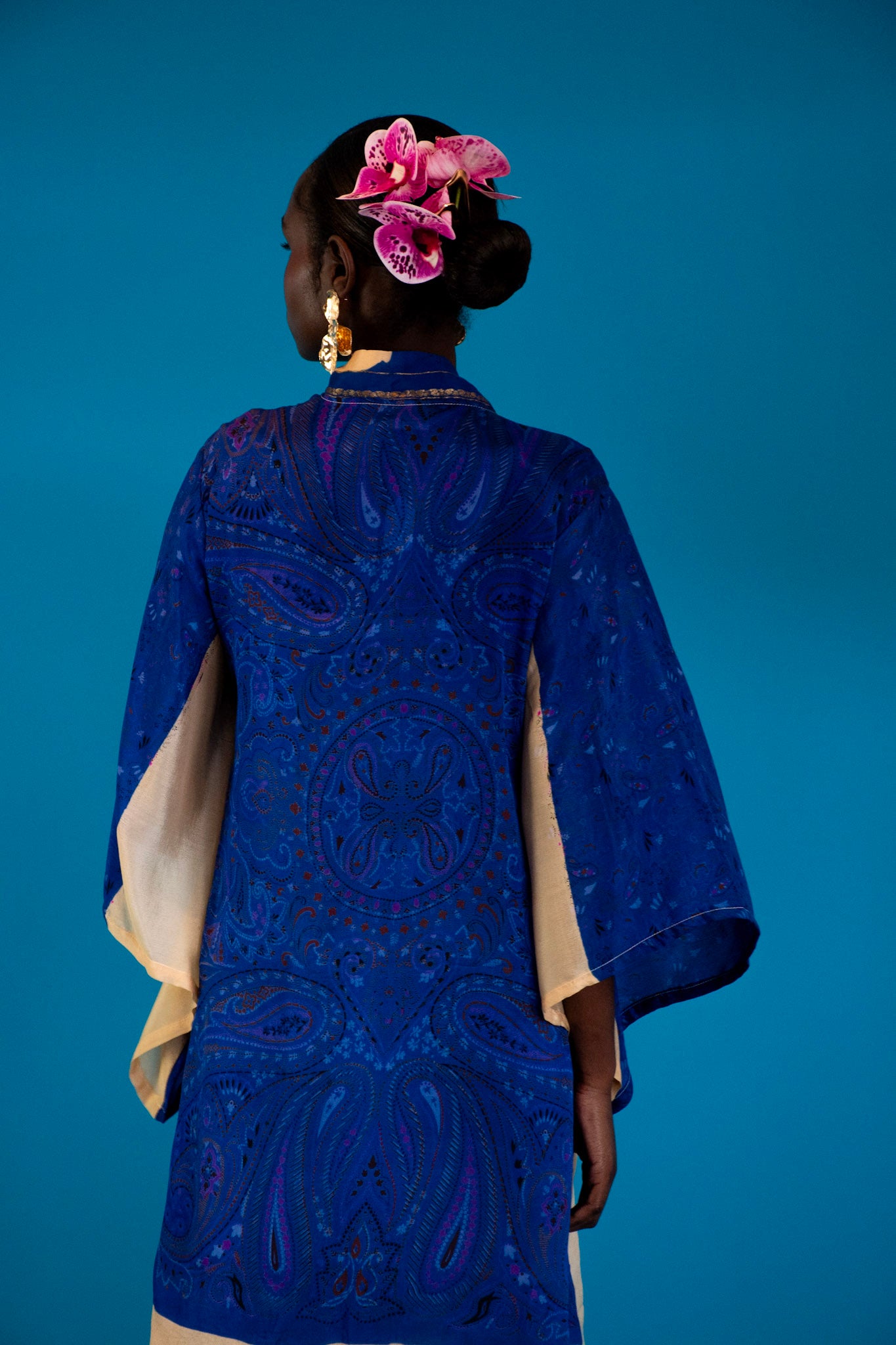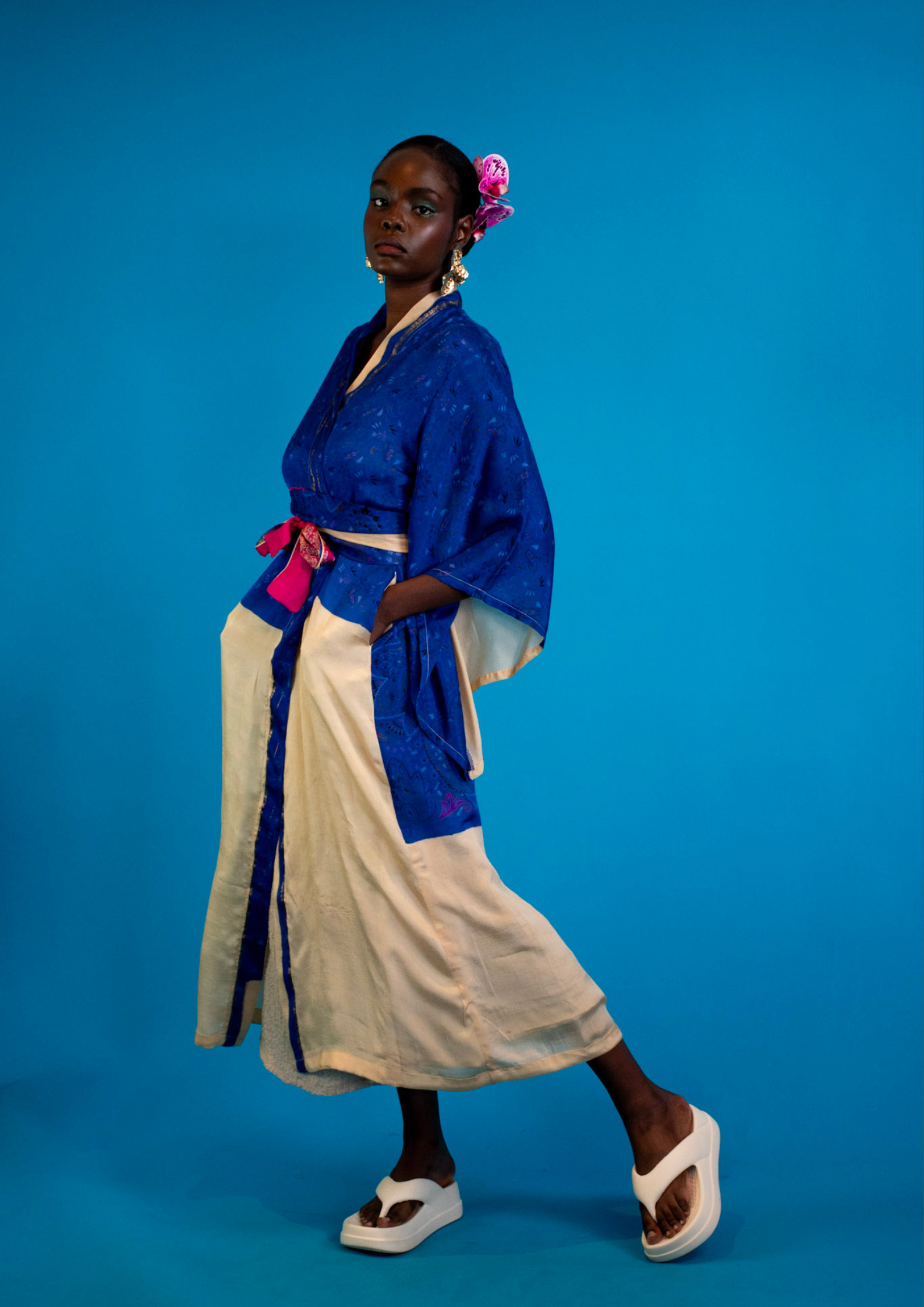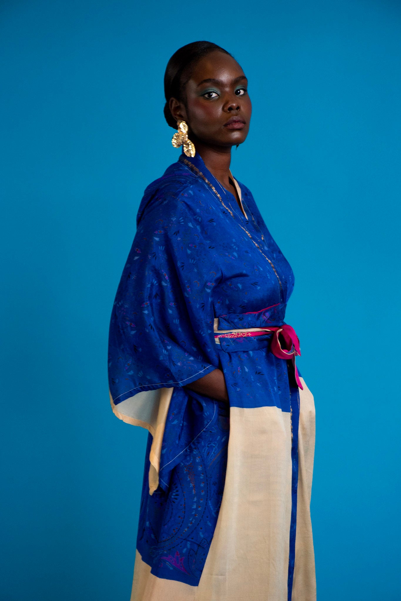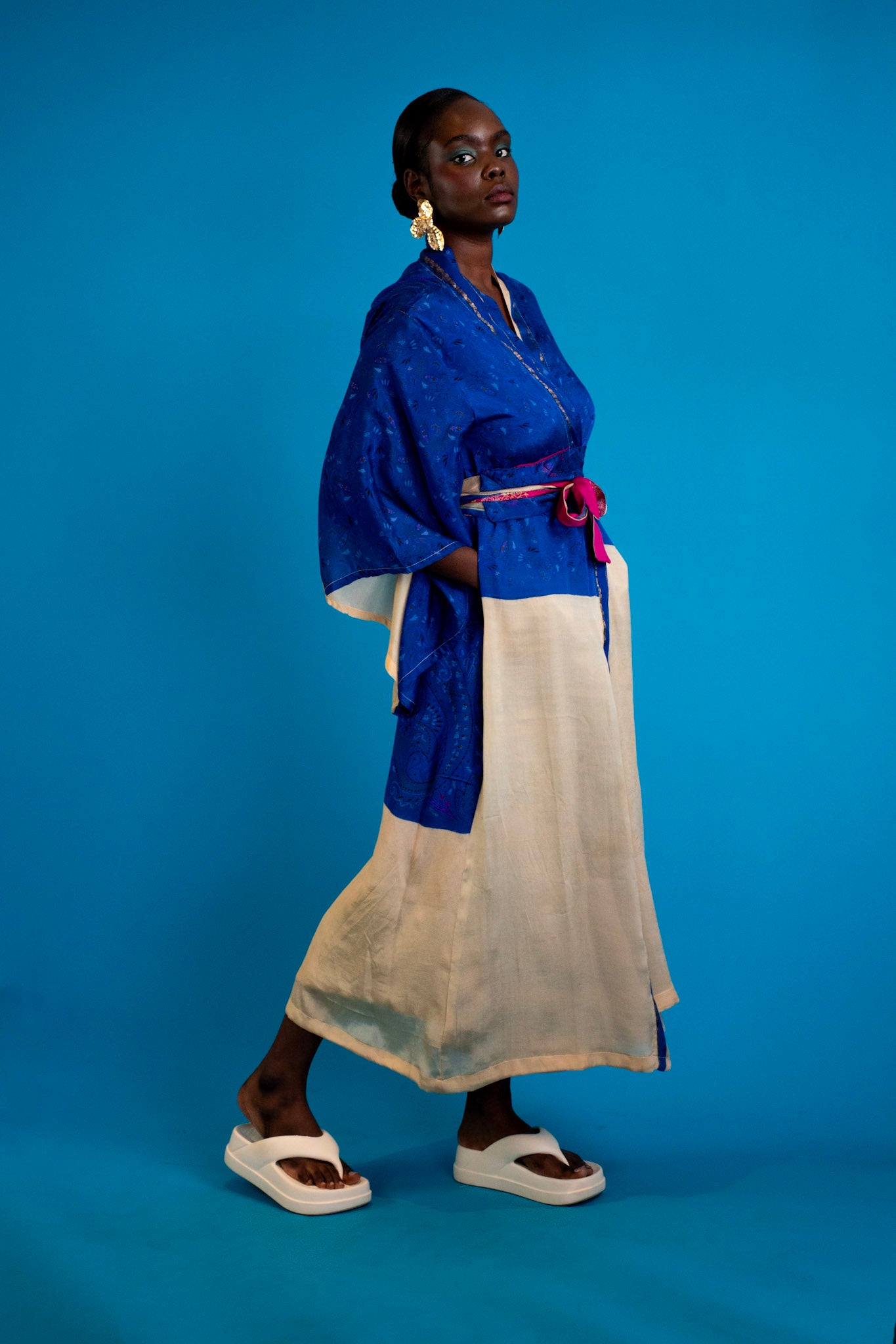 Inspired by the elegance of the Japanese kimono, this piece reimagines tradition through the lens of Indian textile artistry. In the process, floral silk saris are carefully curated - each chosen for its fine, painterly motifs that echo the quiet grace of Japanese botanical art. The result is a conversation between two art forms: the fluid expressiveness of Indian florals meeting the refined minimalism of Japanese design.