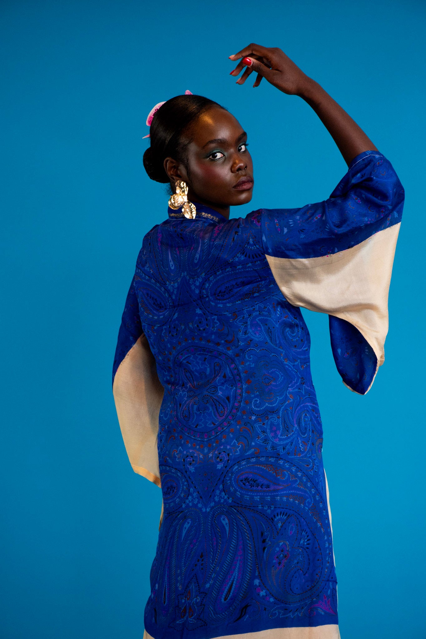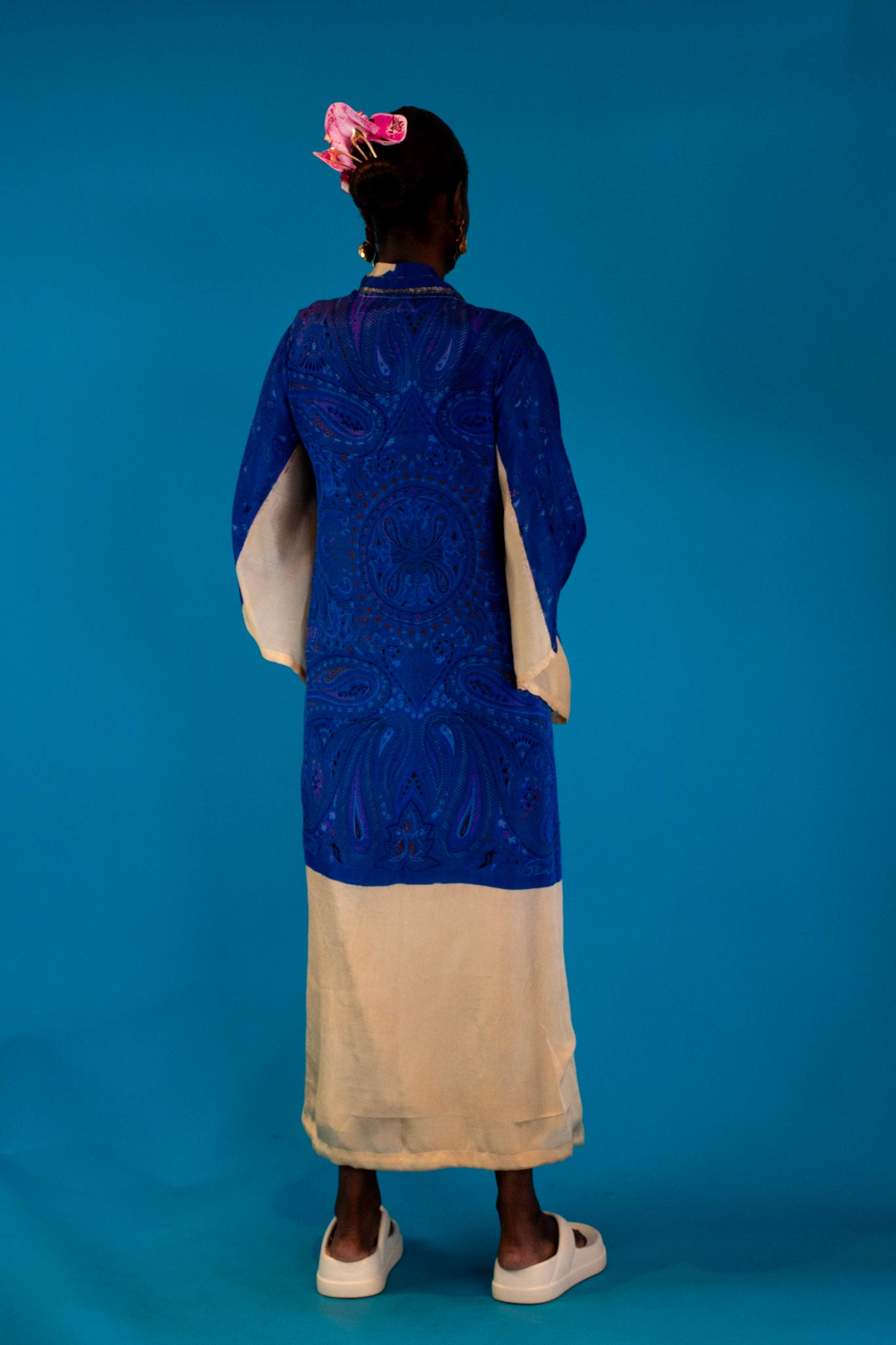 The silhouette drapes effortlessly, capturing both softness and structure - a statement of cultural harmony and timeless sophistication.