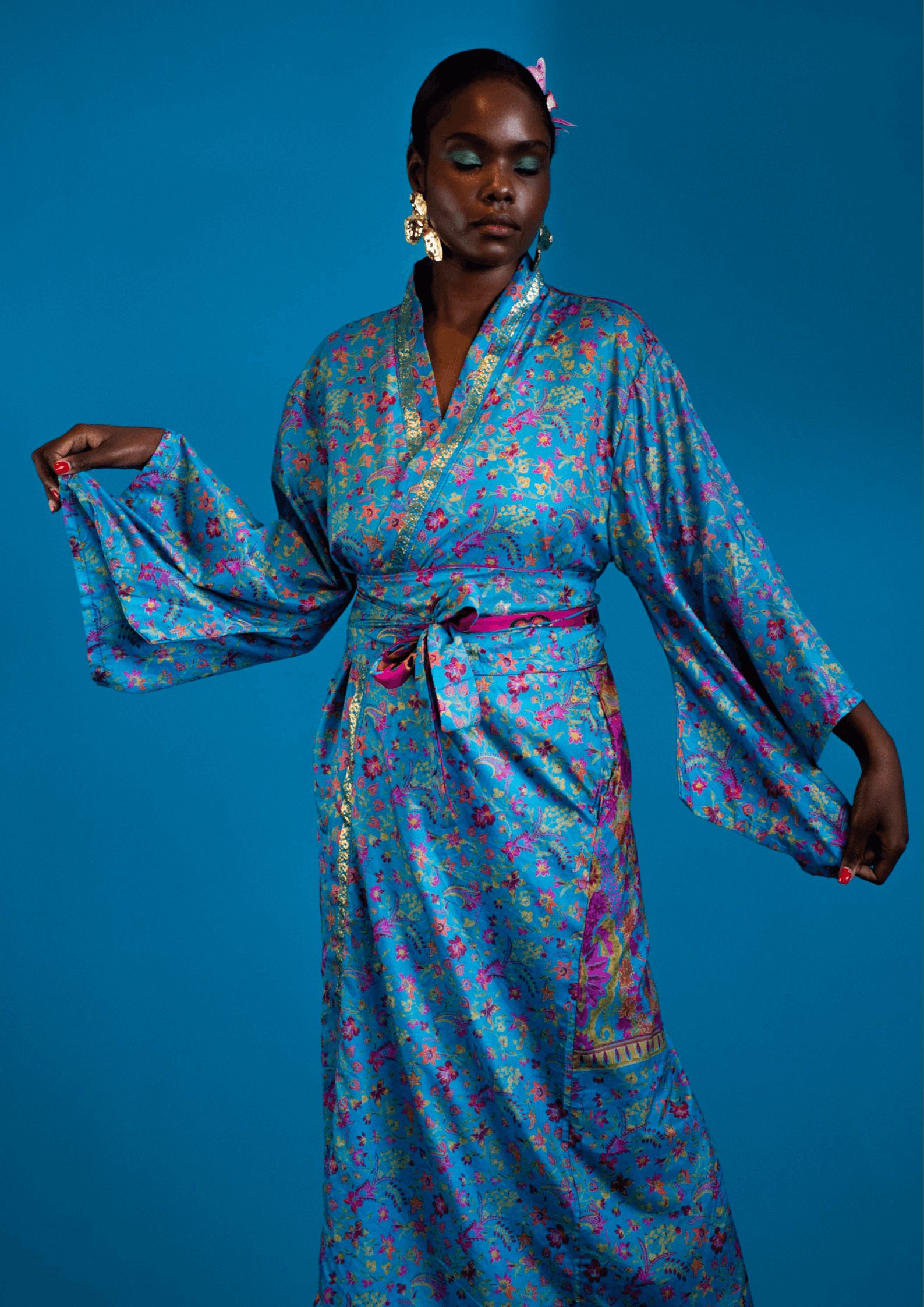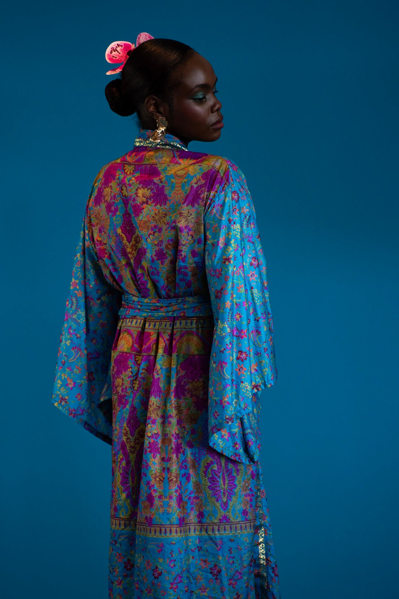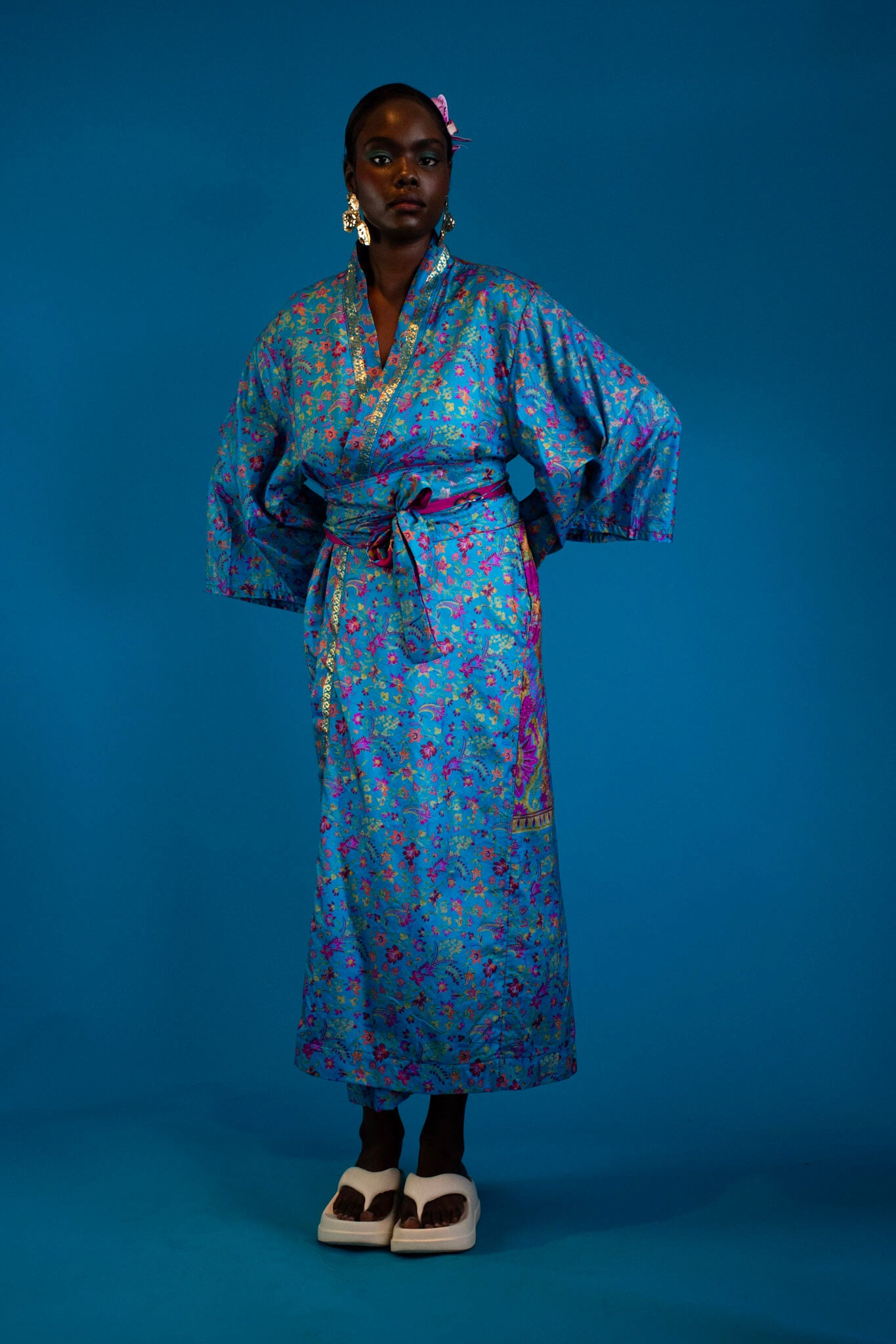 Inspired by the elegance of the Japanese kimono, this piece reimagines tradition through the lens of Indian textile artistry. In the process, floral silk saris are carefully curated - each chosen for its fine, painterly motifs that echo the quiet grace of Japanese botanical art. The result is a conversation between two art forms: the fluid expressiveness of Indian florals meeting the refined minimalism of Japanese design.