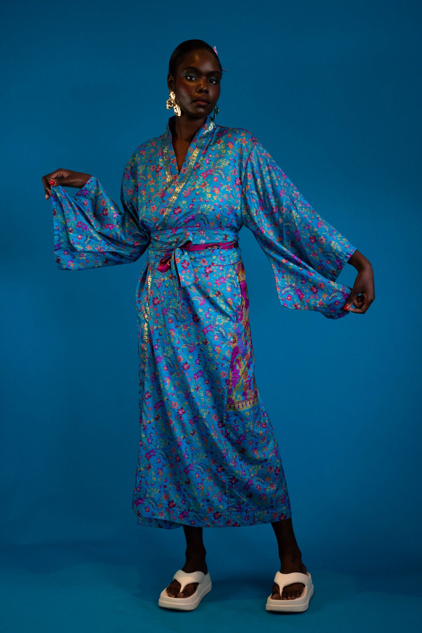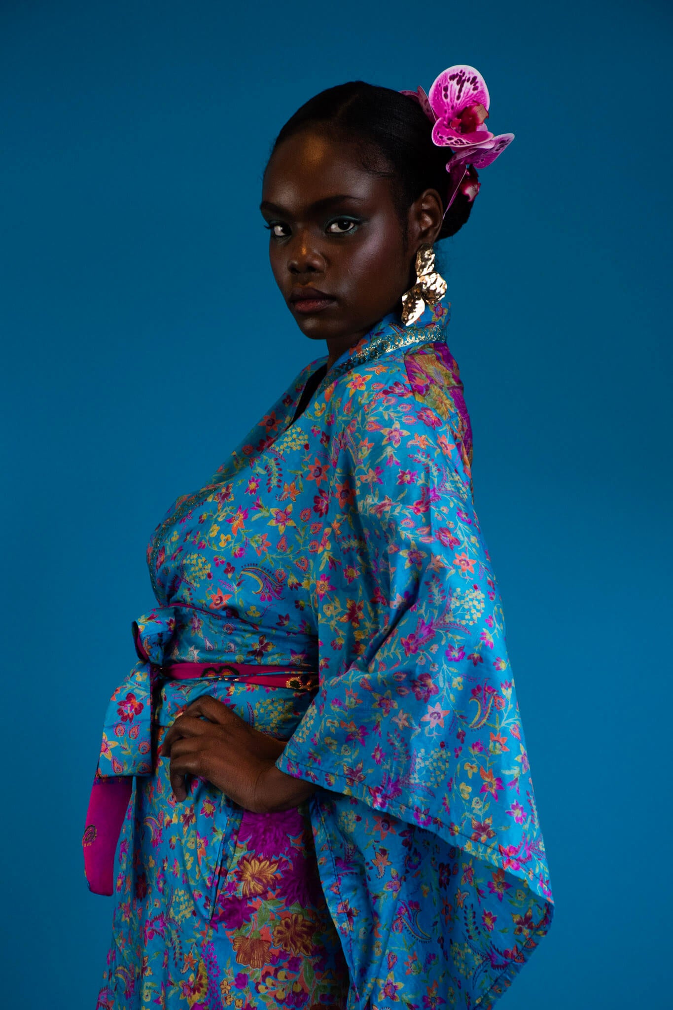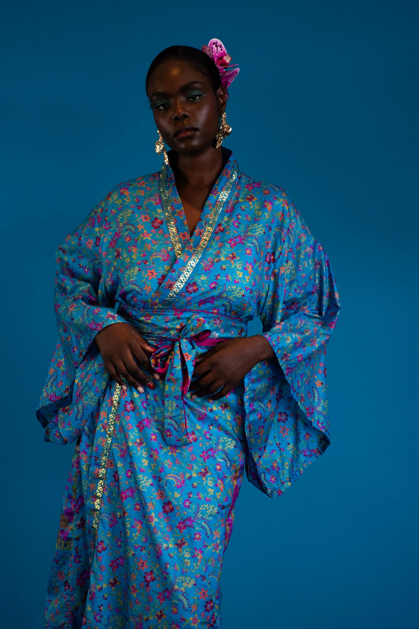 Inspired by the elegance of the Japanese kimono, this piece reimagines tradition through the lens of Indian textile artistry. In the process, floral silk saris are carefully curated - each chosen for its fine, painterly motifs that echo the quiet grace of Japanese botanical art. The result is a conversation between two art forms: the fluid expressiveness of Indian florals meeting the refined minimalism of Japanese design.