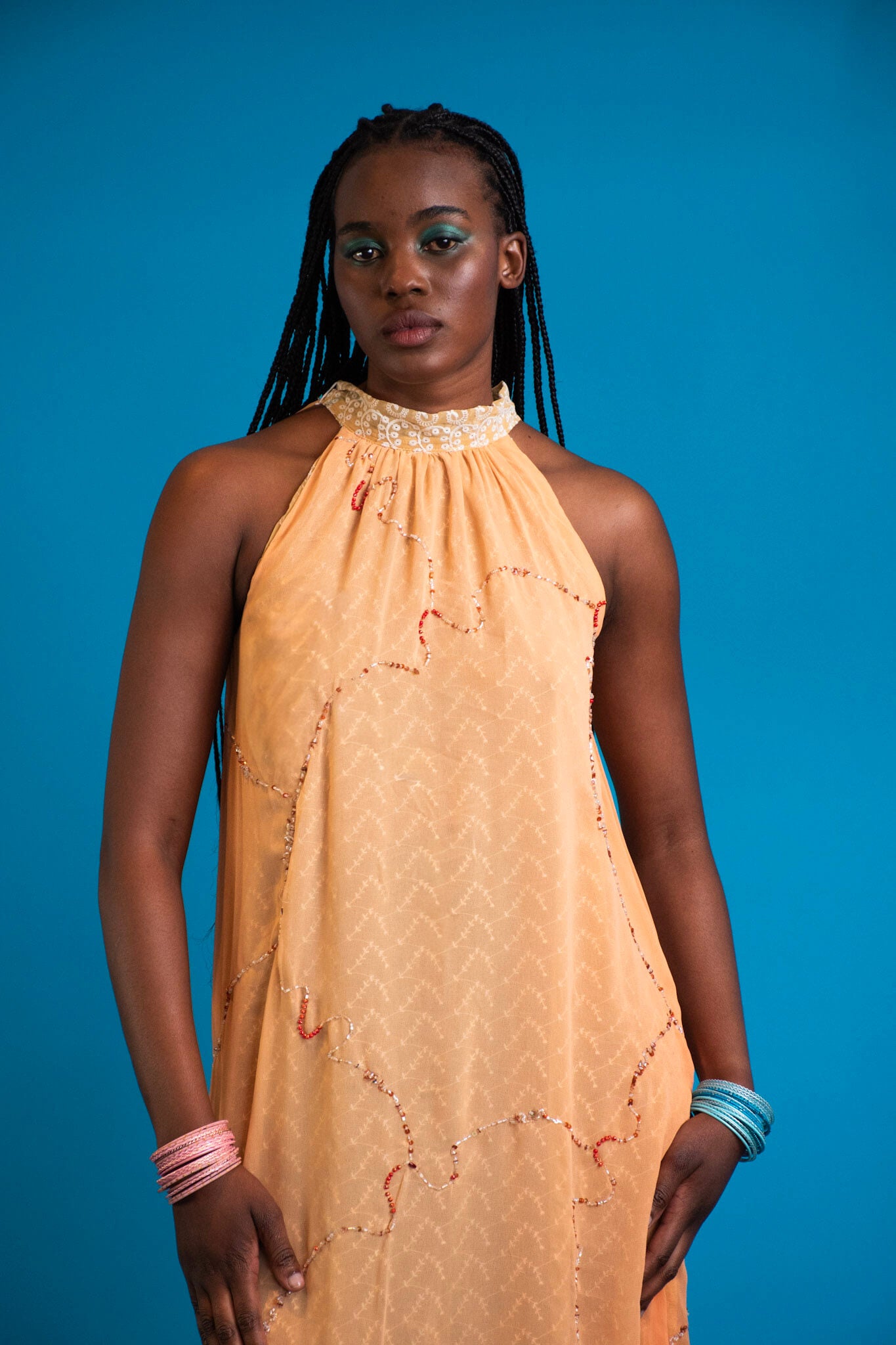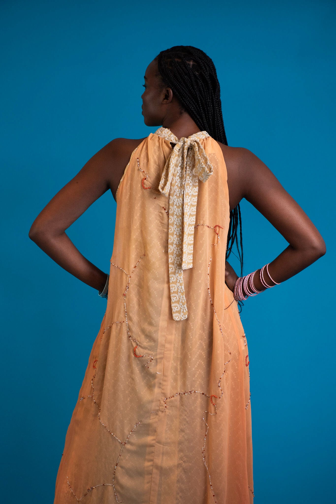 A celebration of colour and light, this halter neck chiffon reversible dress captures the dream of endless summer. Crafted from printed chiffon and reverse-beaded detailing, each piece shimmers softly as you move - a touch of glam woven into effortless ease.