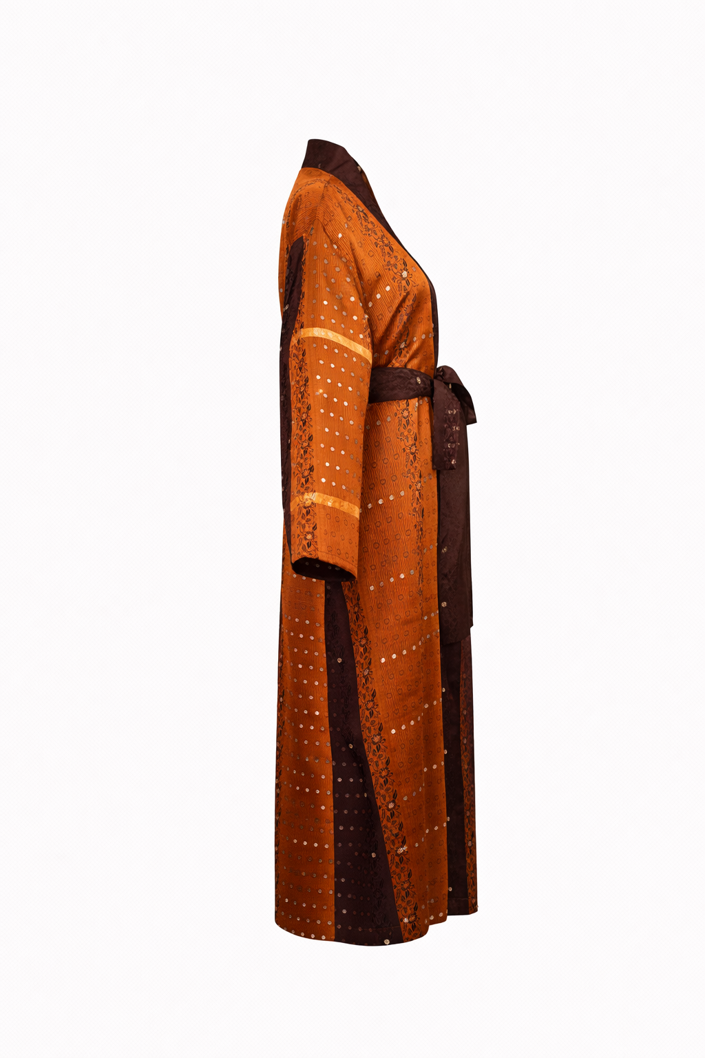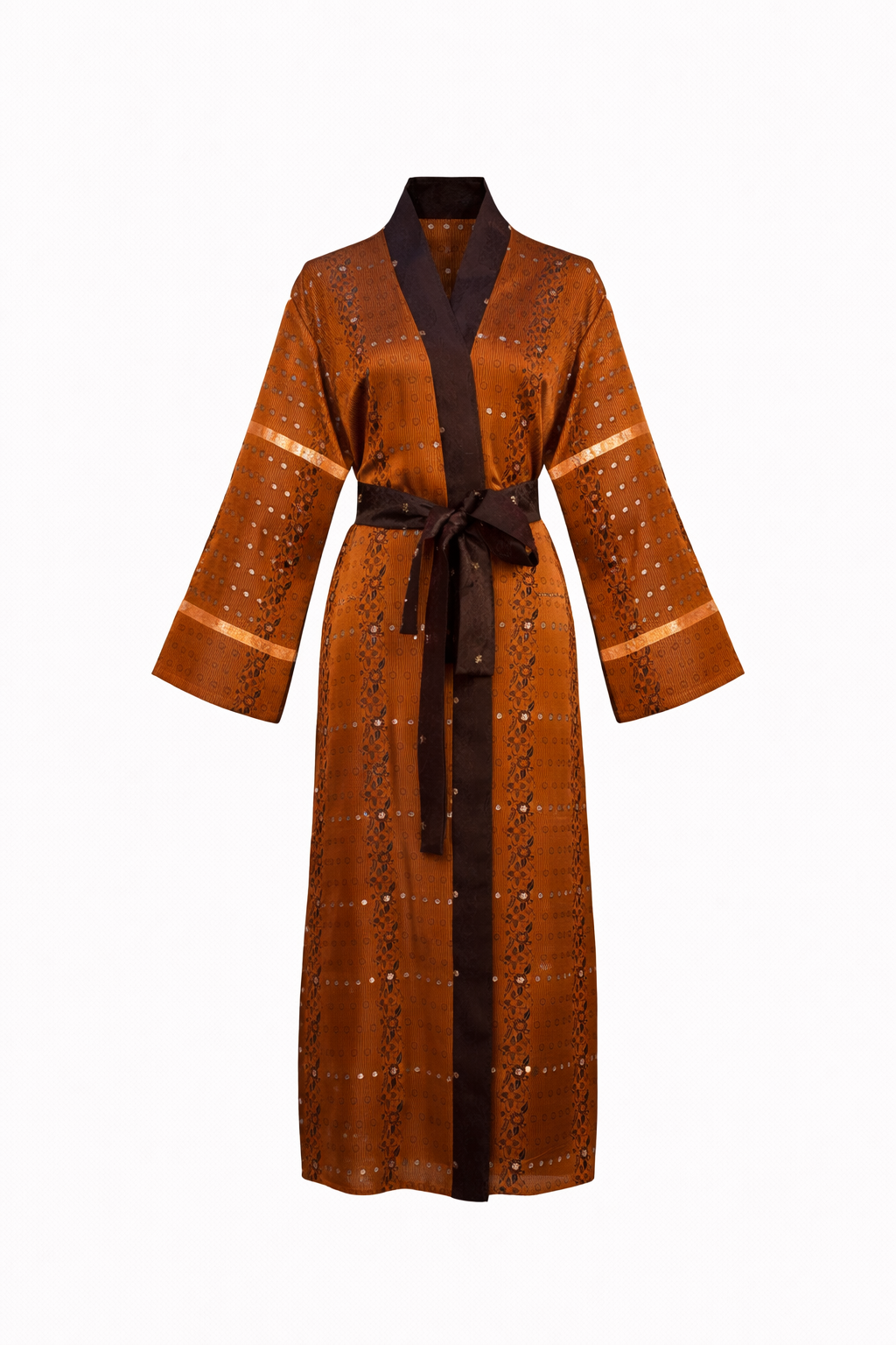 Crafted from lightweight, fluid silk, this kimono features a warm rust-brown base layered with vertical dotted and lace-like motifs, subtly interspersed with soft metallic accents. The patterning is inspired by traditional sari textiles, creating depth and rhythm while maintaining a refined, understated elegance.