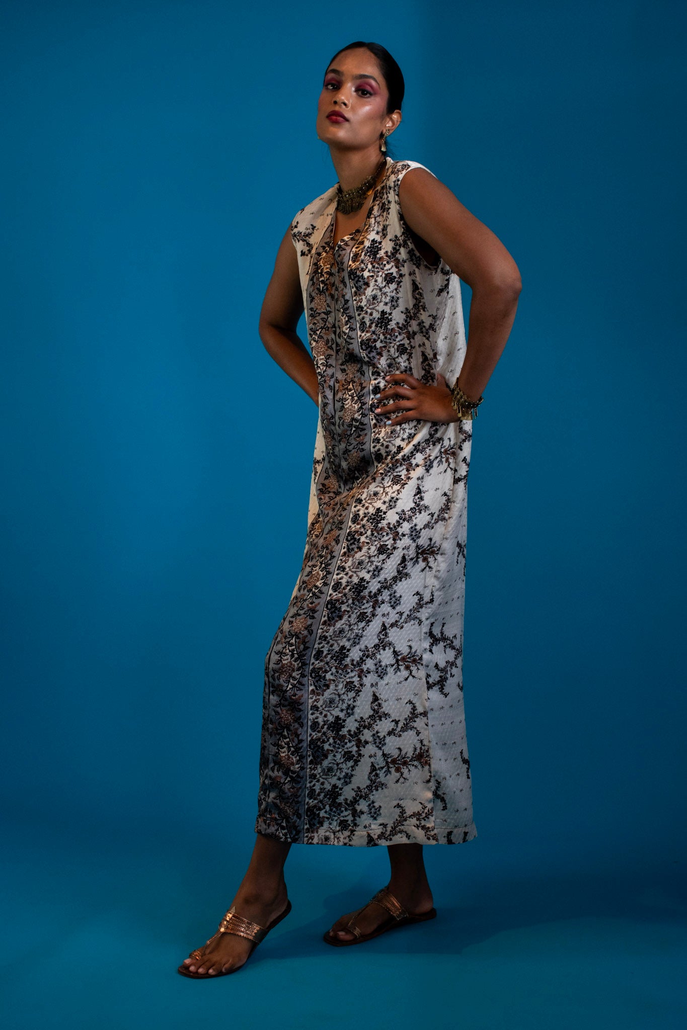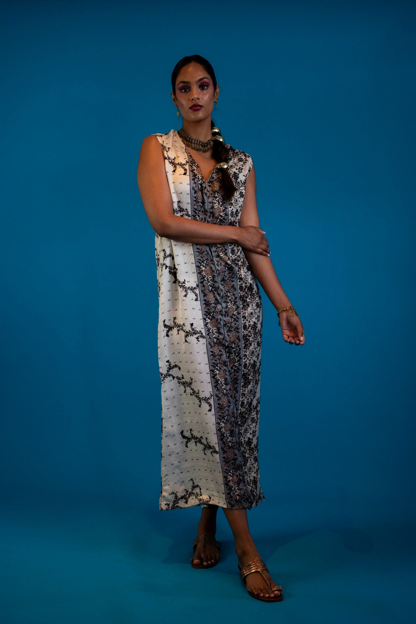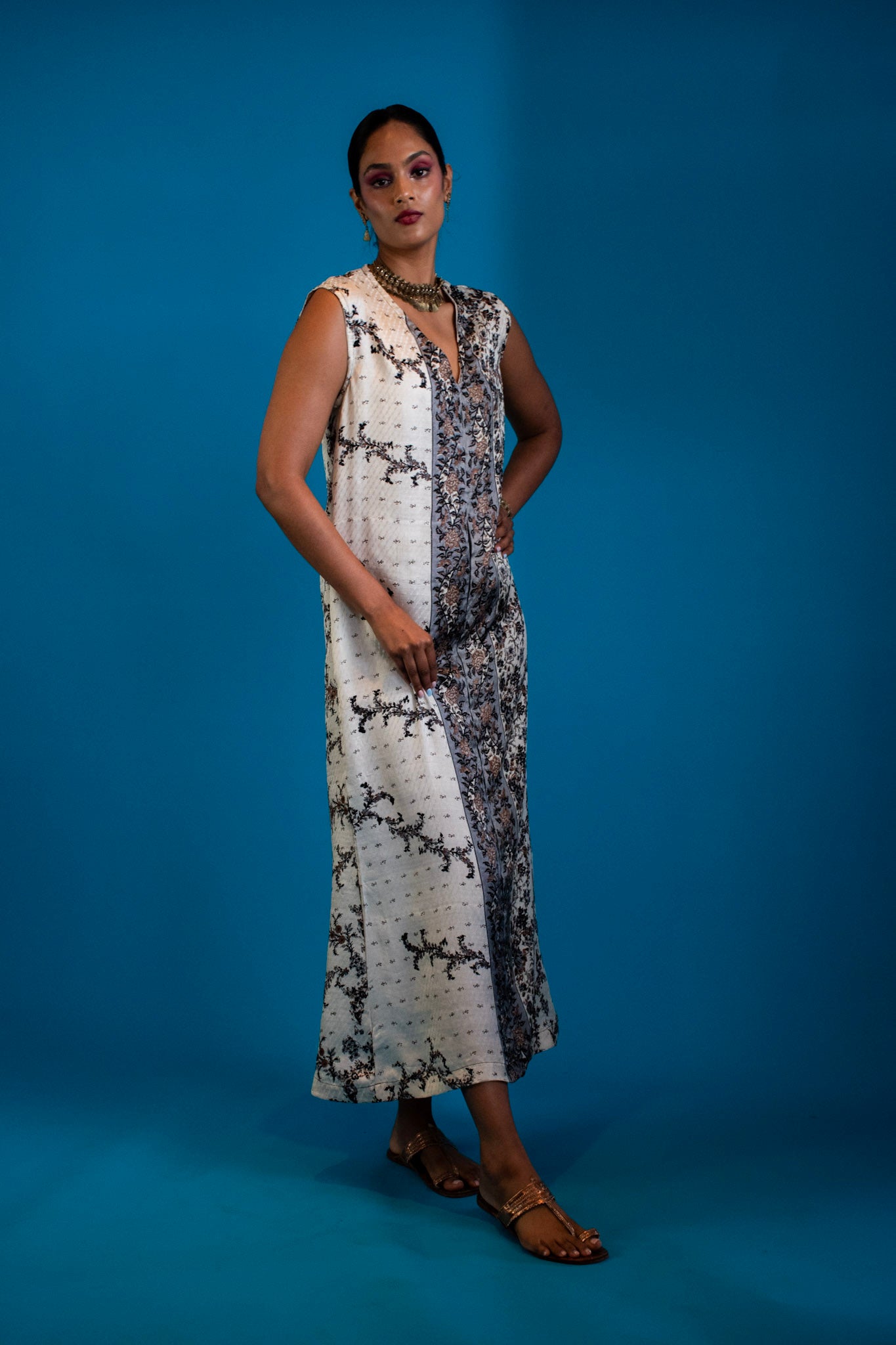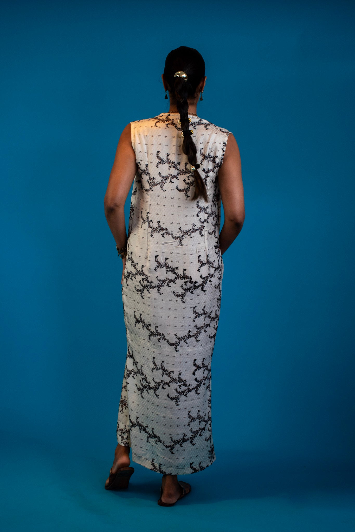 This silk dress showcases that artistry through richer texture and soft, painterly motifs. Cut in a streamlined, tunic-inspired silhouette, refined, flattering, and effortless to wear. Lightweight silk gives gentle movement, while the structured neckline and clean finish create a polished everyday elegance.