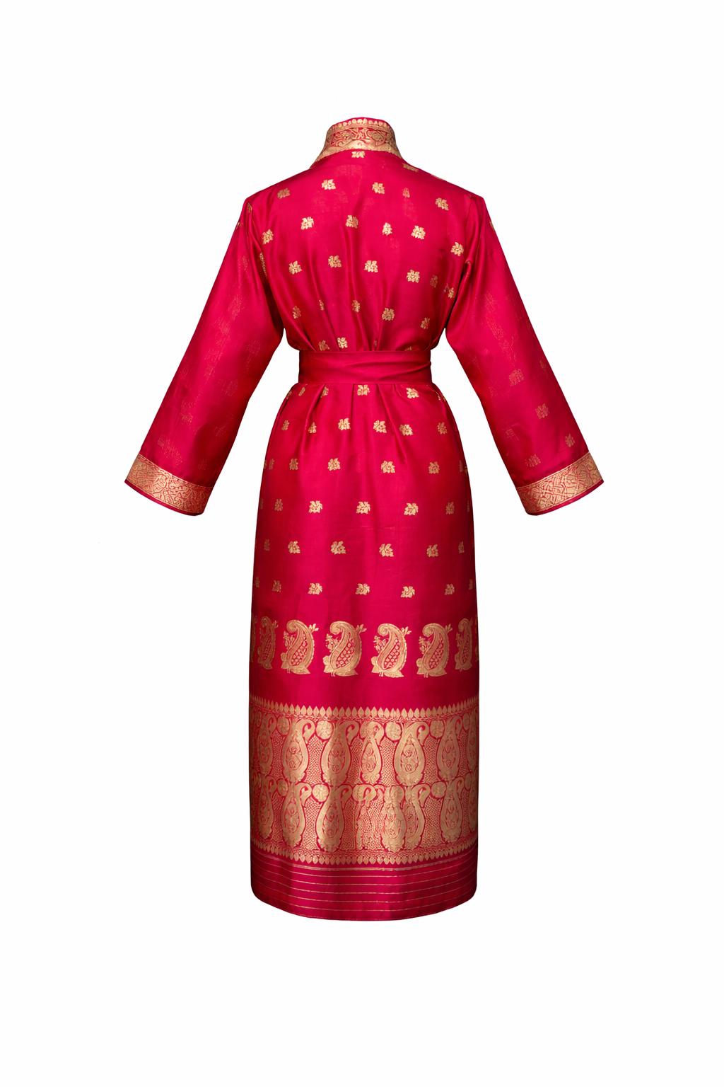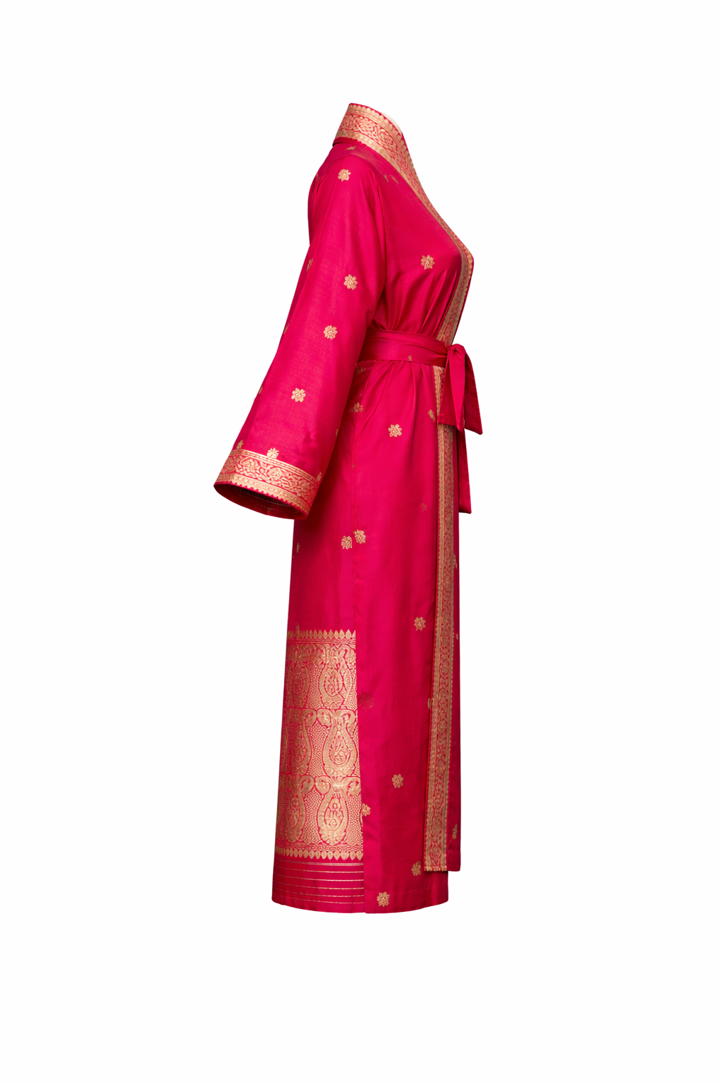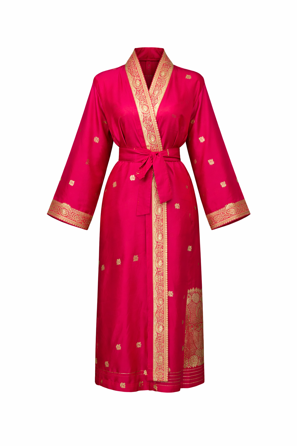 Banarasi silk sari, this kimono carries a legacy of opulence and ceremonial dress. The silk is rich and substantial, woven with fine gold embroidery that glows softly against a vivid fuchsia base - ornamental yet balanced. Traditional motifs are woven directly into the fabric, a hallmark of Banarasi craftsmanship long associated with royalty and celebration.