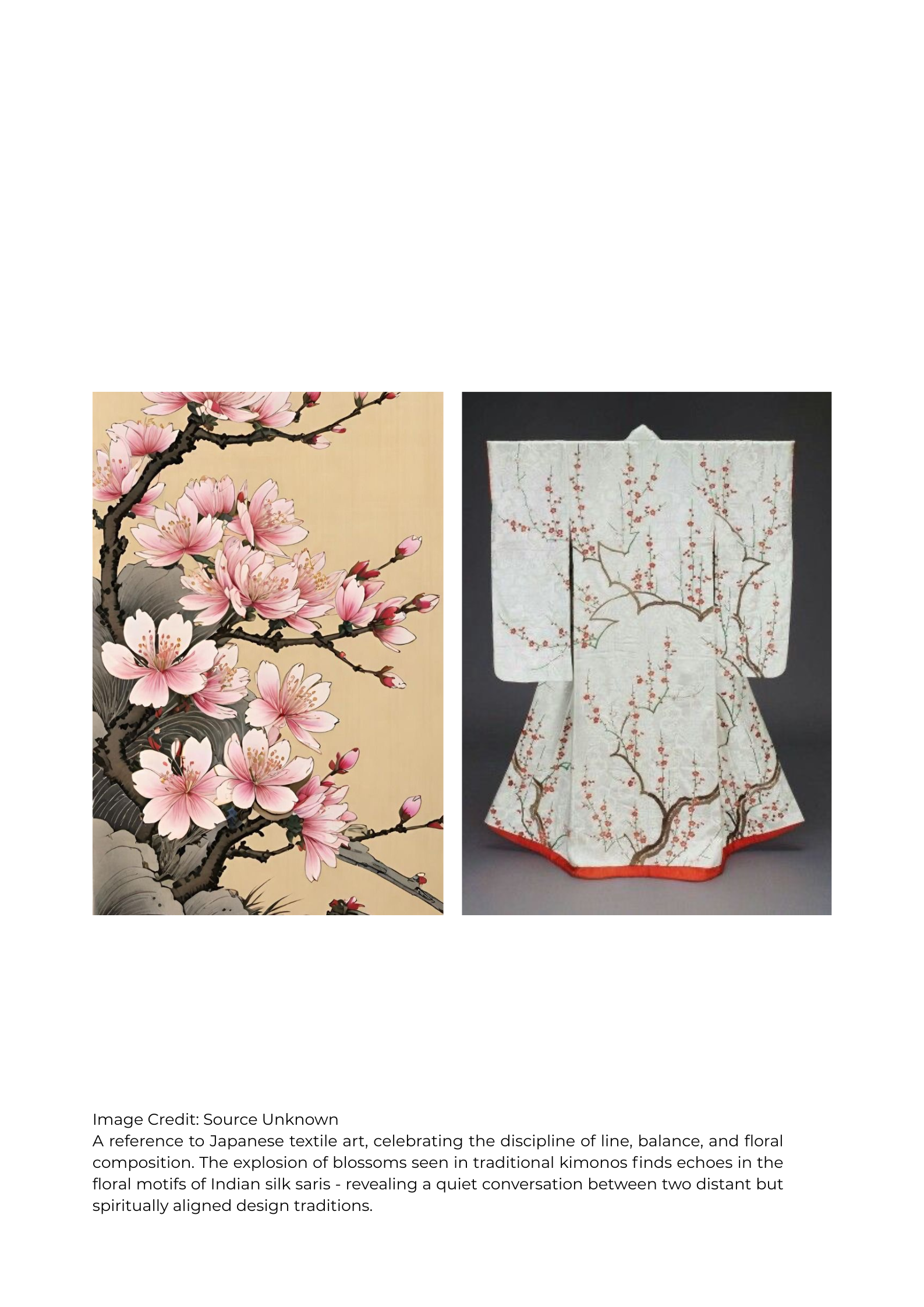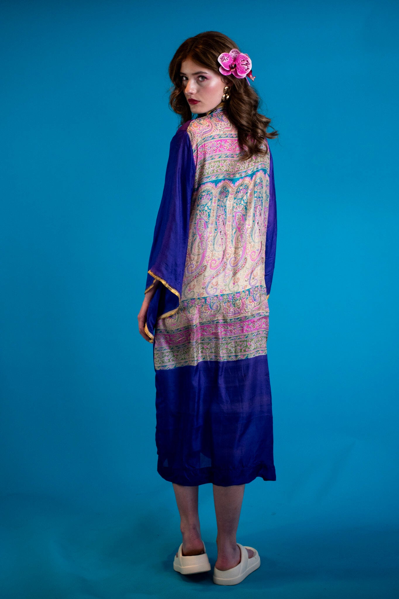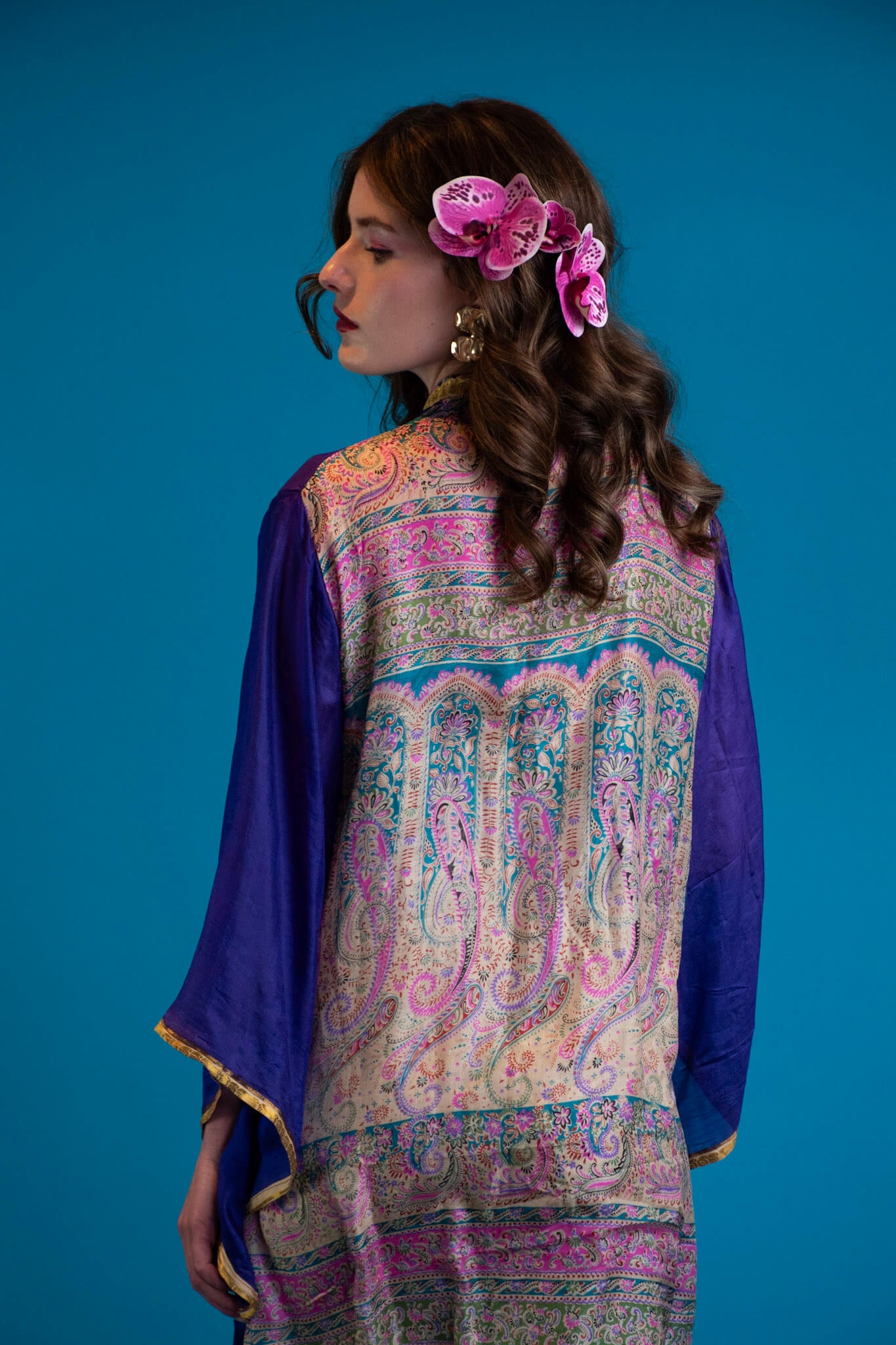Inspired by the elegance of the Japanese kimono, this piece reimagines tradition through the lens of Indian textile artistry. In the process, floral silk saris are carefully curated - each chosen for its fine, painterly motifs that echo the quiet grace of Japanese botanical art. The result is a conversation between two art forms: the fluid expressiveness of Indian florals meeting the refined minimalism of Japanese design.