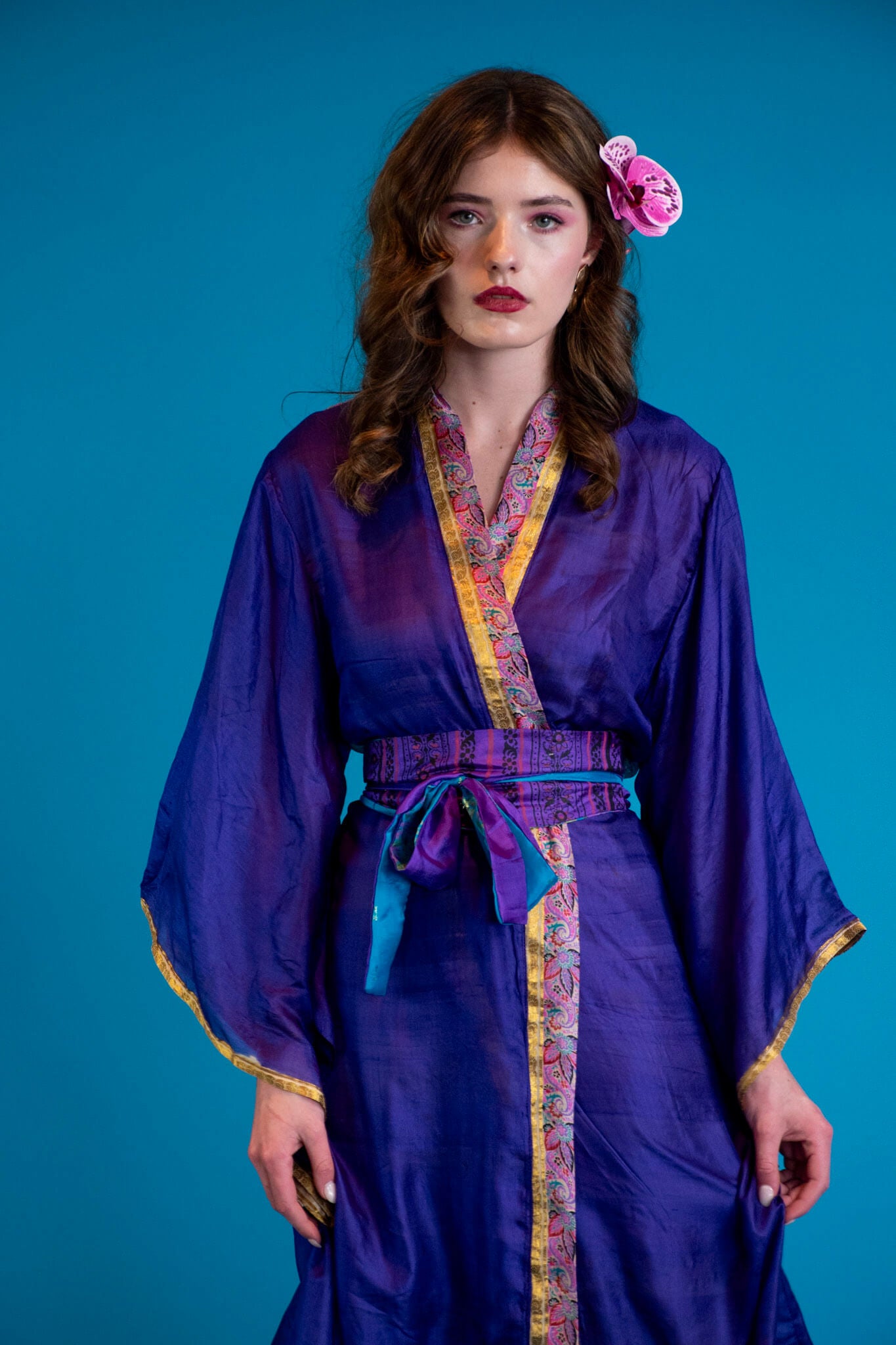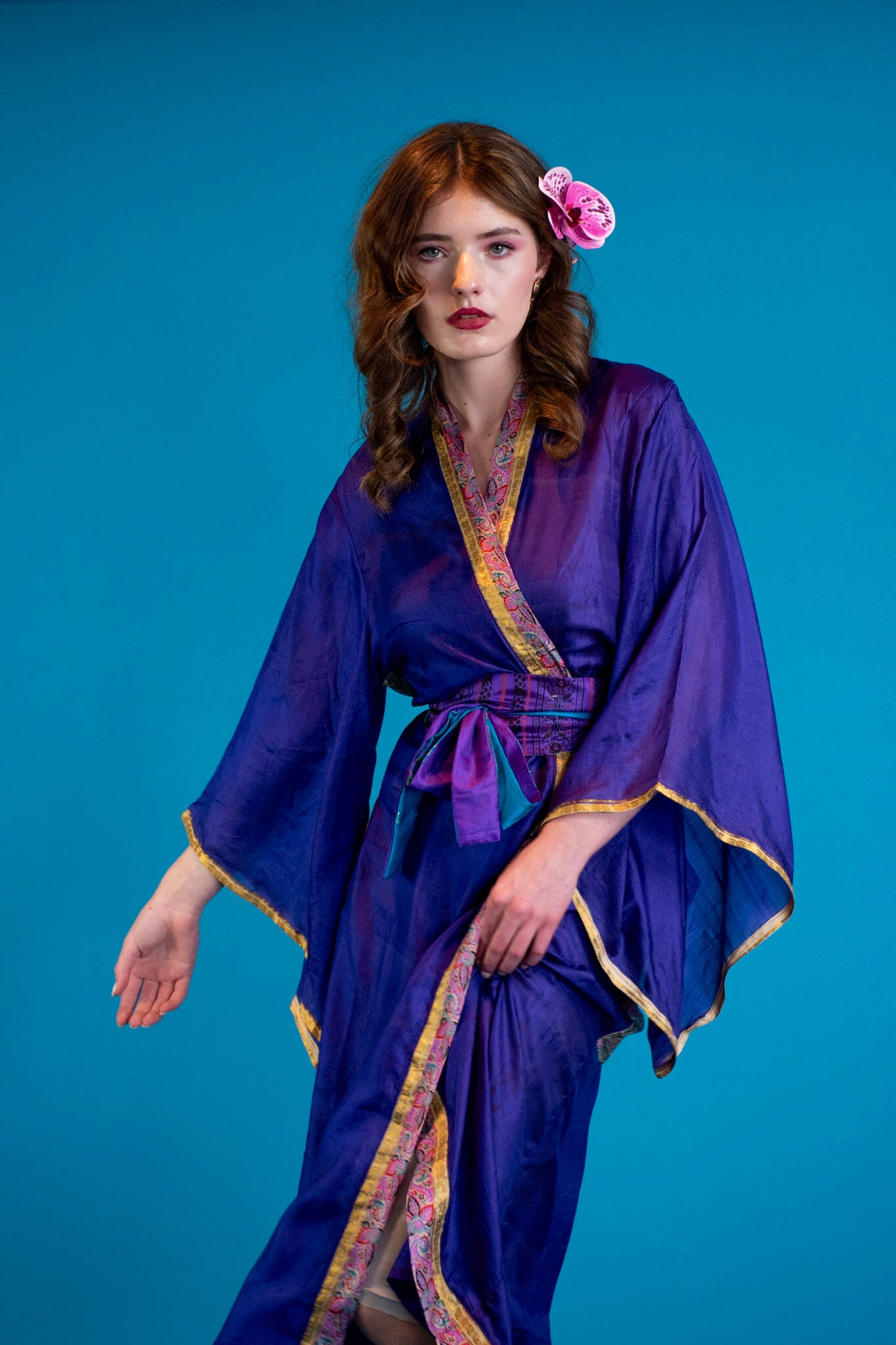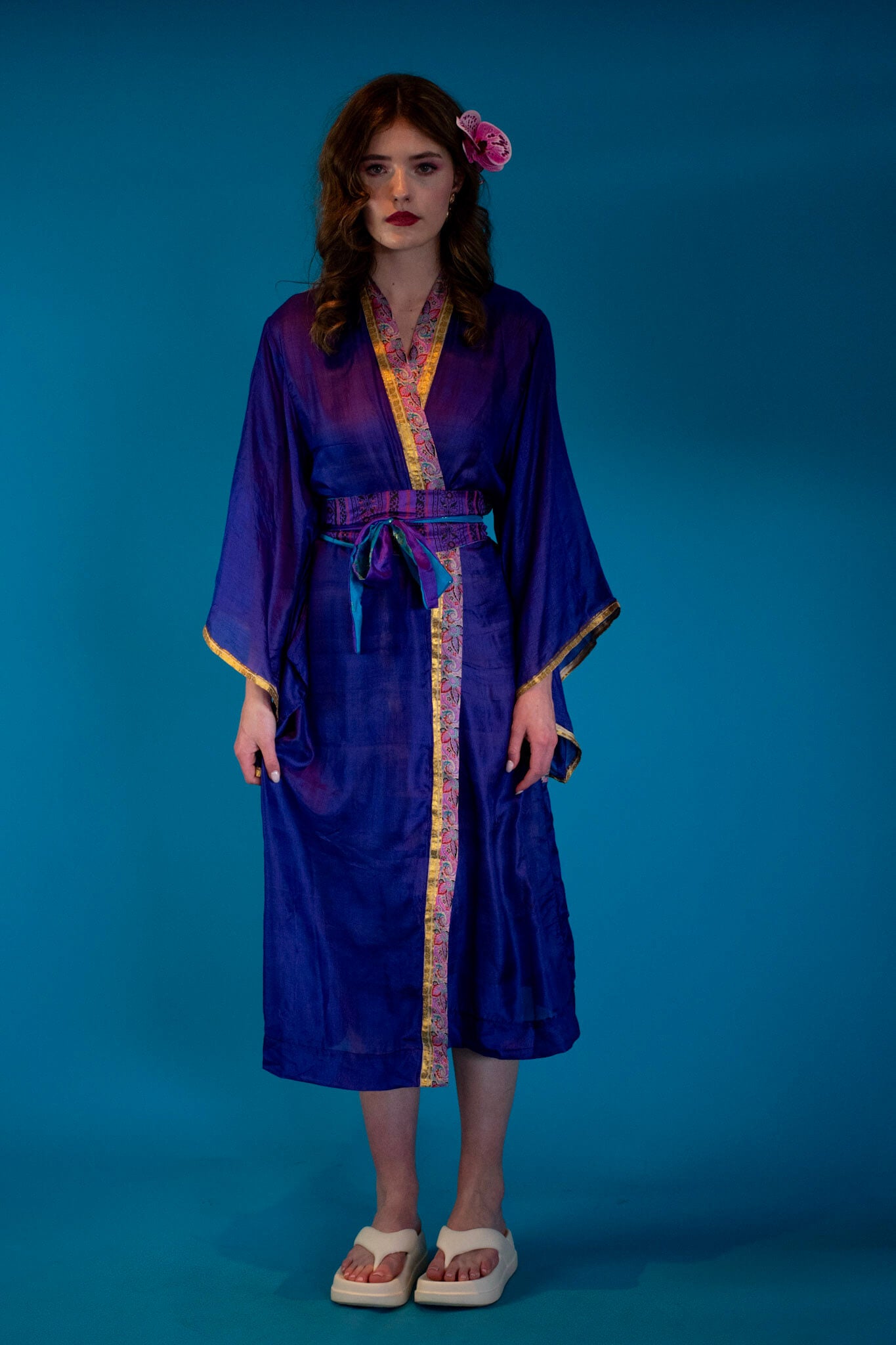 Inspired by the elegance of the Japanese kimono, this piece reimagines tradition through the lens of Indian textile artistry. In the process, floral silk saris are carefully curated - each chosen for its fine, painterly motifs that echo the quiet grace of Japanese botanical art. The result is a conversation between two art forms: the fluid expressiveness of Indian florals meeting the refined minimalism of Japanese design.