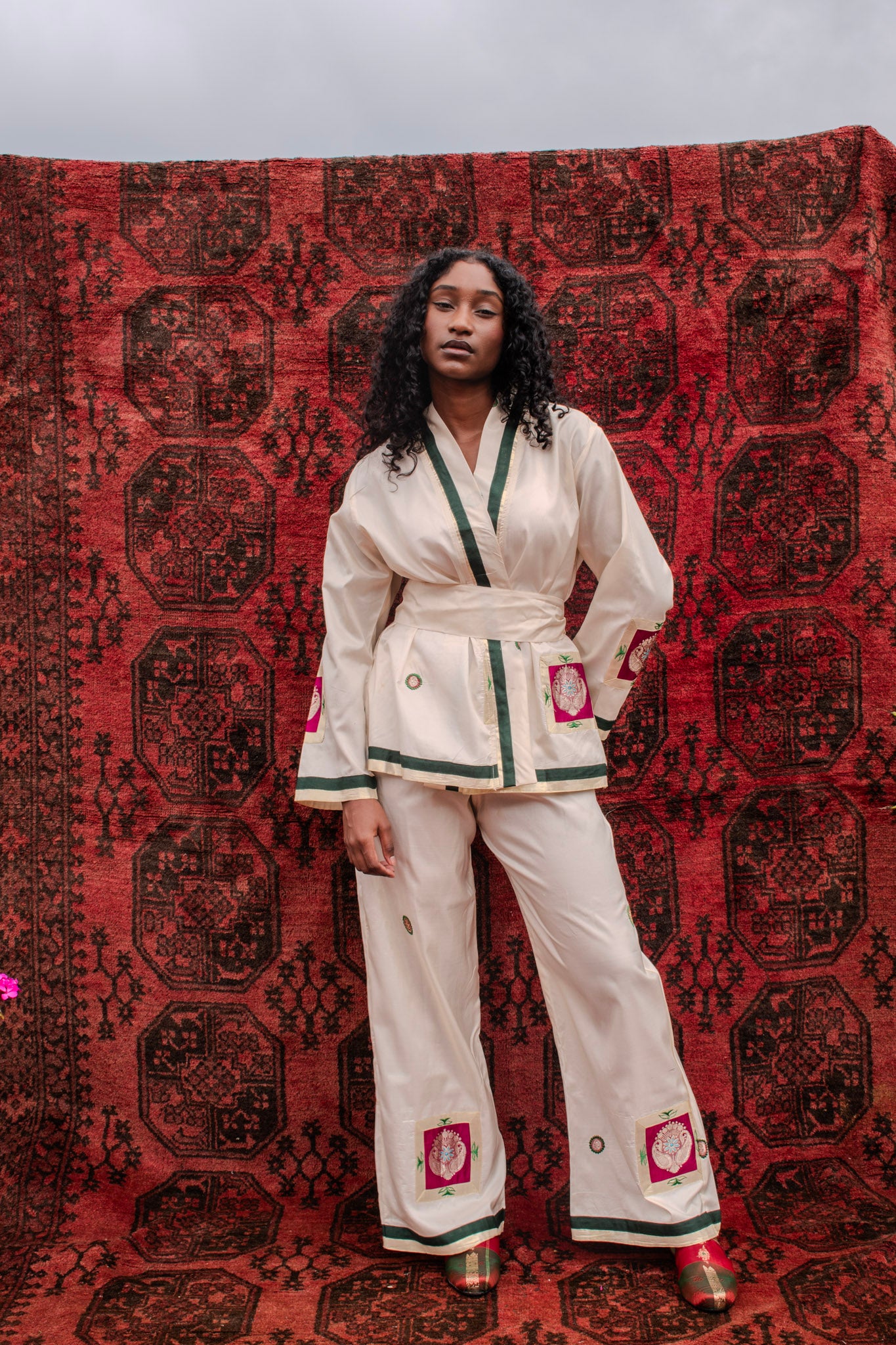 The set features a wrap-style jacket with a softly defined waist and relaxed sleeves, paired with fluid, elasticated pants designed for comfort and ease. Together, the silhouette feels calm and considered-elevated yet wearable, allowing the silk’s understated beauty to take centre stage.