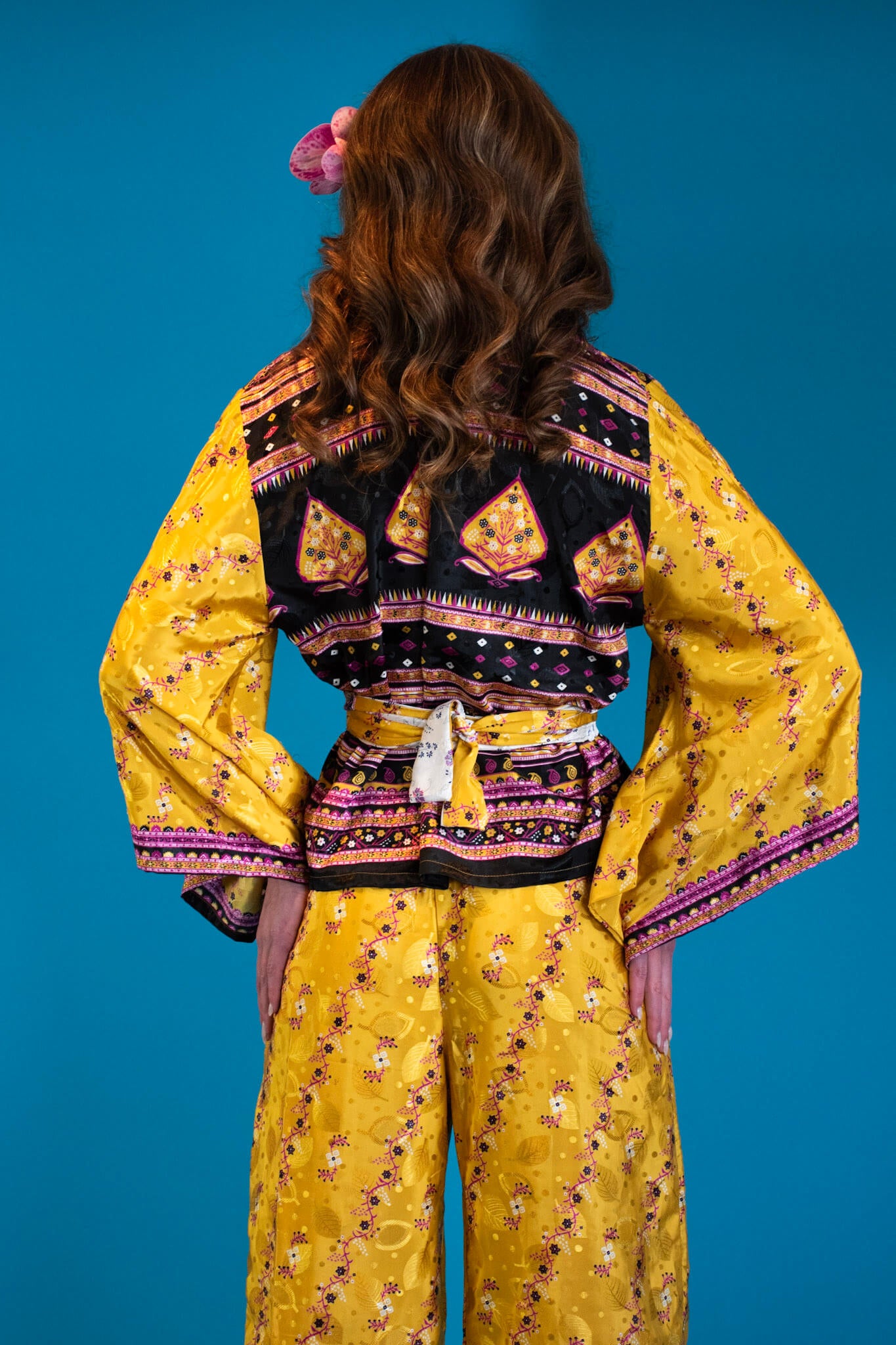 Inspired by the elegance of the Japanese kimono, this kimono jacket and pants set reimagines tradition through the artistry of Indian textiles. Each piece is crafted from carefully curated floral silk saris, selected for their fine, painterly motifs that echo the serene beauty of Japanese botanical art. The result is a refined conversation between cultures - where Indian floral expressiveness meets Japanese Art.