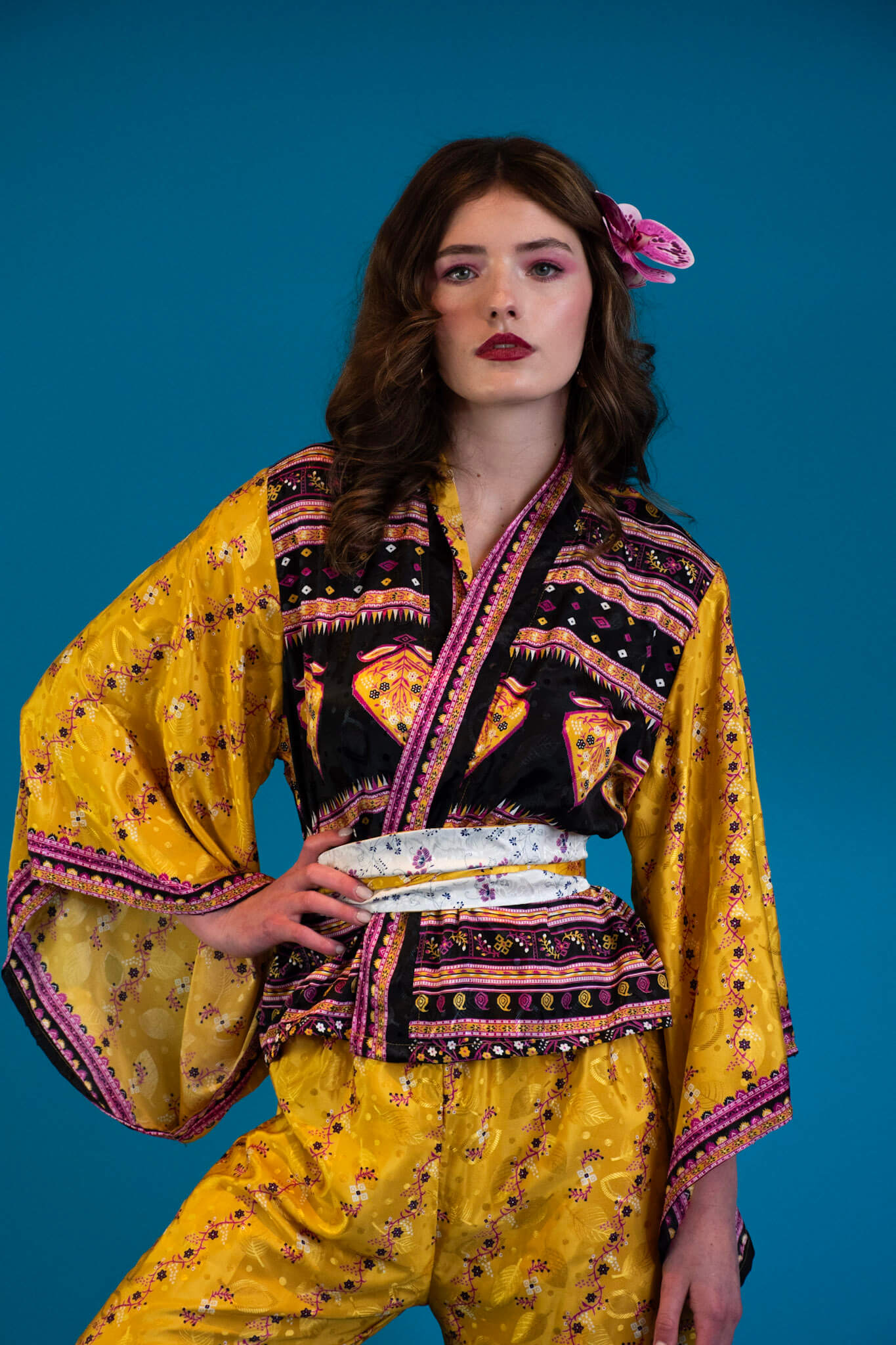 Fabric: Vibrant yellow silk brought to life with an explosion of paisley and floral detailing in shades of black and pink, creating a striking balance of warmth, contrast, and opulent artistry.