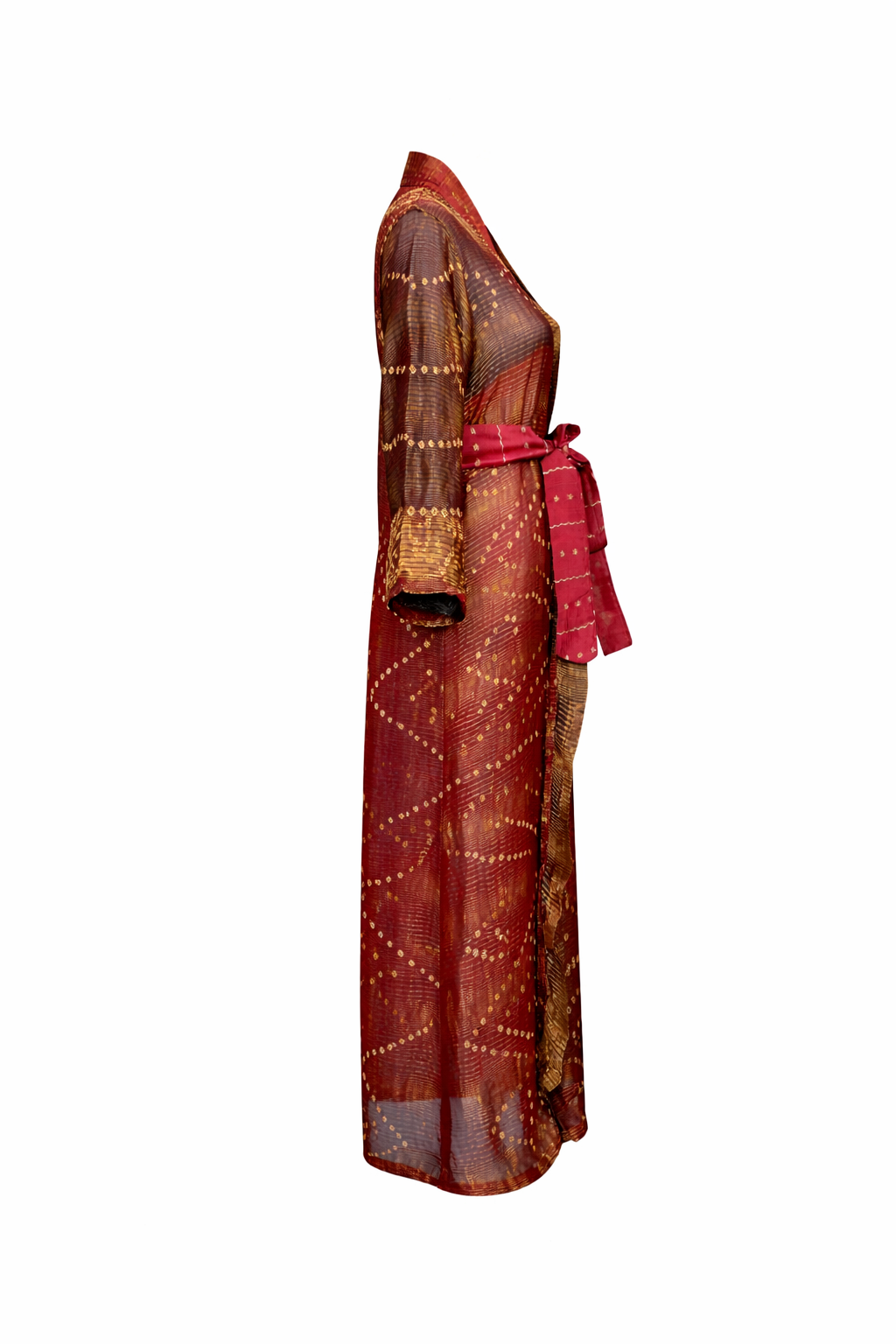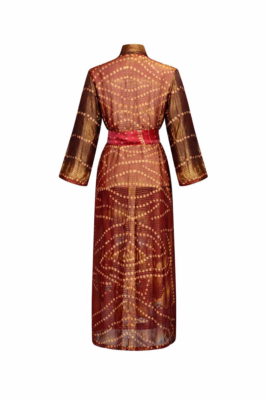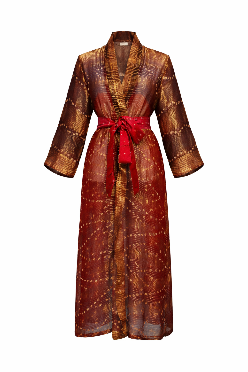 Crafted from lightweight, softly textured silk, this kimono is designed for effortless elegance and fluid movement. Warm rust and amber tones are layered with traditional bandhani-inspired motifs, creating depth and quiet richness across the fabric.