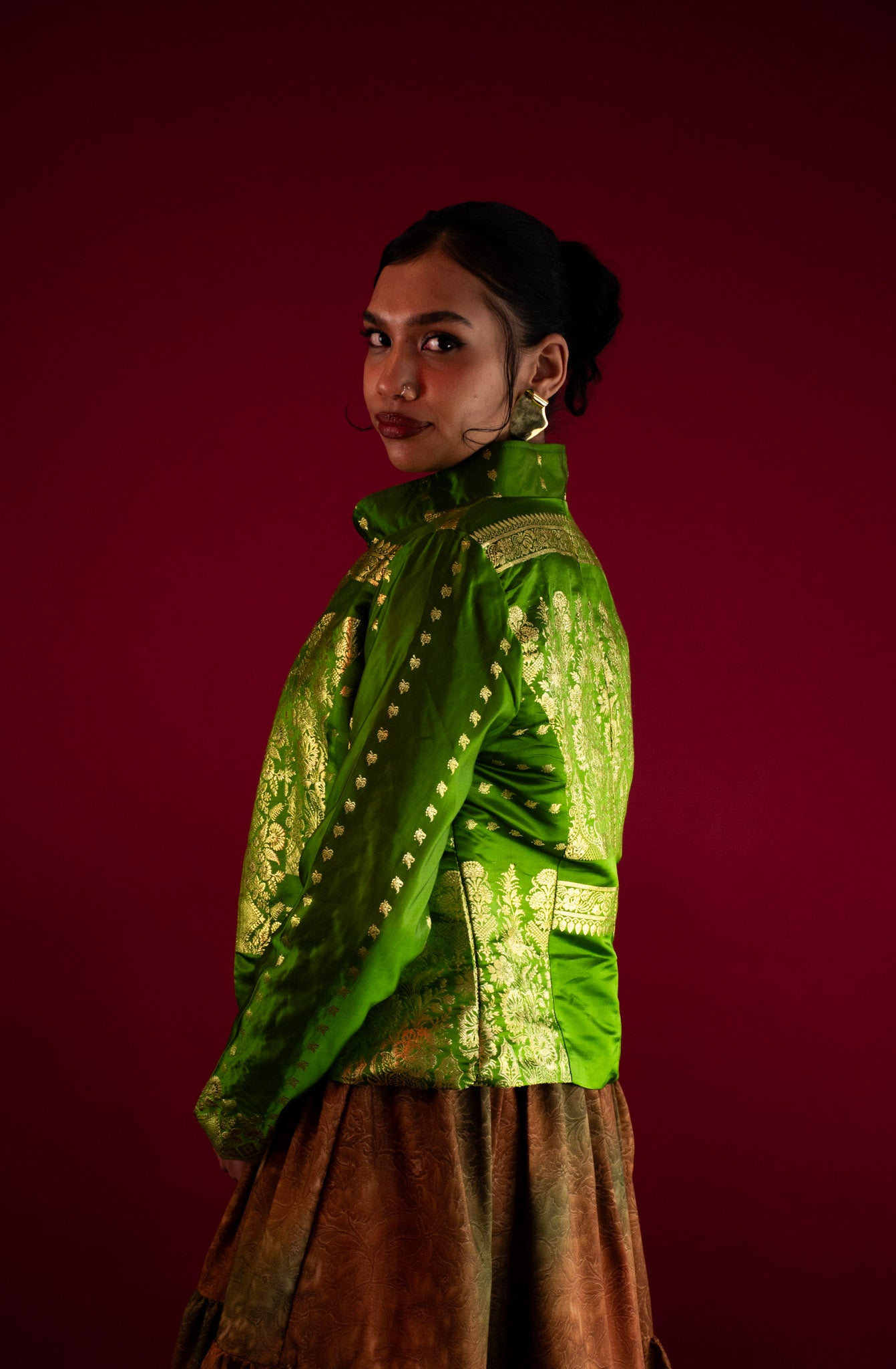 Crafted from rich green silk, the fabric features Banarasi weaving — a traditional North Indian technique known for its luxurious texture and intricate brocade patterns, originally created for royalty. The metallic threadwork is subtle yet regal, woven into silk like stories passed through generations.