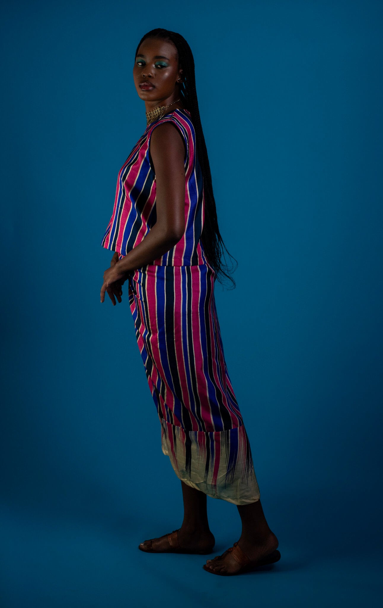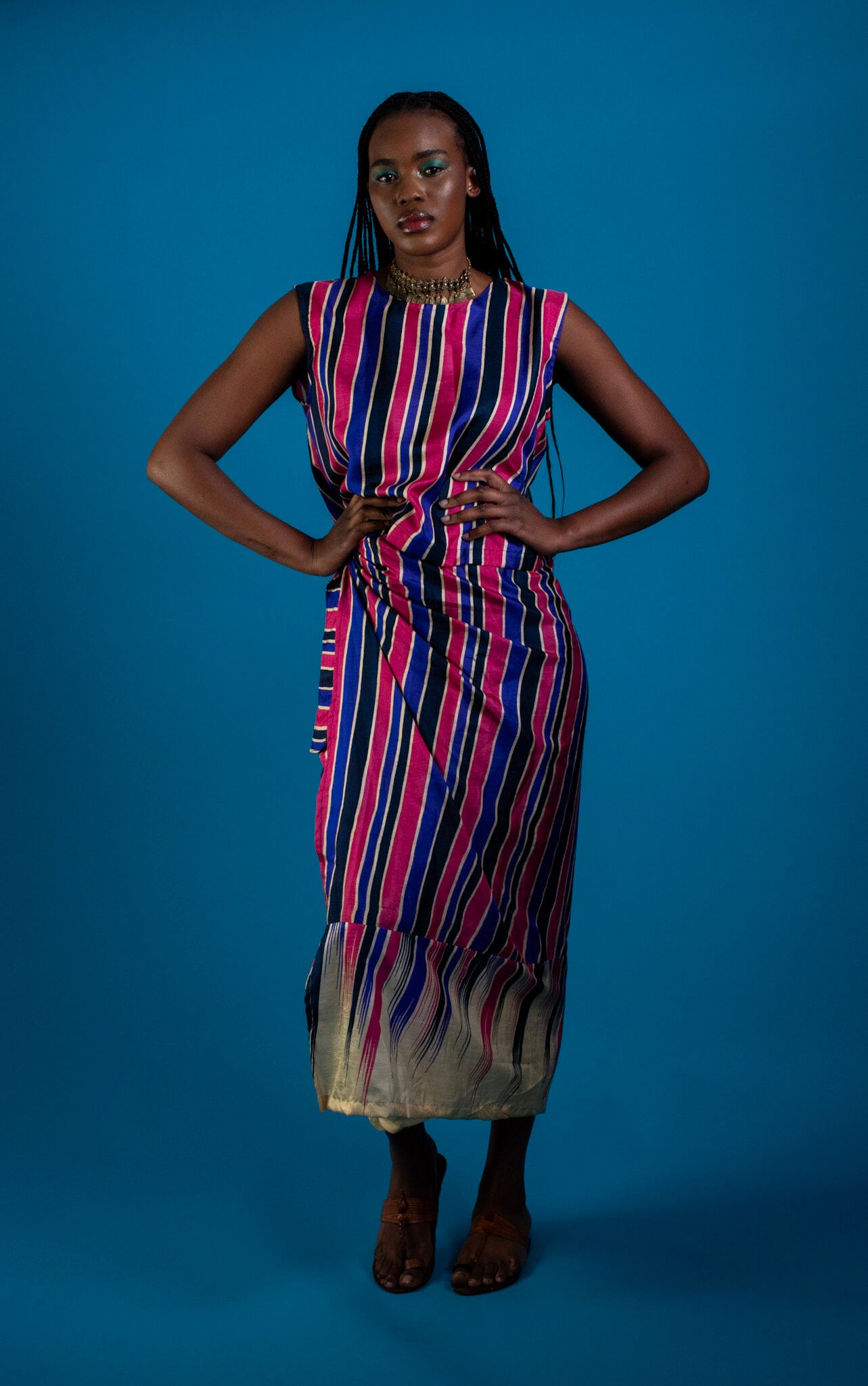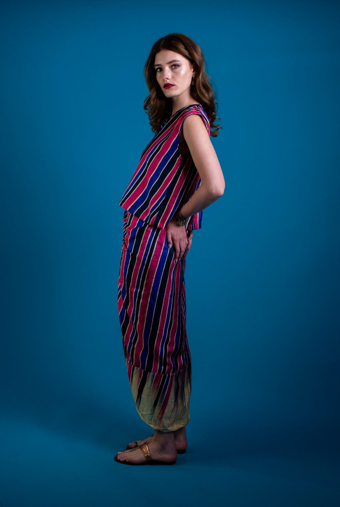 Inspired by Iman Ganijee’s grandfather and the East African khanga, this piece honours the art of wrapping - a gesture of belonging that connects cultures across oceans. Handwoven Madras silk, striped with fine gold detailing, carries a legacy of trade and transformation.