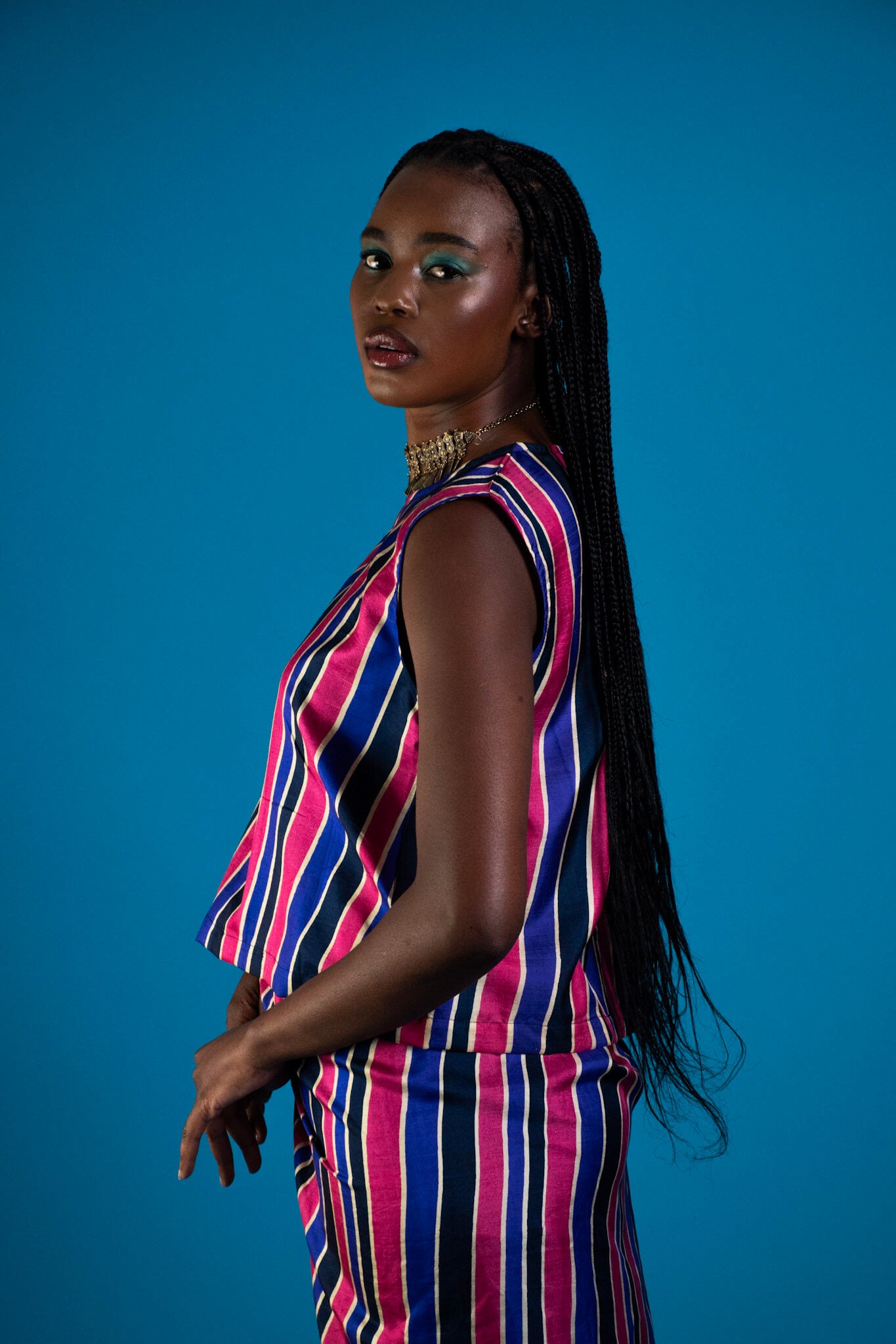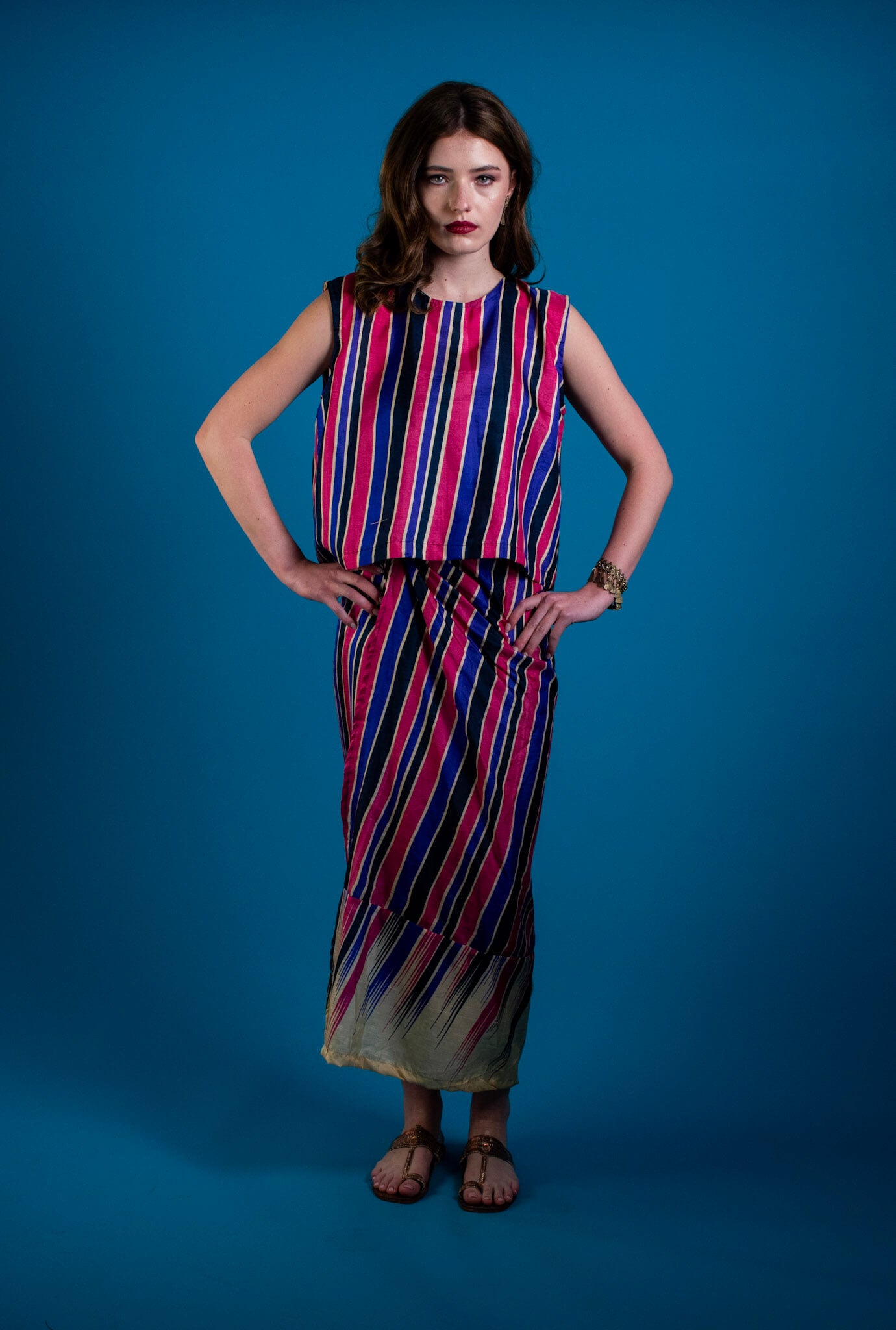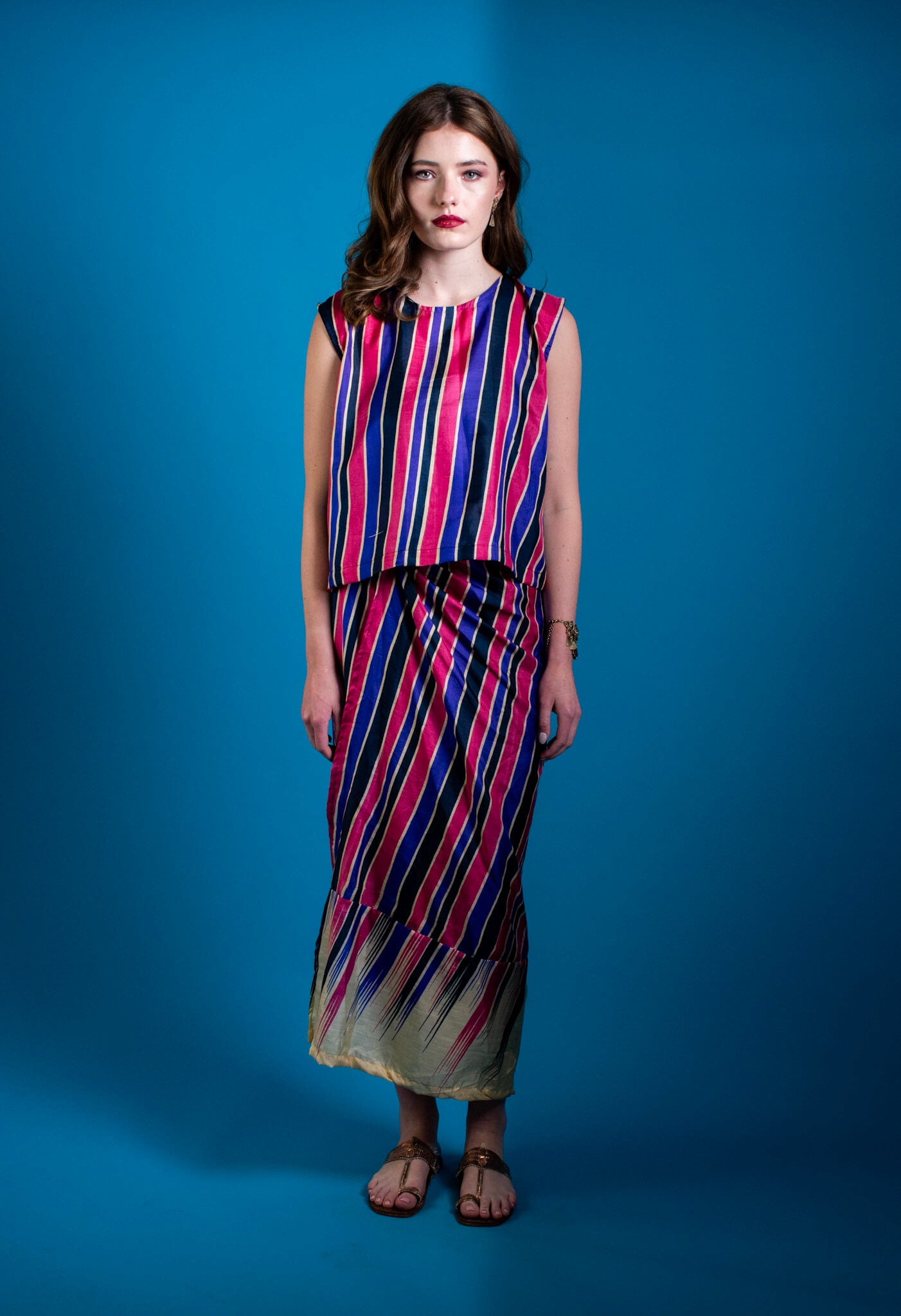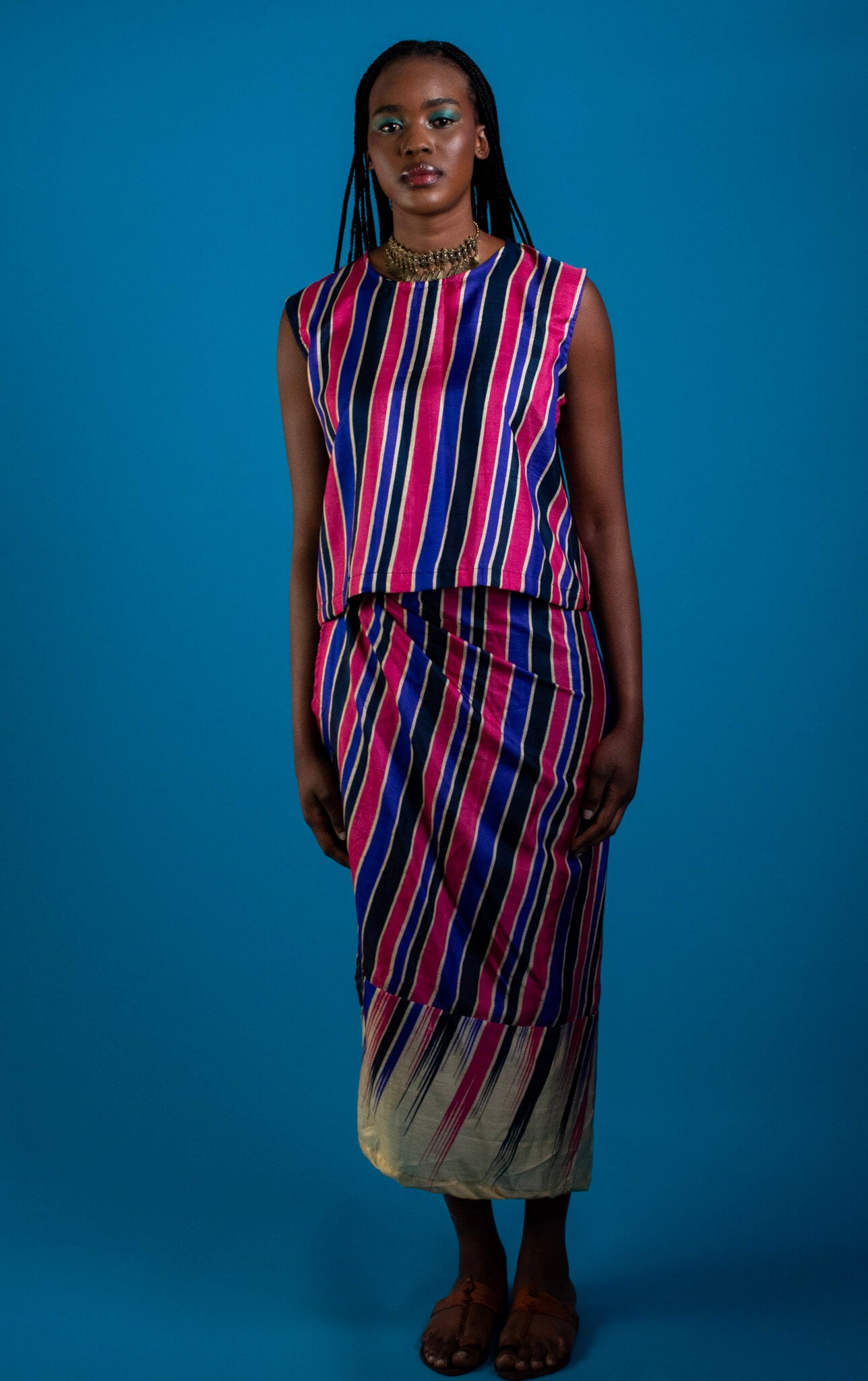 Inspired by Iman Ganijee’s grandfather and the East African khanga, this piece honours the art of wrapping - a gesture of belonging that connects cultures across oceans. Handwoven Madras silk, striped with fine gold detailing, carries a legacy of trade and transformation.