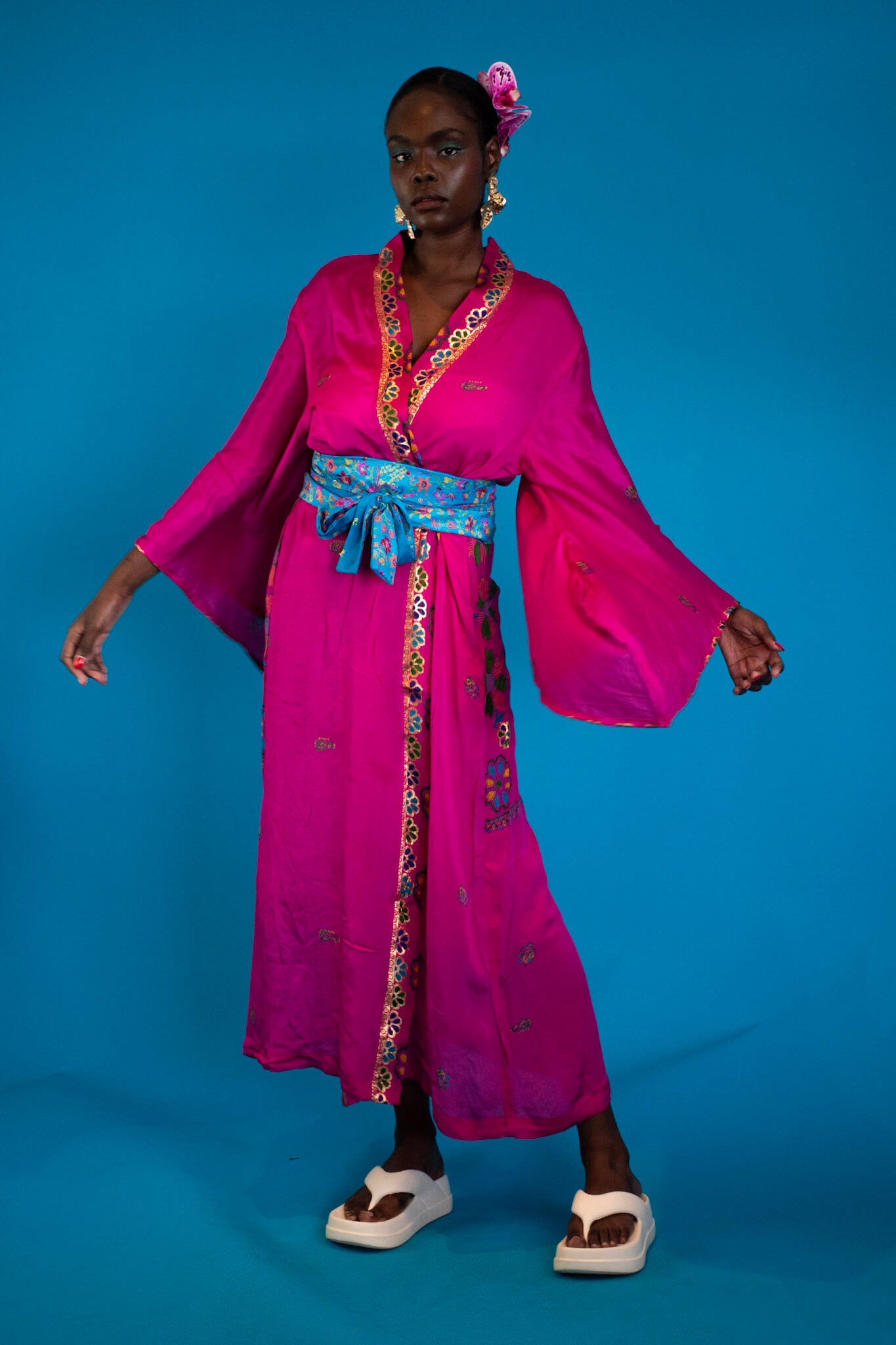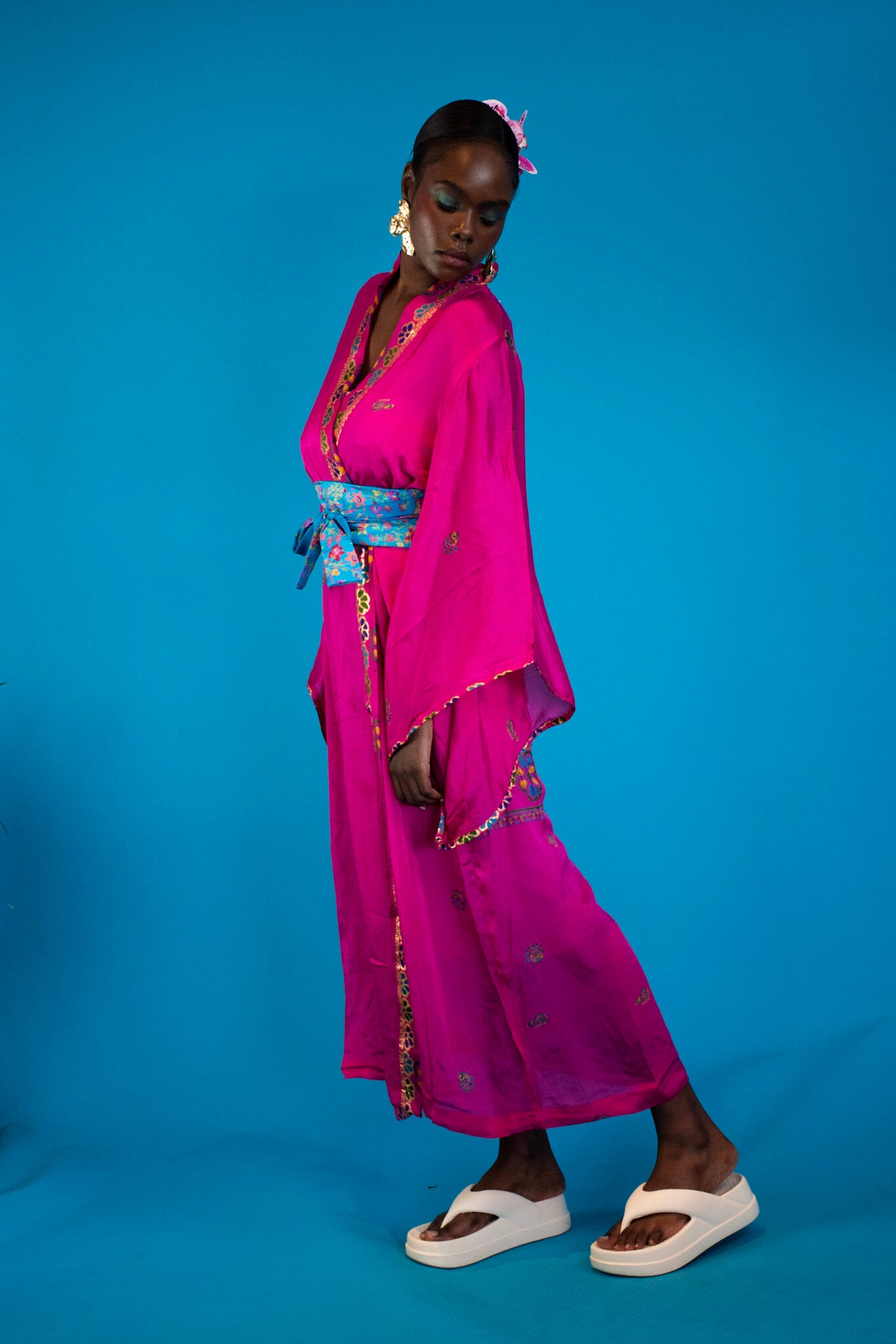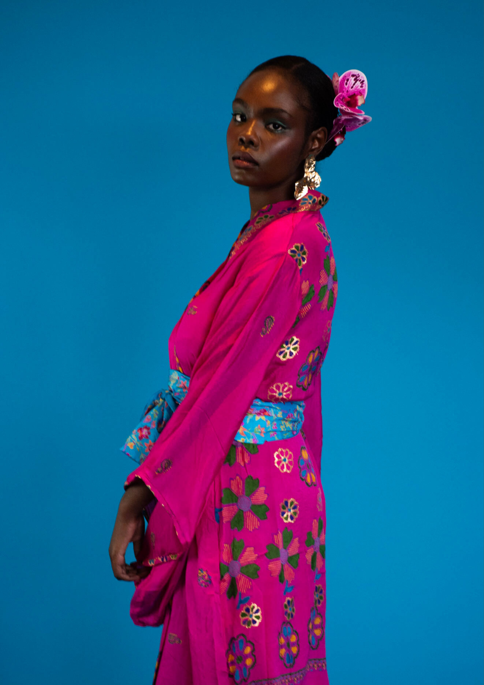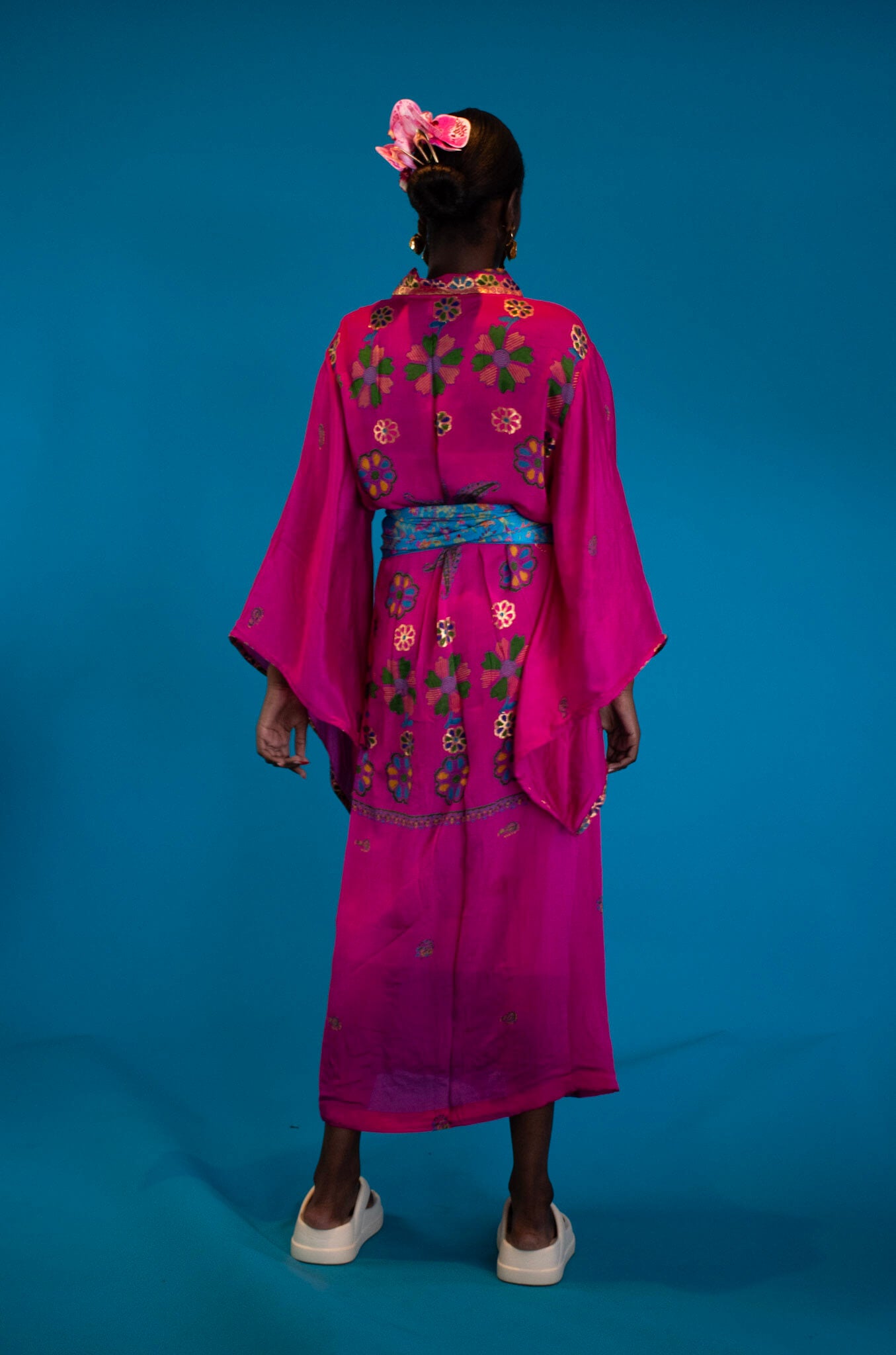 Inspired by the elegance of the Japanese kimono, this piece reimagines tradition through the lens of Indian textile artistry. In the process, floral silk saris are carefully curated - each chosen for its fine, painterly motifs that echo the quiet grace of Japanese botanical art. The result is a conversation between two art forms: the fluid expressiveness of Indian florals meeting the refined minimalism of Japanese design.