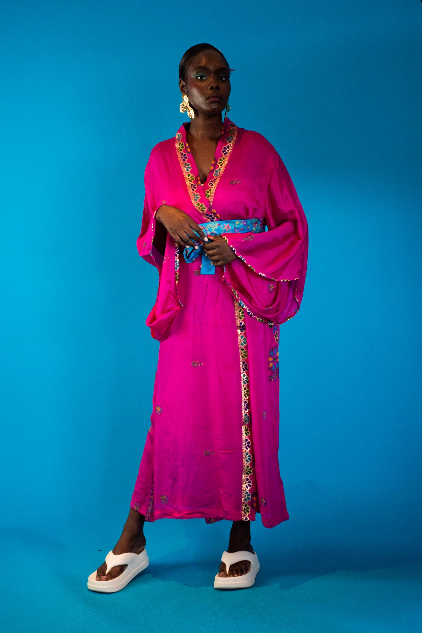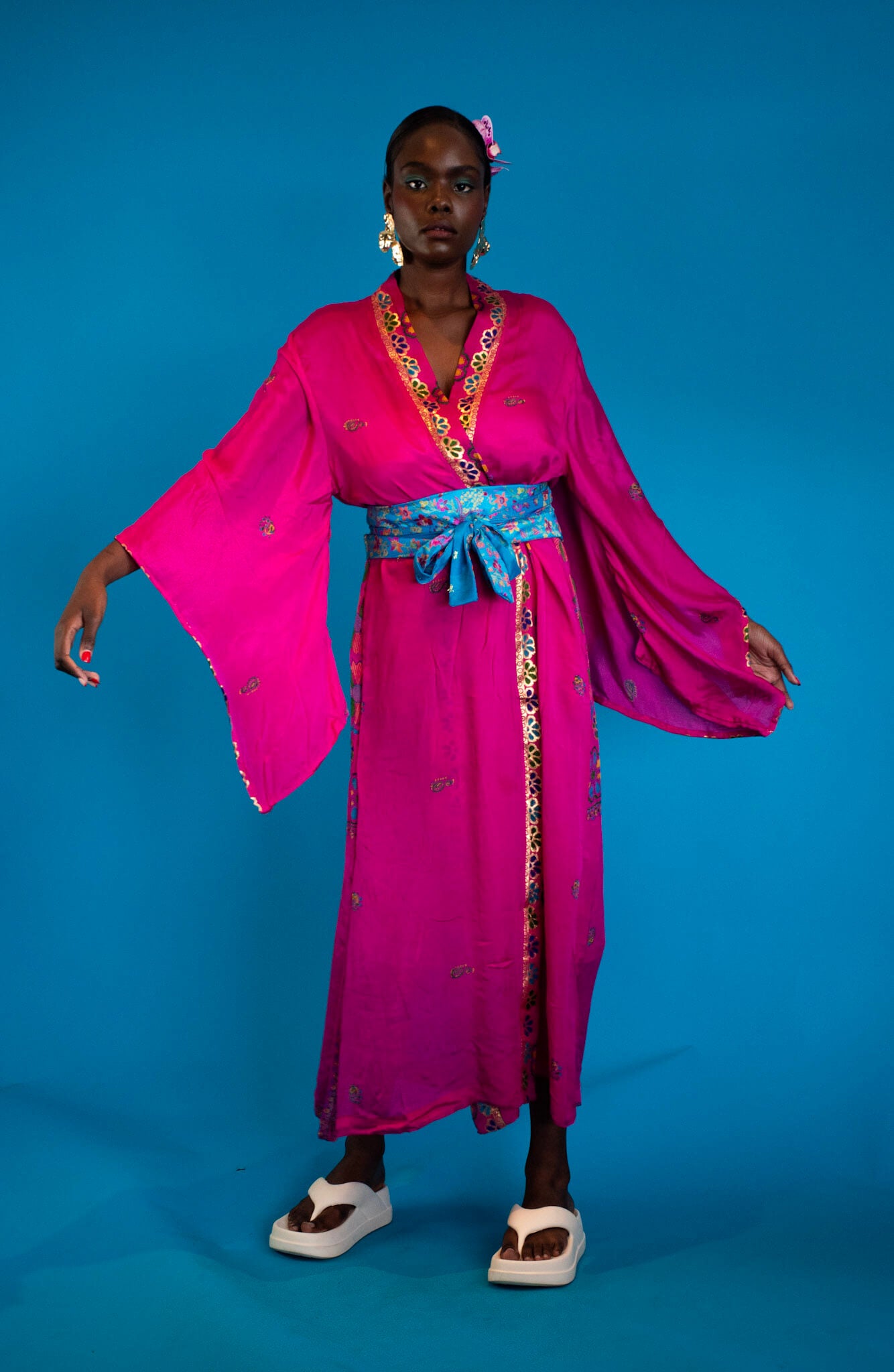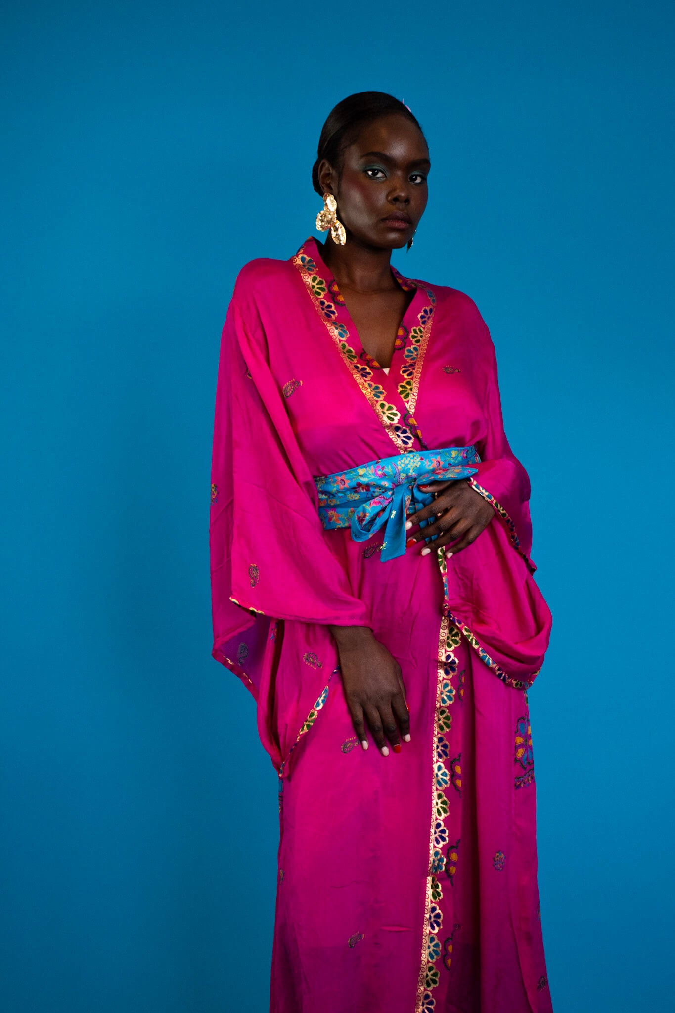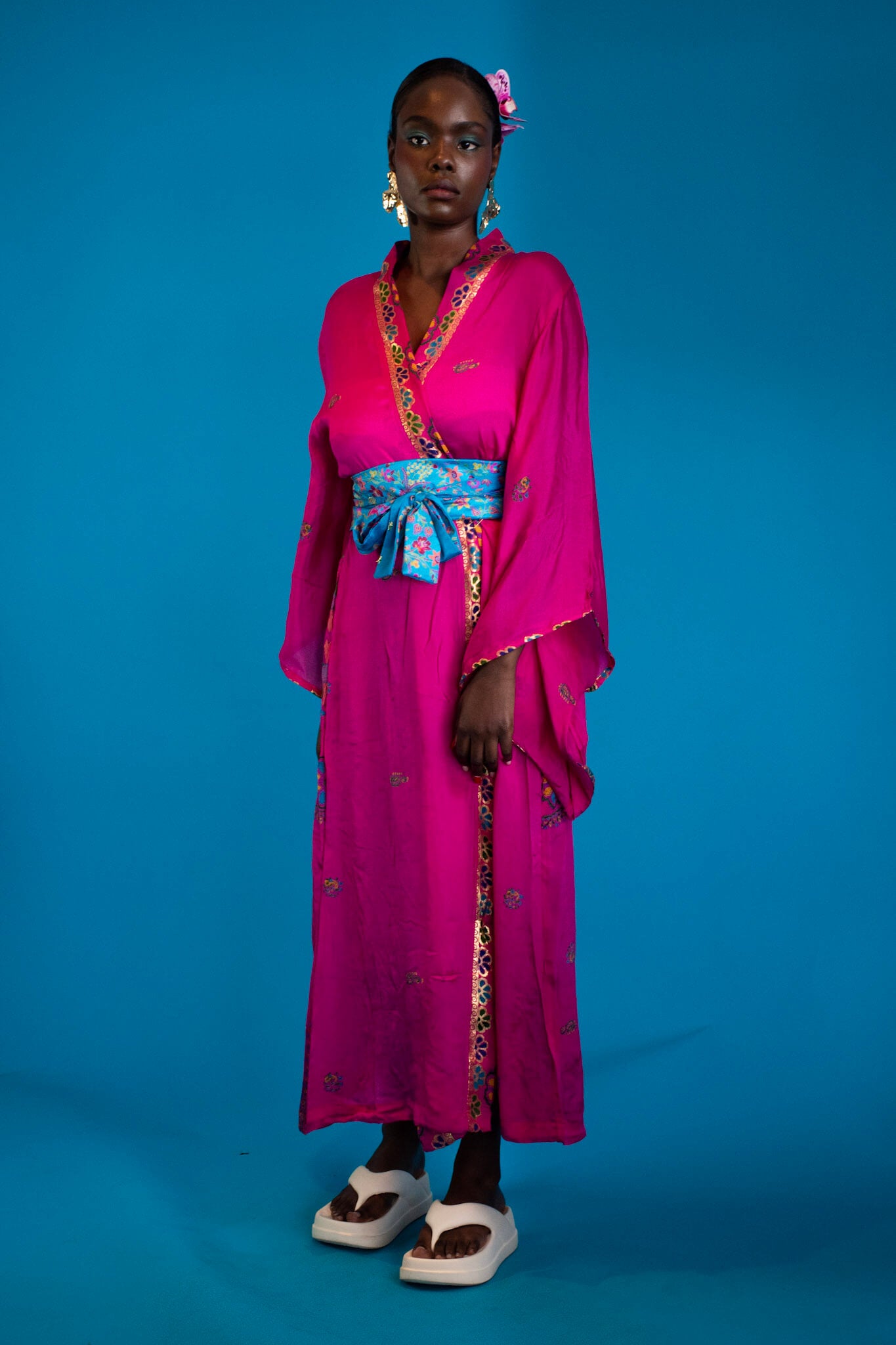 Inspired by the elegance of the Japanese kimono, this piece reimagines tradition through the lens of Indian textile artistry. In the process, floral silk saris are carefully curated - each chosen for its fine, painterly motifs that echo the quiet grace of Japanese botanical art. The result is a conversation between two art forms: the fluid expressiveness of Indian florals meeting the refined minimalism of Japanese design.