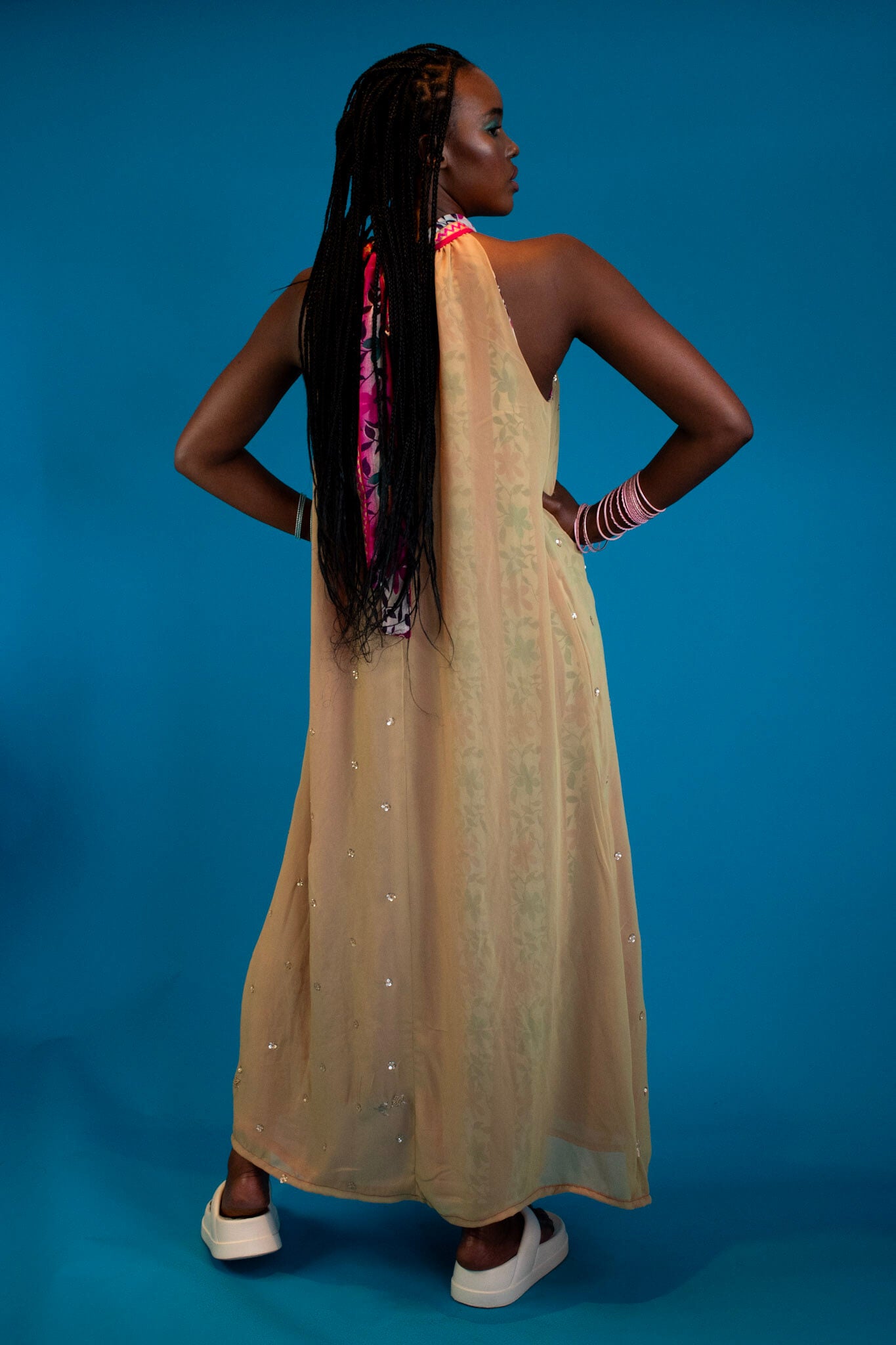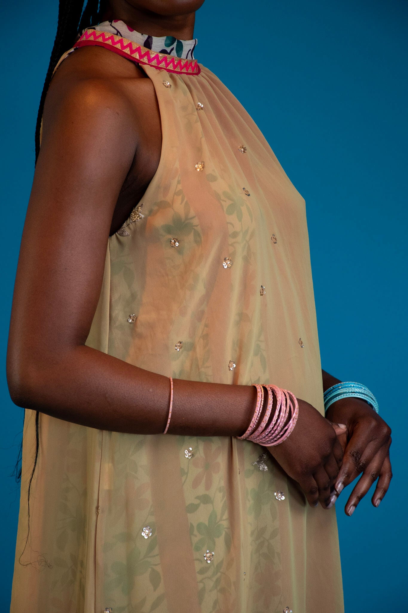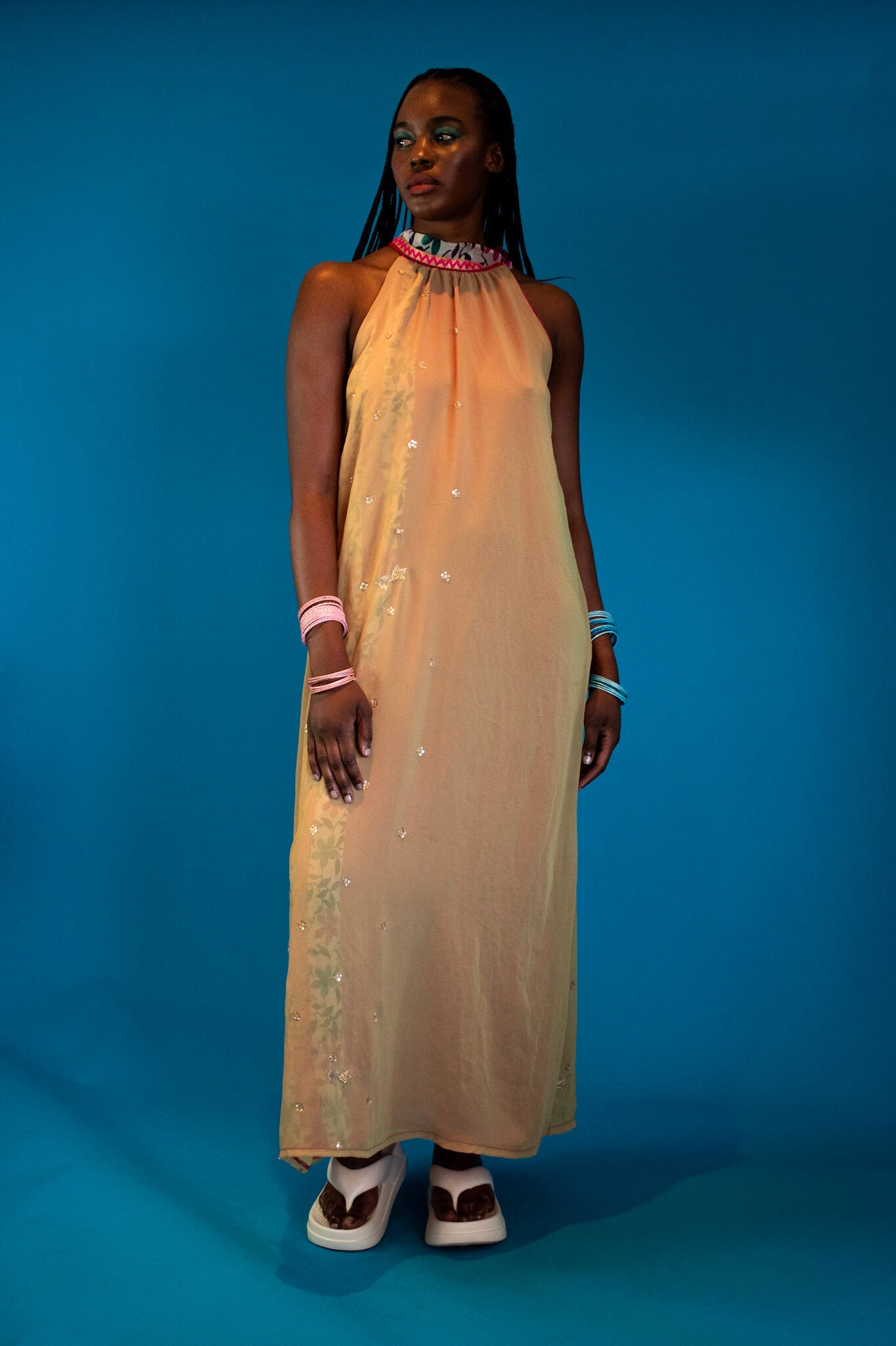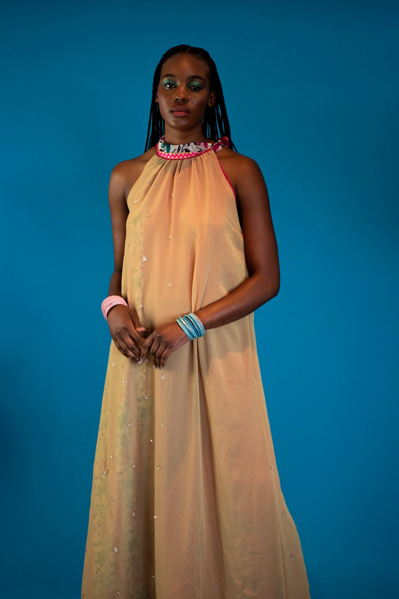 A celebration of colour and light, this halter neck chiffon reversible dress captures the dream of endless summer. Crafted from printed chiffon and reverse-beaded detailing, each piece shimmers softly as you move - a touch of glam woven into effortless ease.