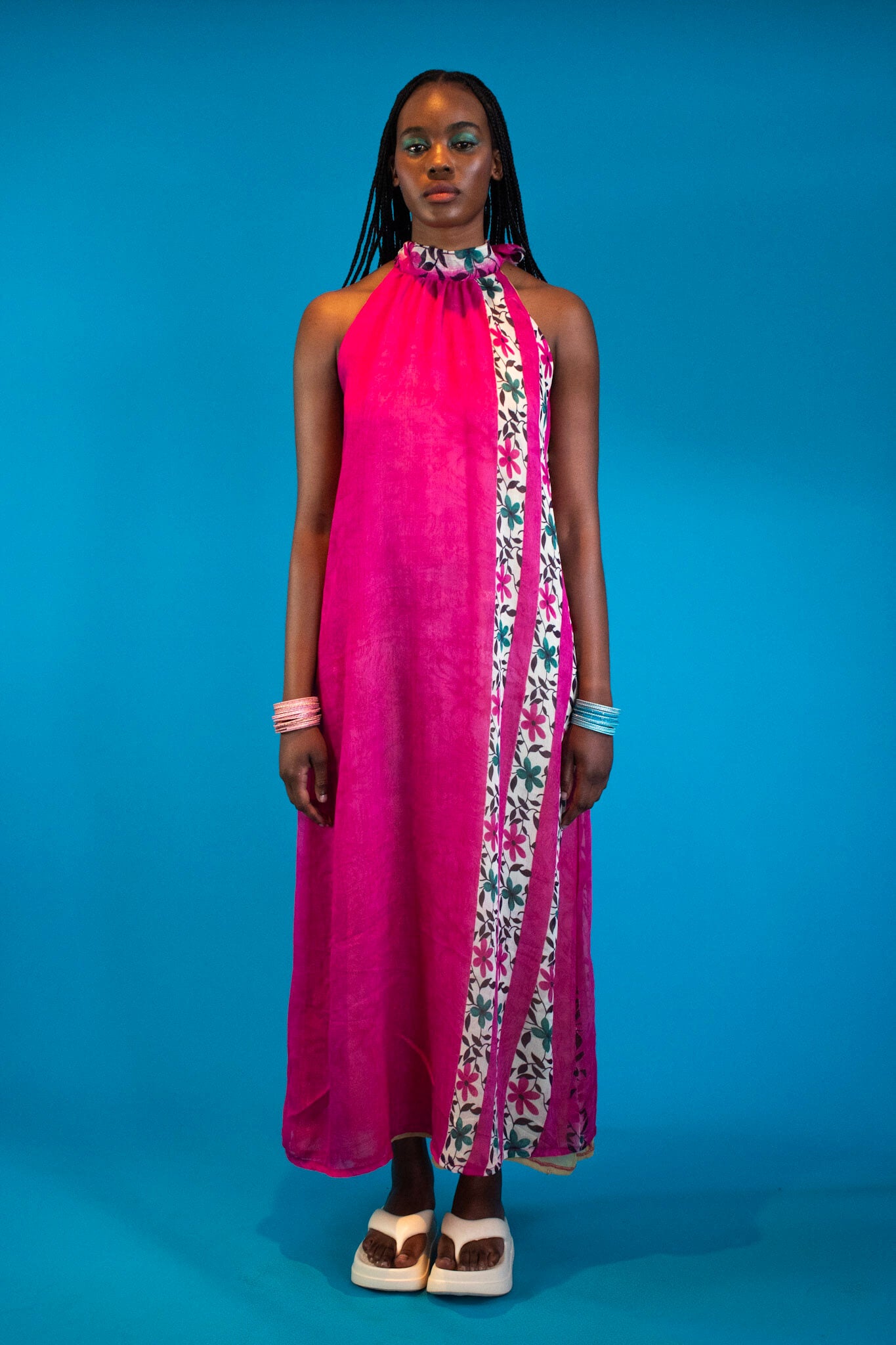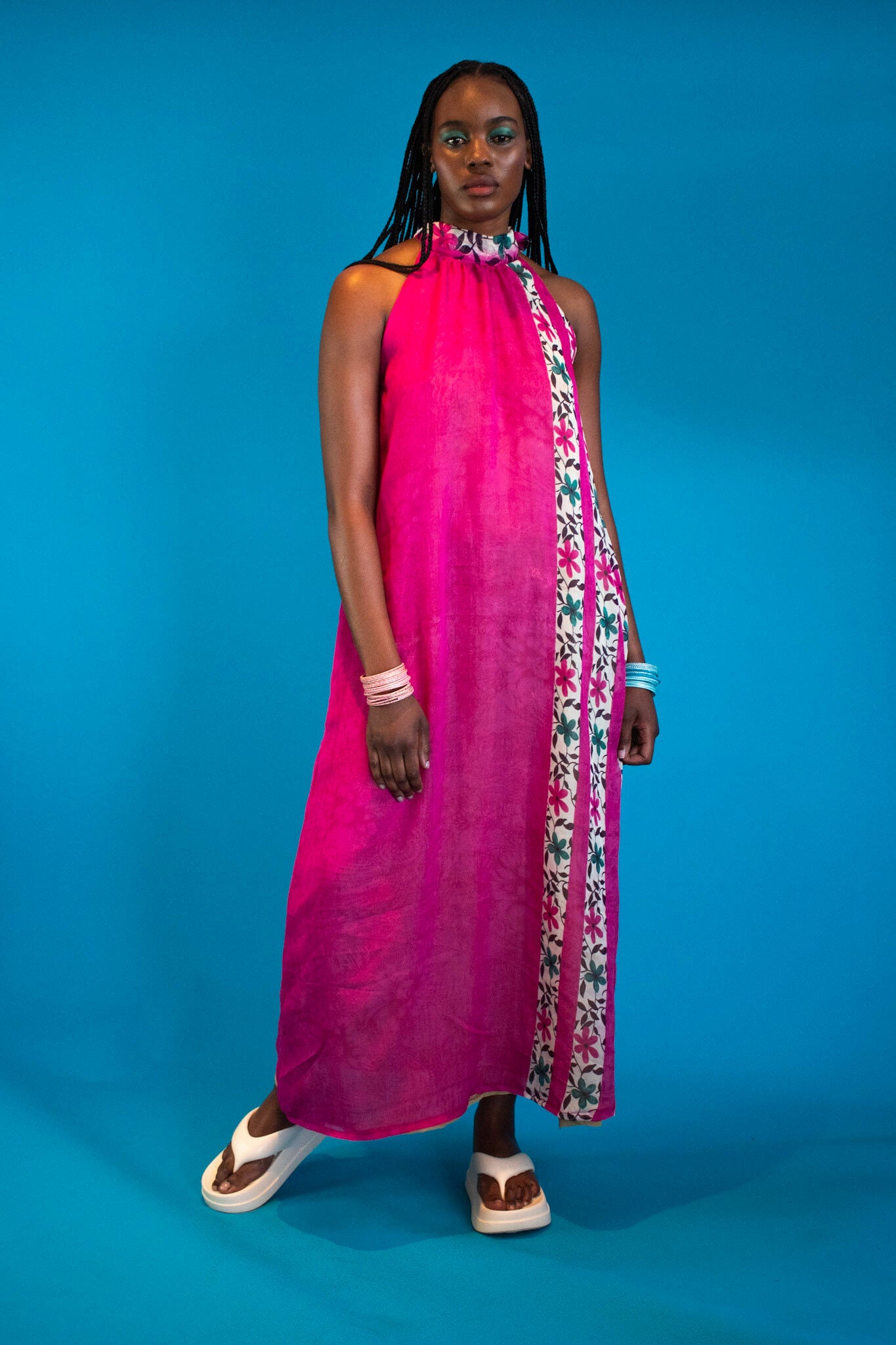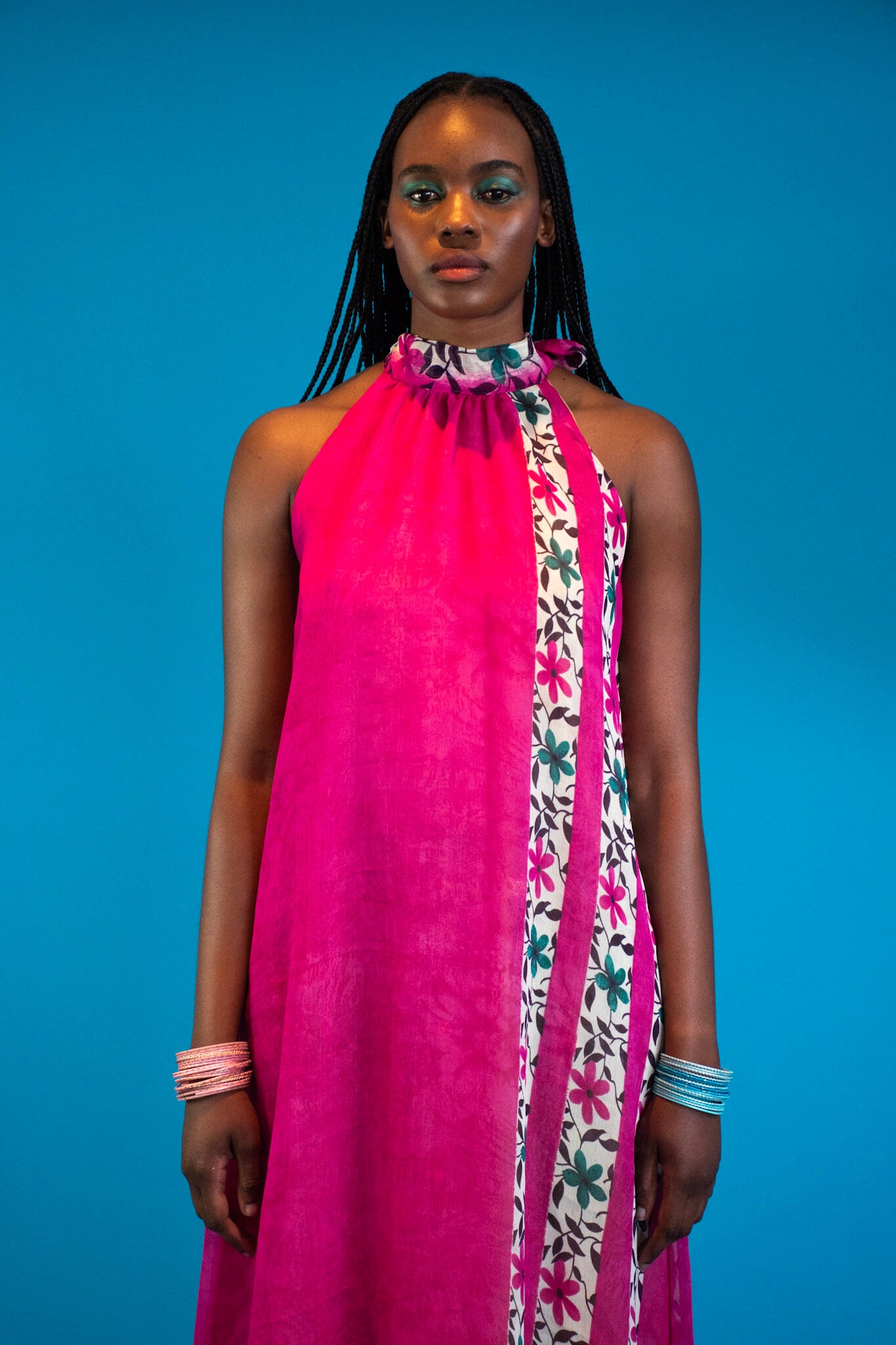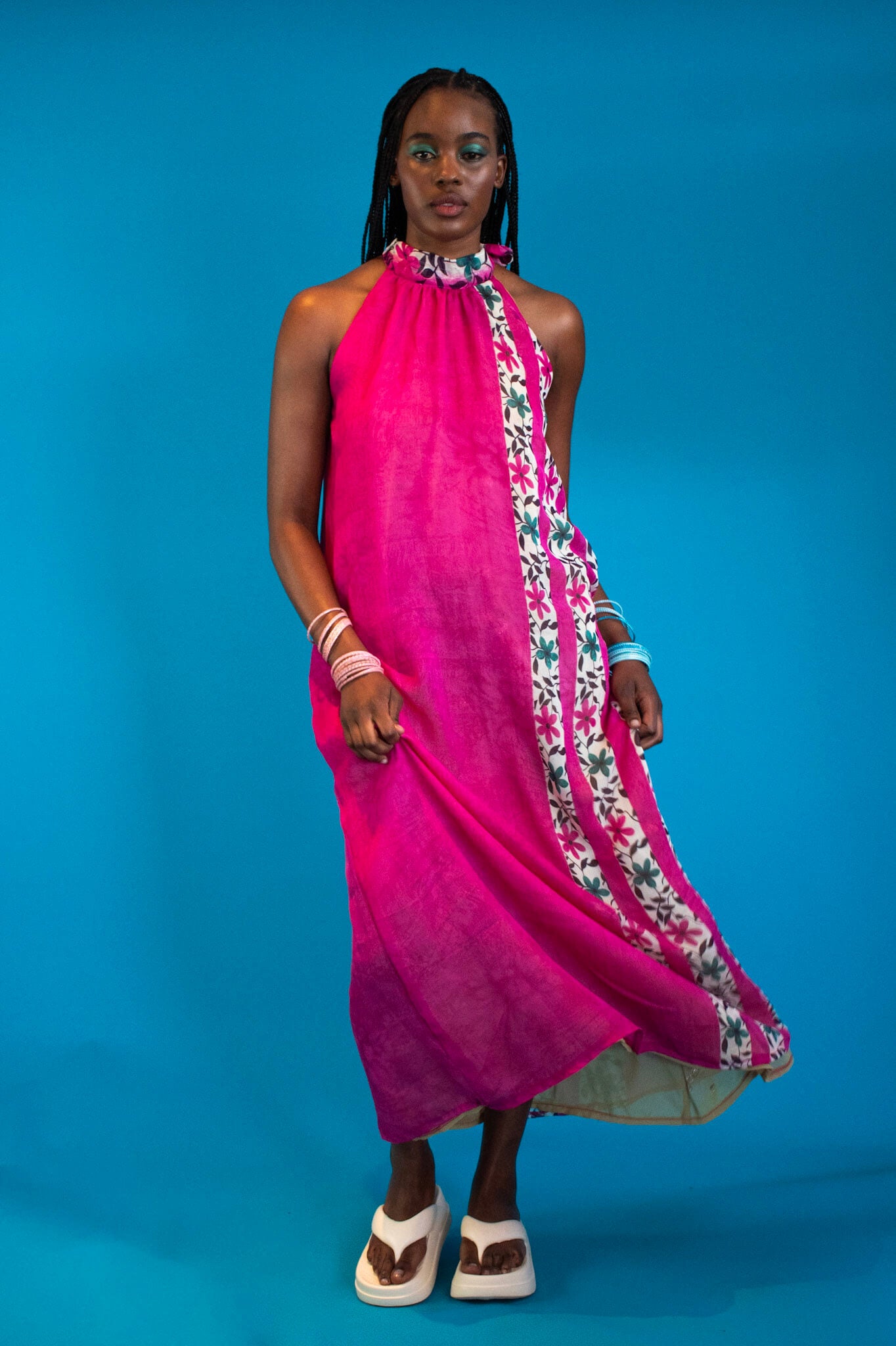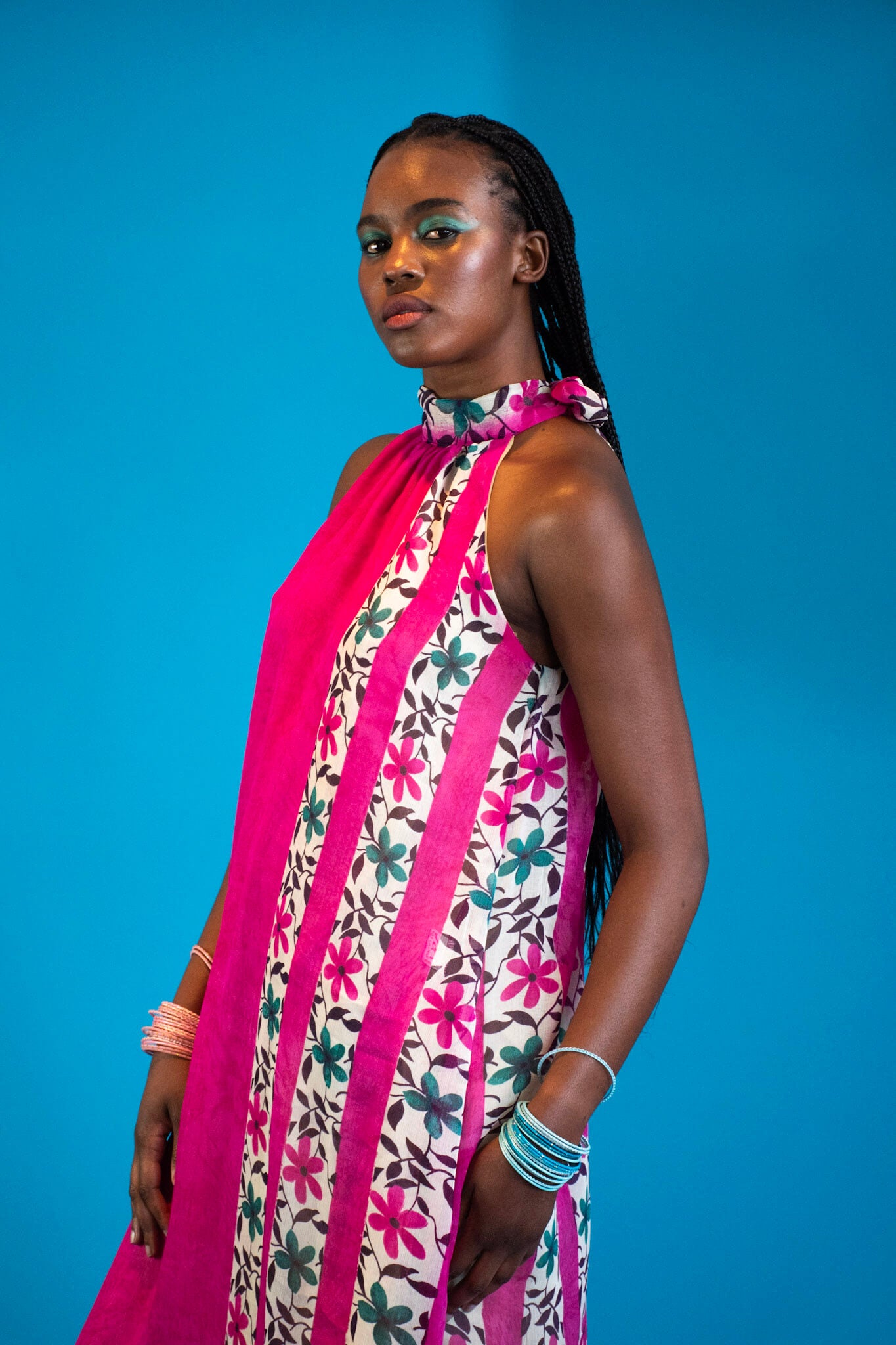 The silhouette is sleek yet fluid, tying gently at the neck and cascading into airy layers that breathe with warm weather. Vibrant, painterly prints bloom across the fabric, evoking sun-washed afternoons, poolside afternoons, and golden-hour dinners.