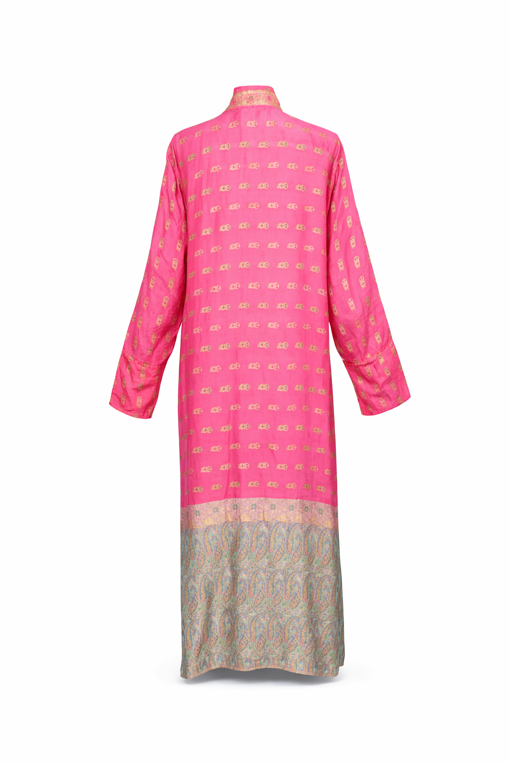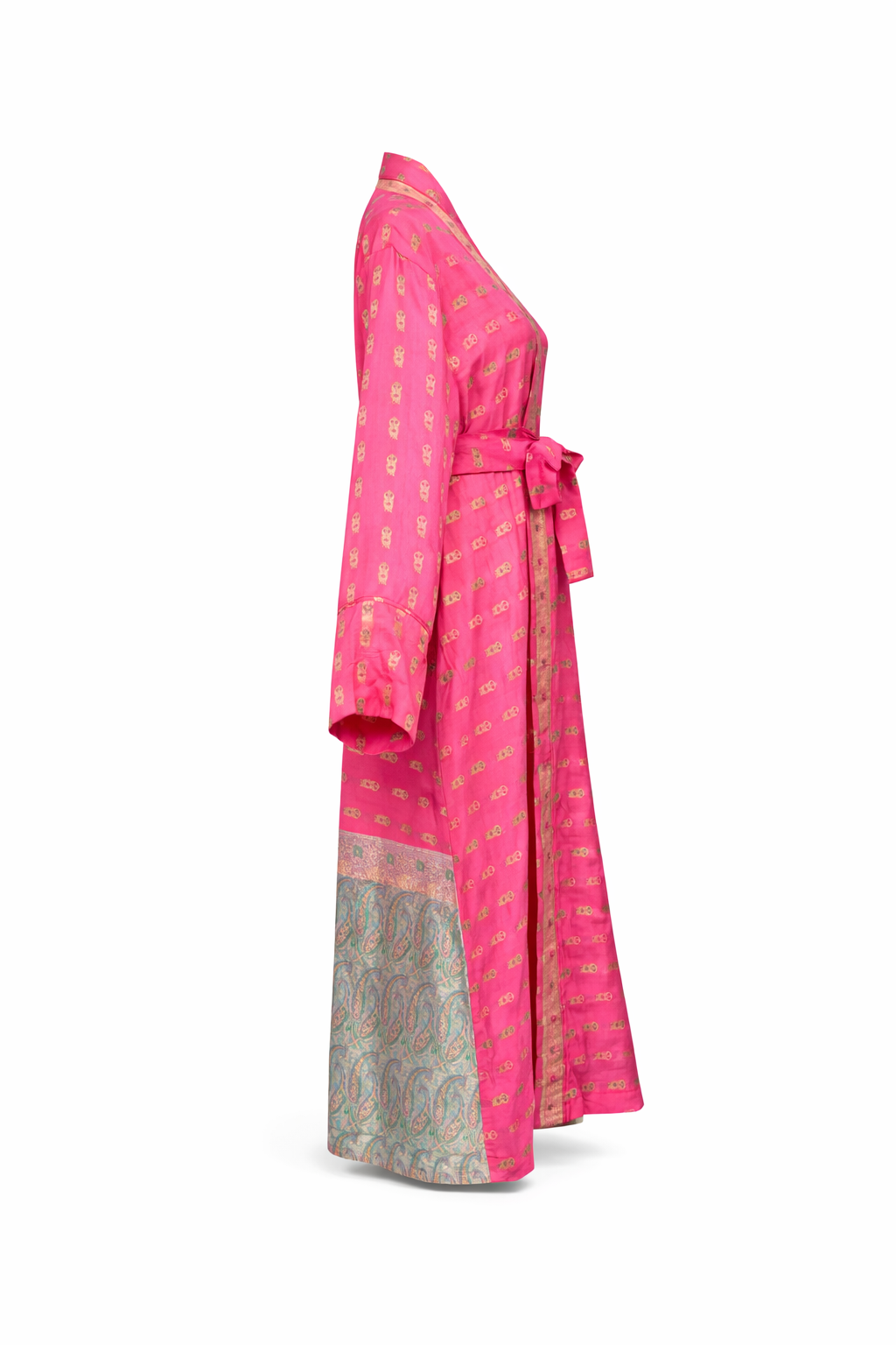 Crafted from richly textured Banarasi silk sari, this kimono carries a sense of ceremony and strength. The fabric is thicker and more structured than traditional silk, giving it a sculptural, outerwear feel while still allowing fluid movement. A vivid rose-pink base is illuminated with gold embroidery, woven into the silk itself so it shimmers softly as it catches the light.